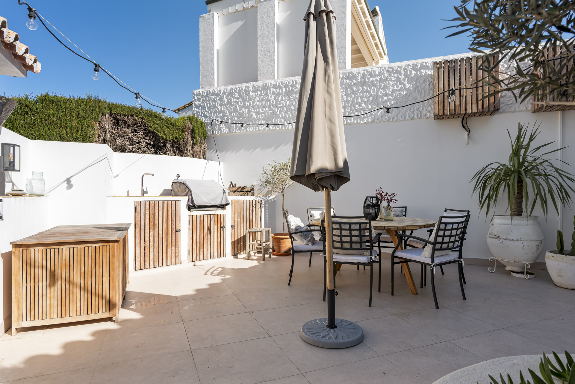 Nyd fornøjelserne ved udendørs liv med flere terrasser, der i alt udgør et areal på 65m2 og en privat have, som giver rigelig plads til afslapning og leg. Gasgrillen på den ydre terrasse inviterer dig til at nyde lækre måltider under den middelhavsske sol eller stjerneklare himmel.
