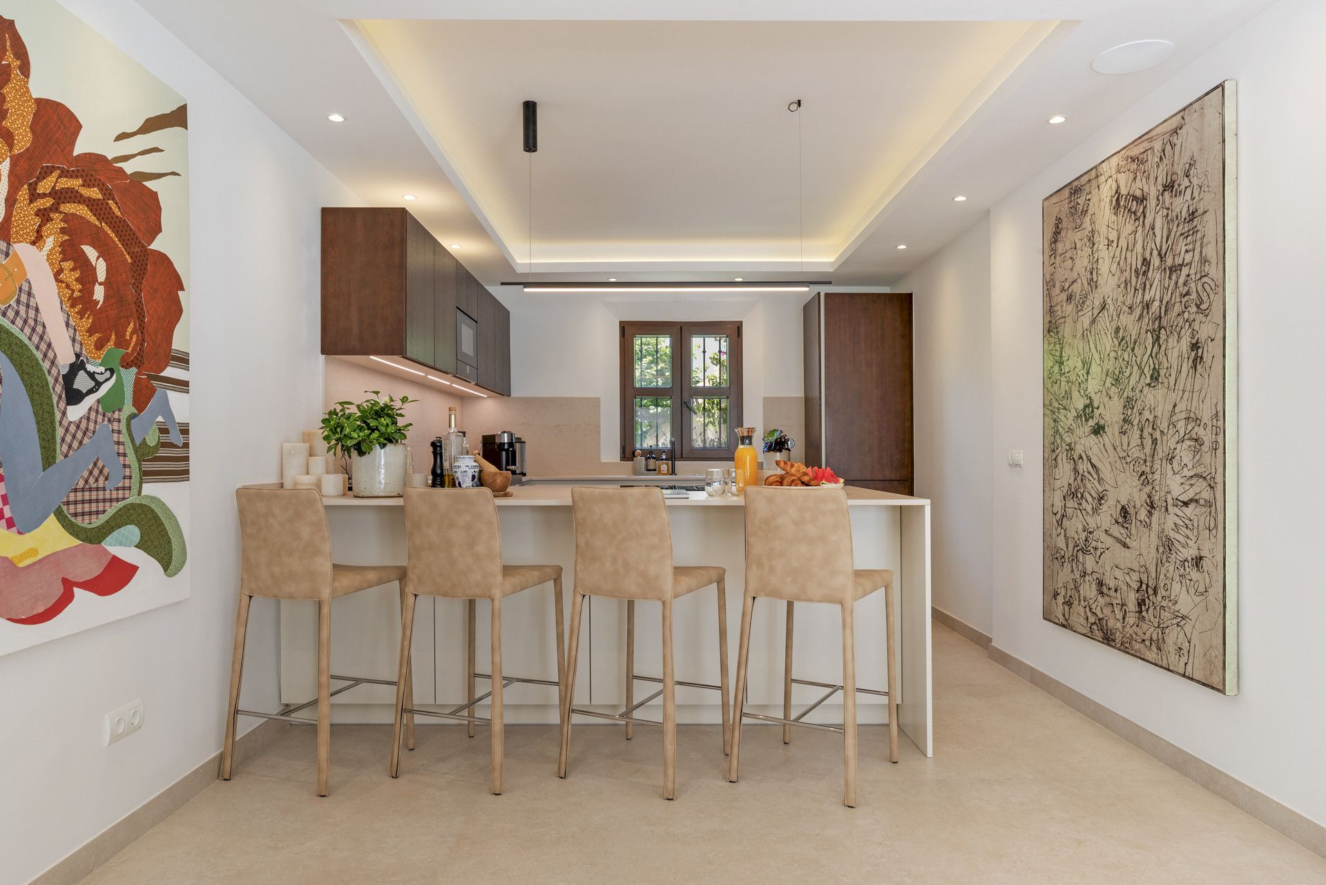 Indvendigt har ejendommen et fuldt udstyret moderne køkken med et vinkøleskab, designermøbler, kunstværker efter mål og en rummelig åben planløsning, der er perfekt til afslapning eller underholdning. Begge badeværelser er indrettet med dobbelte vaskestativer og luksuriøse regnbrusere, hvilket skaber en spa-lignende atmosfære, mens begge soveværelser er lyse, behagelige og stilfuldt indrettede. I hele hjemmet finder du aircondition, højhastigheds-WiFi og et Smart-TV for øget komfort og bekvemmelighed.