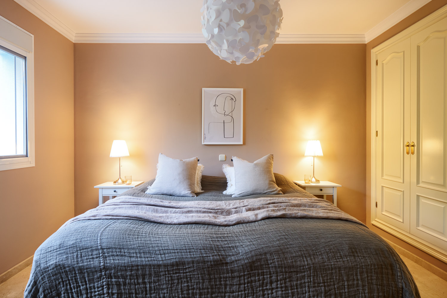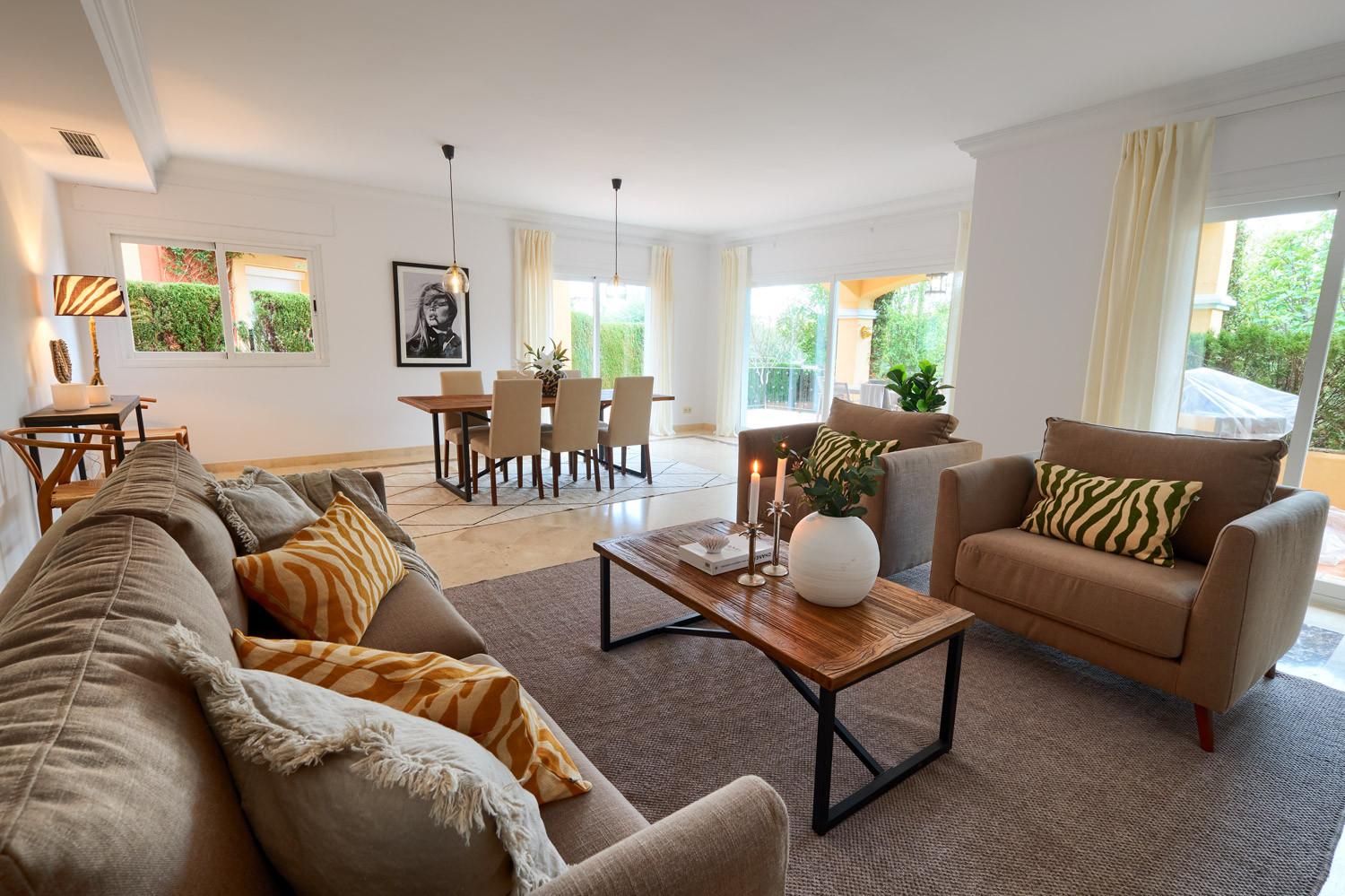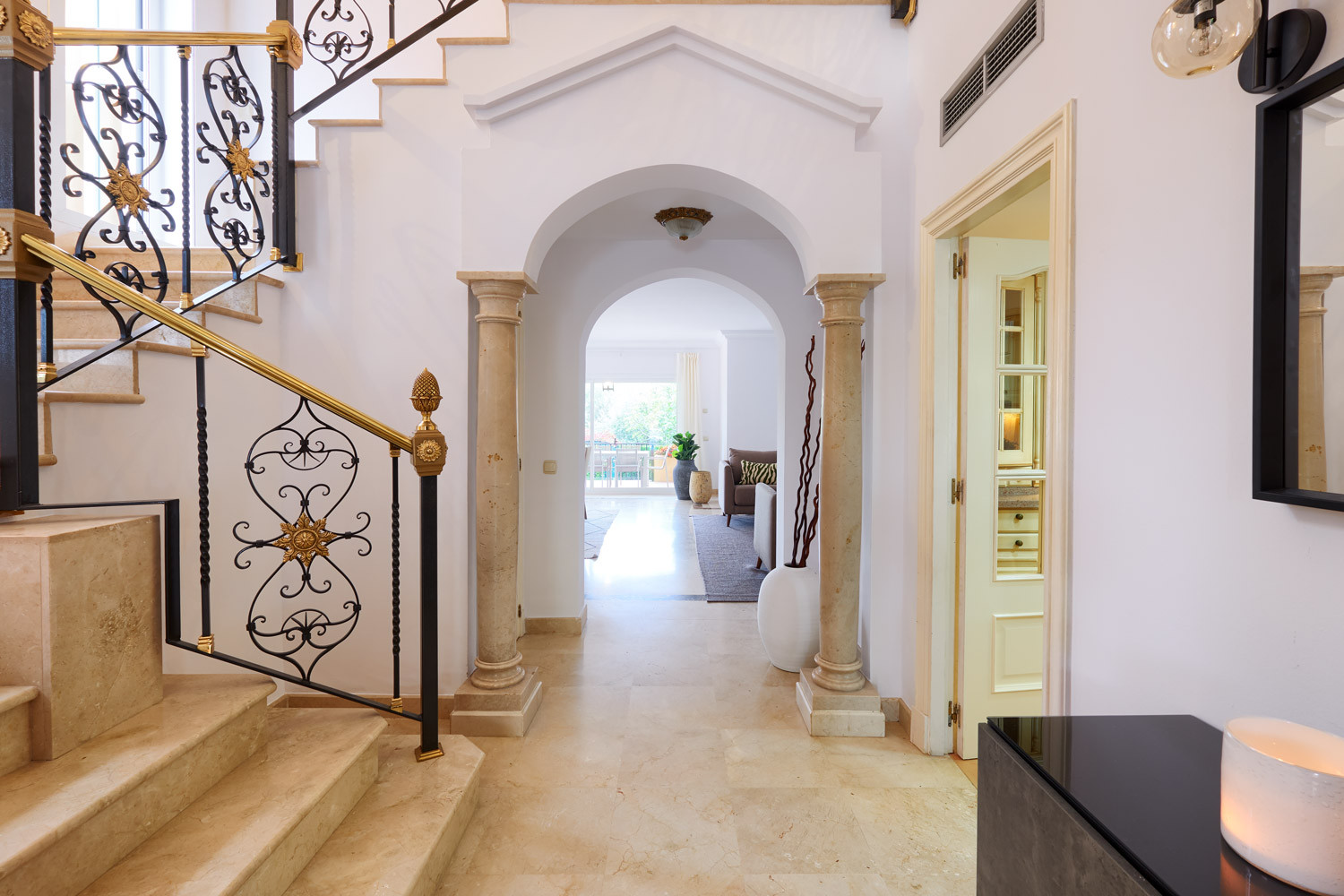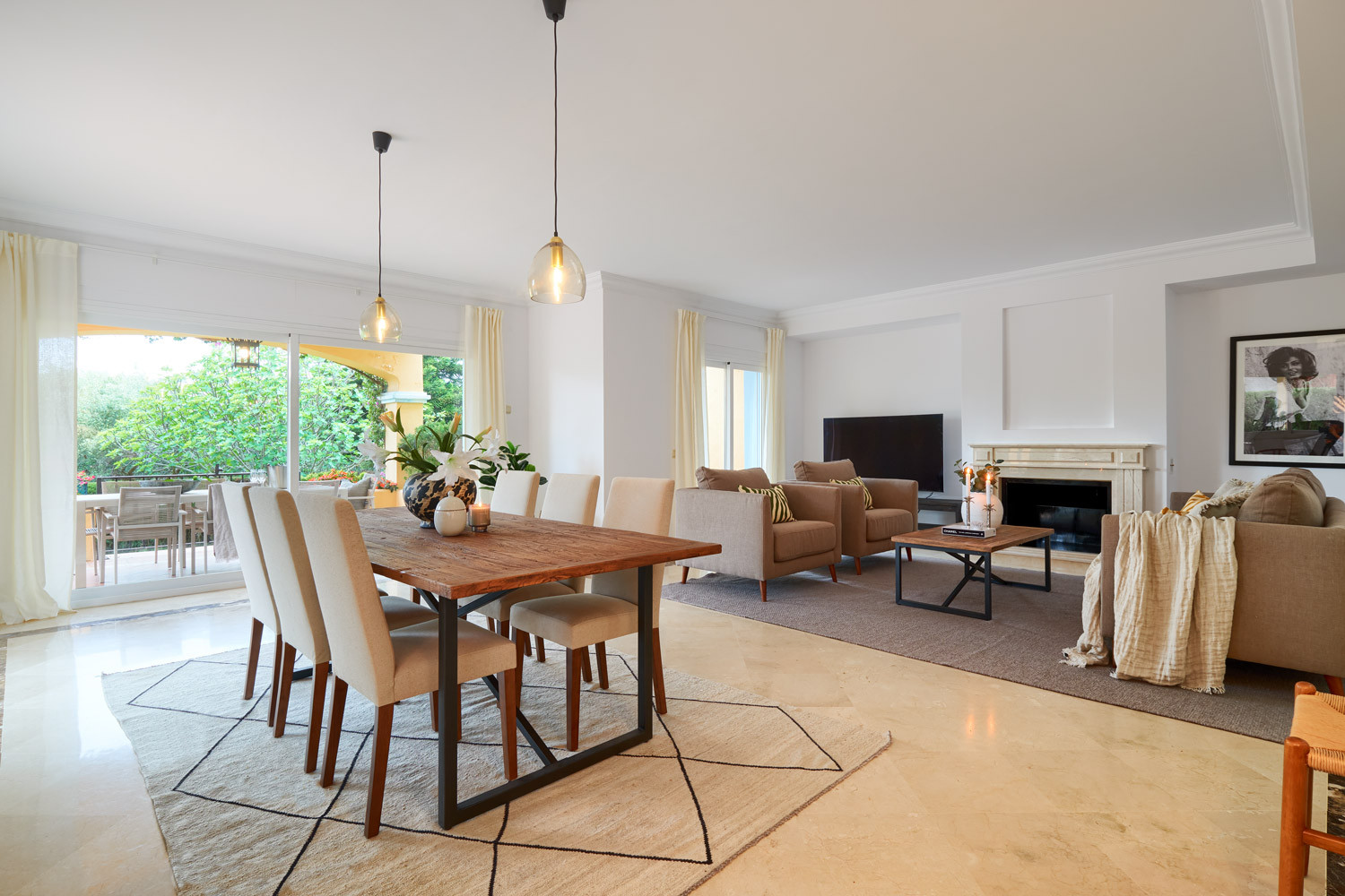 Dette byhus i andalusisk stil i Urbanización Alzambra, Nueva Andalucía, tilbyder en sømløs blanding af middelhavscharme og moderne skandinavisk-inspireret interiør. Neutrale toner, bløde teksturer og elegant indretning skaber en varm og indbydende atmosfære i hele dets 4 rummelige soveværelser og 3 badeværelser. Hvert soveværelse har indbyggede skabe og blødt sengetøj, mens den primære suite har en privat terrasse, perfekt til morgenkaffen eller aftenafslapning. Den åbne planløsning, badet i naturligt lys, forbinder ubesværet med det fuldt udstyrede køkken og spiseplads, suppleret med en hyggelig pejs og komfortable siddepladser, hvilket gør det ideelt til både korte og lange ophold.