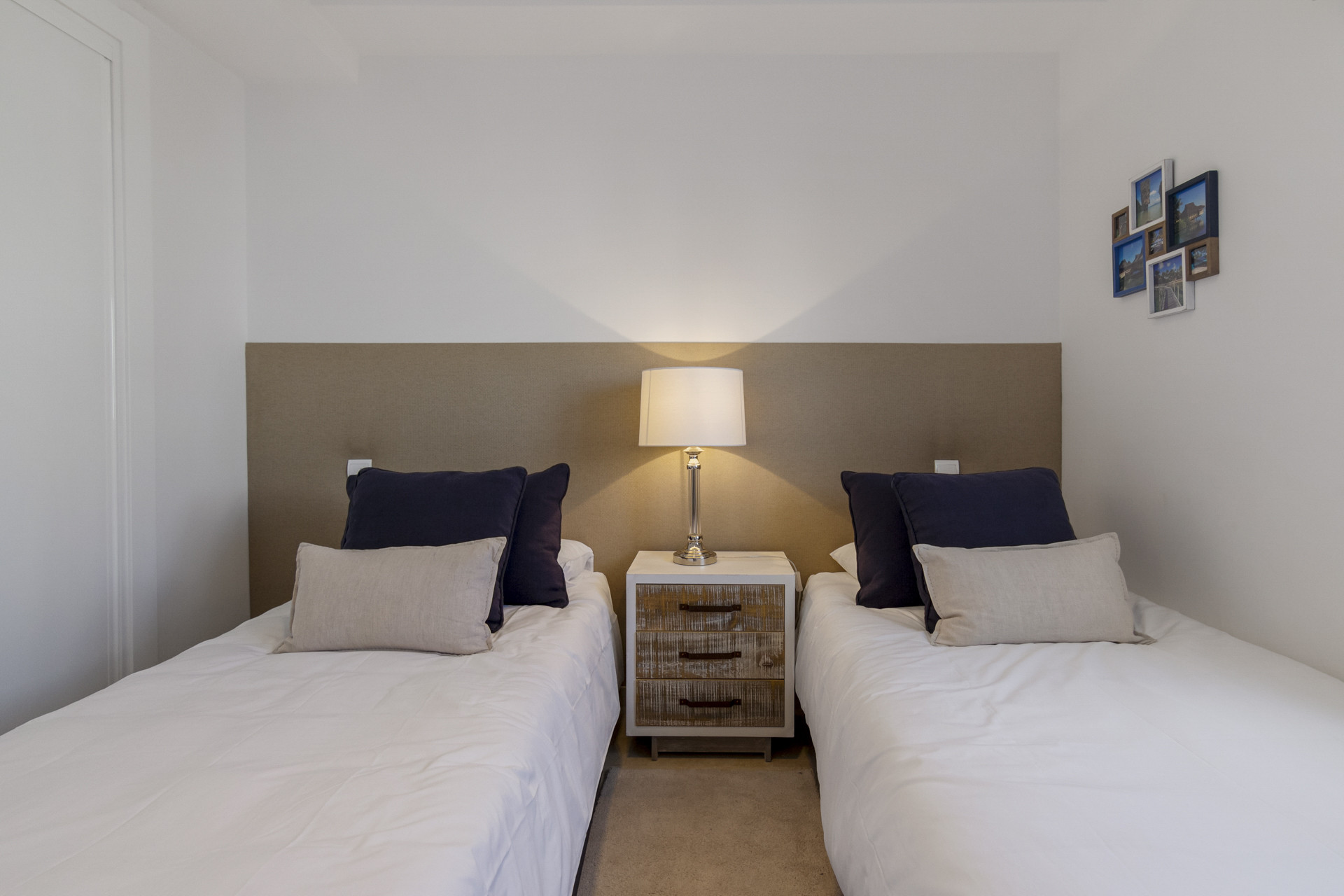 Den øverste etage huser alle tre soveværelser. Hovedsoveværelset inkluderer et tilknyttet badeværelse med en regndusj, TV og en privat balkon. Det andet soveværelse har en dobbeltseng, og det tredje soveværelse tilbyder også en dobbeltseng. Disse to værelser deler et moderne badeværelse med en walk-in shower.