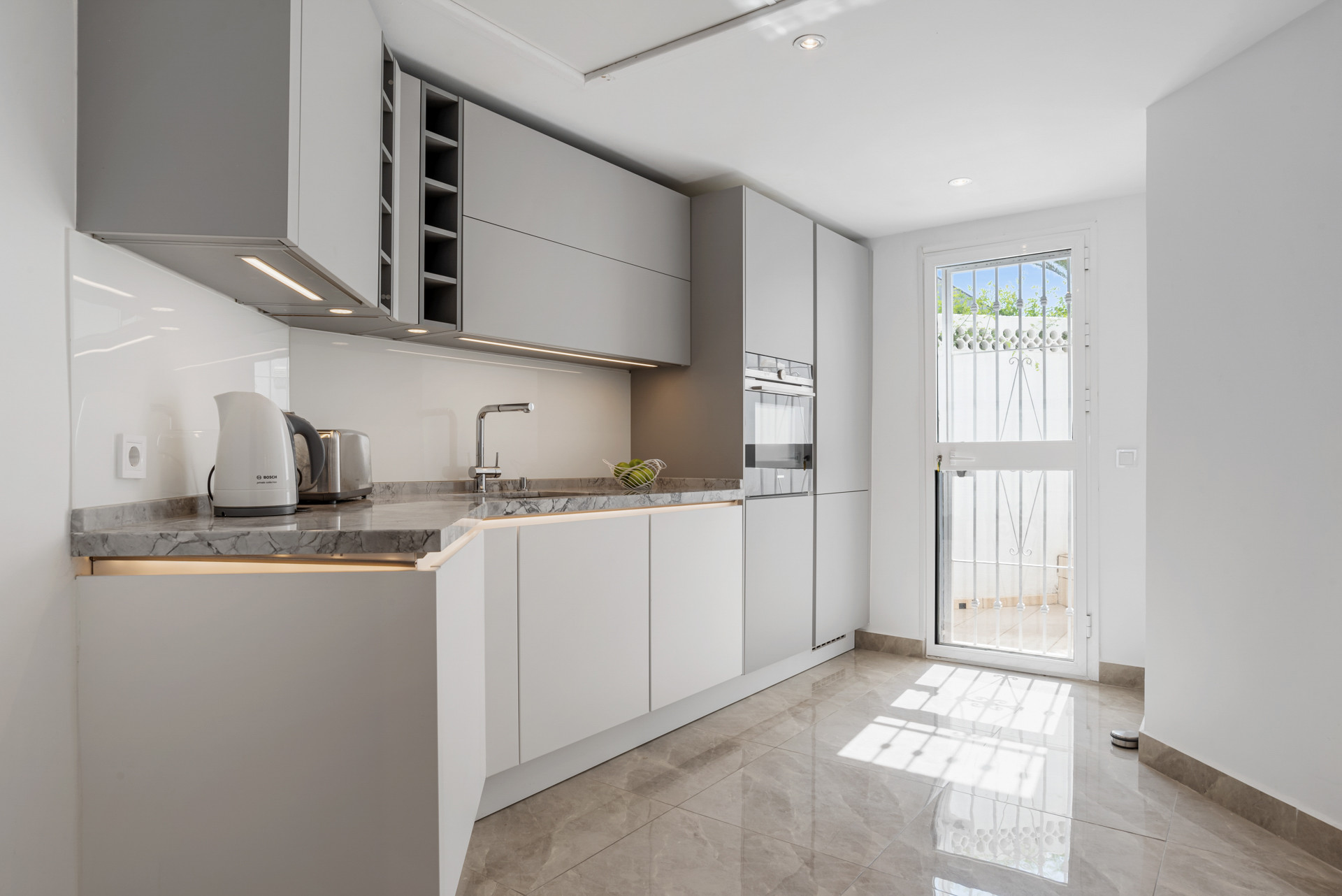 Indvendigt er ejendommen smagfuldt renoveret med et rent, moderne design. Det separate køkken er fuldt udstyret og færdiggjort i høj standard, mens det lyse opholdsrum åbner direkte ud til en rummelig privat terrasse - perfekt til udendørs spisning eller blot afslapning med panoramiske havudsigter. Begge badeværelser har elegante regnbrusere, der kombinerer komfort med et strejf af luksus.
