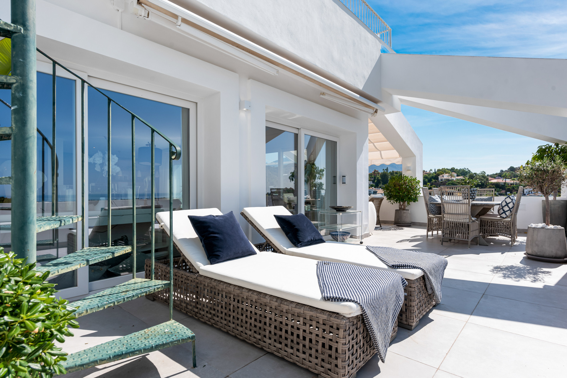Penthouse Los Olmos er en fantastisk, nyligt renoveret 3-værelses penthouse i det eftertragtede kvarter La Quinta med utrolige udsigter over La Concha og Middelhavet med de nordlige kyster af Afrika i baggrunden.