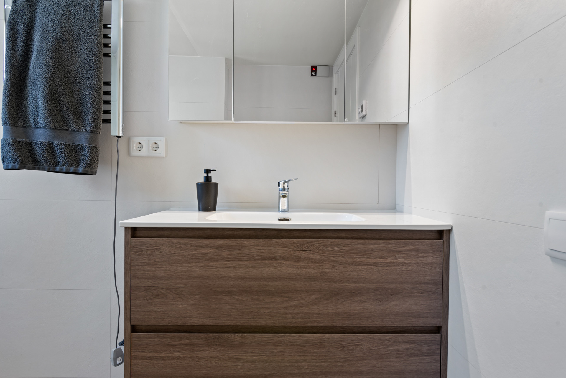 Indvendigt udsender hjemmet en rolig og moderne stemning. Det primære opholdsrum er rummeligt og fyldt med naturligt lys, med behagelige siddemuligheder, en spiseplads og store glasdøre, der fører ud til en solbeskinnet terrasse. Køkkenet er fuldt udstyret med moderne hårde hvidevarer og rigeligt plads til hjemmelavede måltider. Alle tre soveværelser er smagfuldt indrettet, hvor hovedsoveværelset har et tilstødende badeværelse, hvilket skaber en rolig og indbydende atmosfære, der er perfekt til både korte ophold og længere ophold.
