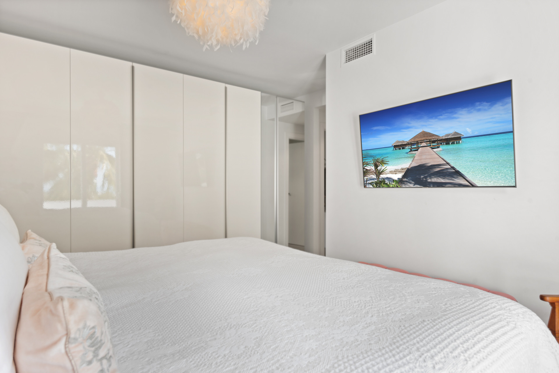 En åben korridor fører hen til hovedsoveværelset med et TV og et tilhørende badeværelse.