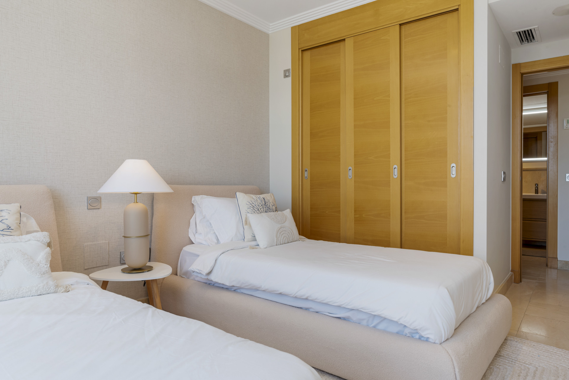 Soveværelset er indrettet med en dobbeltseng og har et tilhørende badeværelse med et brusebad og en separat bruseniche. Gæsteværelset er indrettet med 2 enkeltsenge og har adgang til gæstebadeværelset, som er udstyret med et badekar med en overliggende bruseanordning.