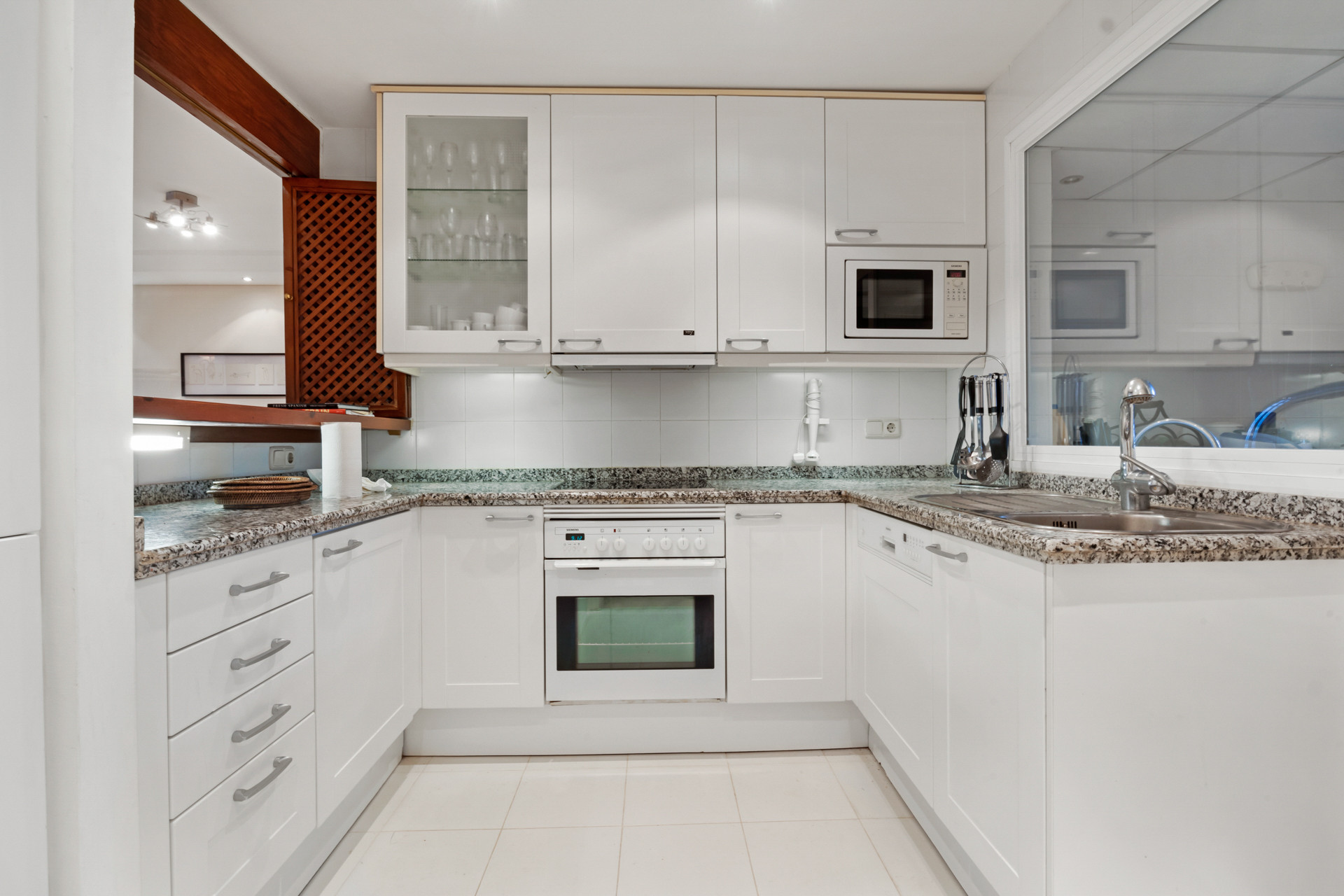 På 114 m² er lejligheden designet til ubesværet elegance. Det åbne planløsnings opholdsrum har specialfremstillet snedkerarbejde, et strømlinet fuldt udstyret køkken og en elektrisk pejs, der skaber en varm og indbydende atmosfære. En ekstra bioethanol-pejs på terrassen giver dig mulighed for at nyde havbrisen i hyggelig komfort, uanset årstiden. Gulv-til-loft glasdøre indrammer de betagende panoramiske udsigter og skaber en ubesværet overgang mellem indendørs og udendørs liv.