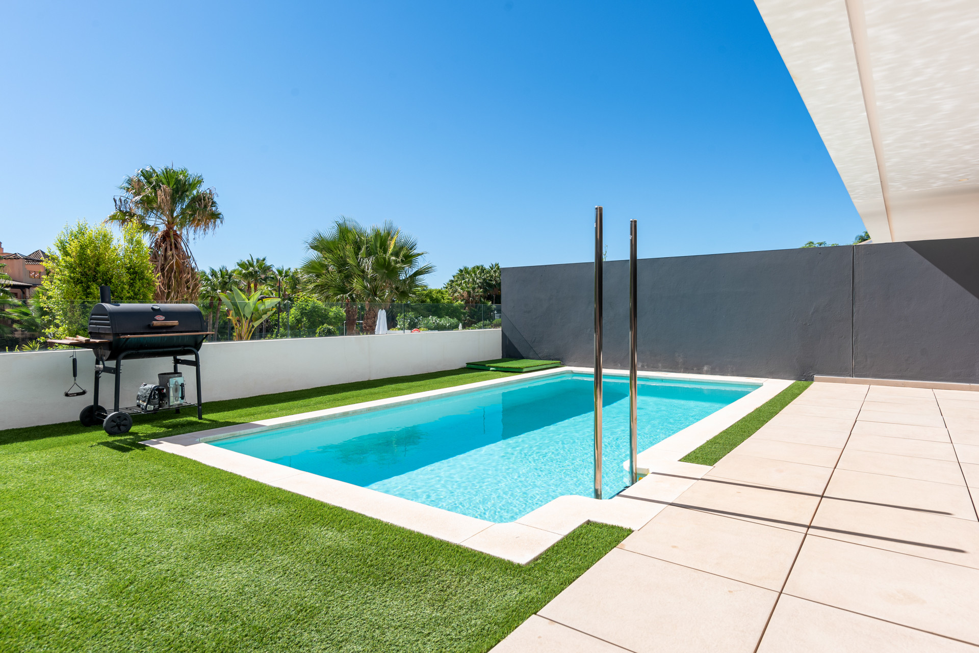 Tilbyder have, indhegnet grund, terrasse 20 m², vaskemaskine, grill, strygejern, internet (wifi), hårtørrer, fitnesscenter, alarm, spa, centralvarme, aircondition, swimming pool privat, garage og parkeringshus til den samme bygning, 3 fans, 3 Fjernsyn.