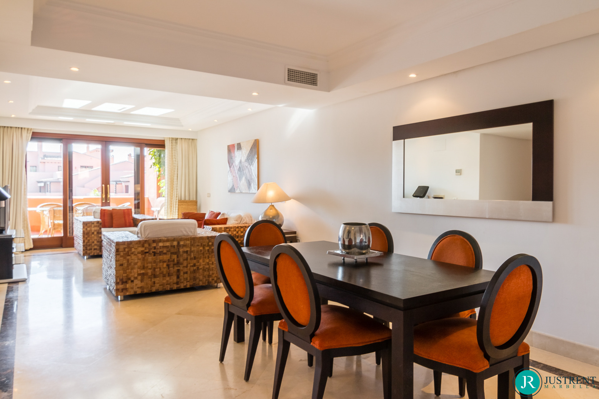 På 114 m² er lejligheden designet til ubesværet elegance. Det åbne planløsnings opholdsrum har specialfremstillet snedkerarbejde, et strømlinet fuldt udstyret køkken og en elektrisk pejs, der skaber en varm og indbydende atmosfære. En ekstra bioethanol-pejs på terrassen giver dig mulighed for at nyde havbrisen i hyggelig komfort, uanset årstiden. Gulv-til-loft glasdøre indrammer de betagende panoramiske udsigter og skaber en ubesværet overgang mellem indendørs og udendørs liv.