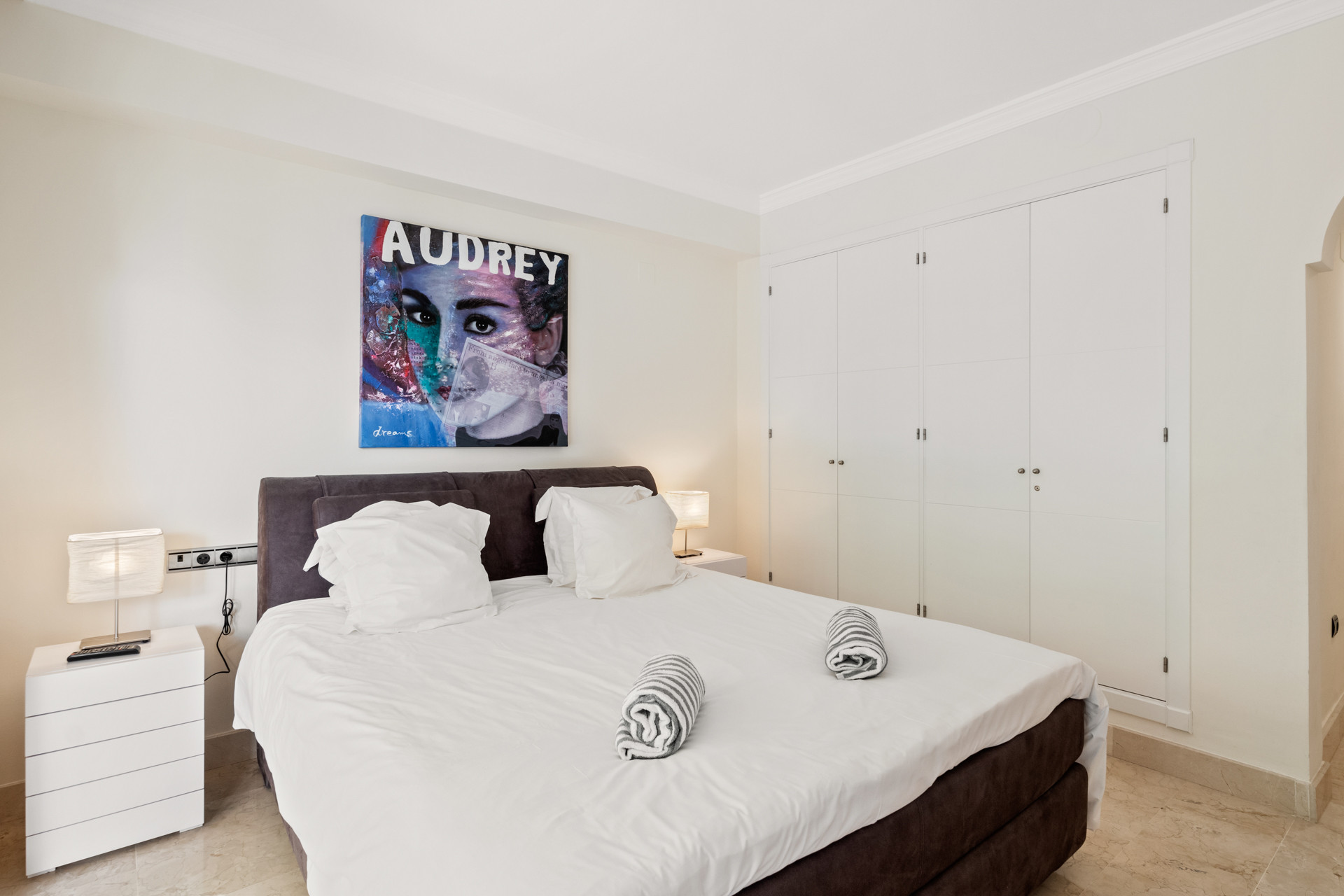 Velkommen til Casa Cielo! Casa Cielo er en smukt præsenteret 2-værelses, 1-badeværelses lejlighed i Aldea Blanca, som tilbyder moderne komfort i et af Nueva Andalucías mest eftertragtede lukkede boligområder. Lejligheden har en lys åben planløsning, hvor opholds-, spise- og køkkenområder flyder naturligt sammen og skaber et rummeligt og socialt miljø fyldt med naturligt lys. Store skydedøre forbinder interiøret direkte med terrassen og fremhæver den luftige stemning overalt. Et af soveværelserne smelter ubesværet ind i opholdsområdet og skaber et fleksibelt rum, der kan fungere som et ekstra loungeagtigt rum eller gæsteområde, samtidig med at lejlighedens åbne, moderne æstetik bevares. Varme trægulve og neutrale nuancer giver hjemmet en rolig, moderne atmosfære.