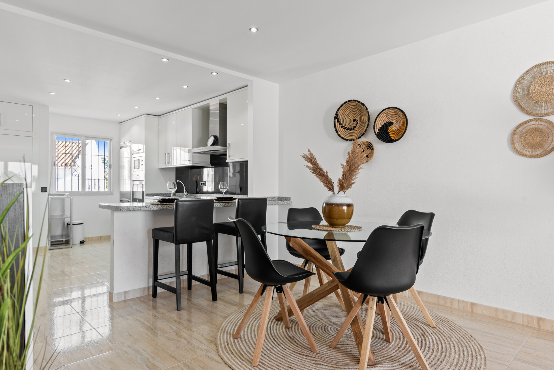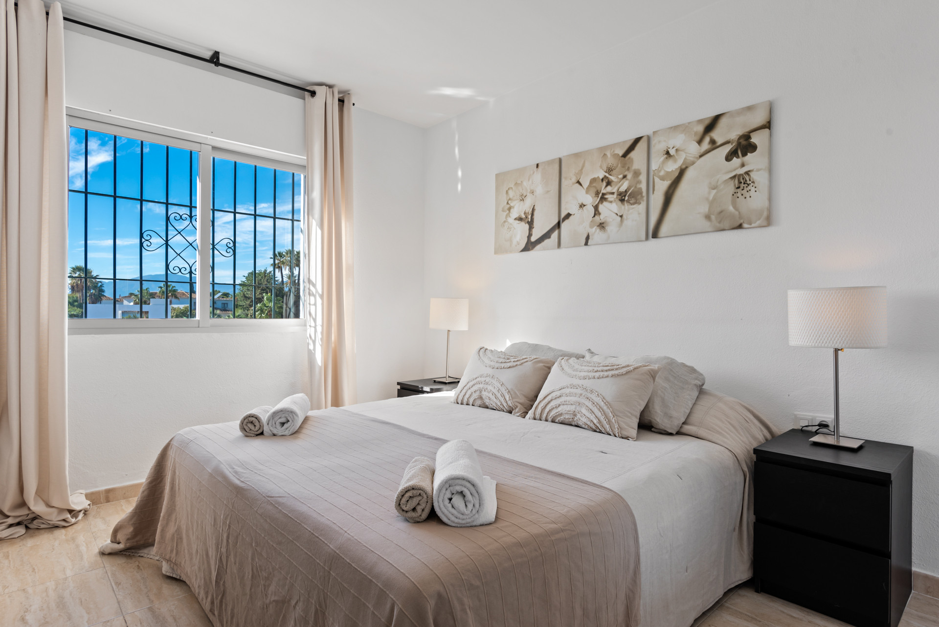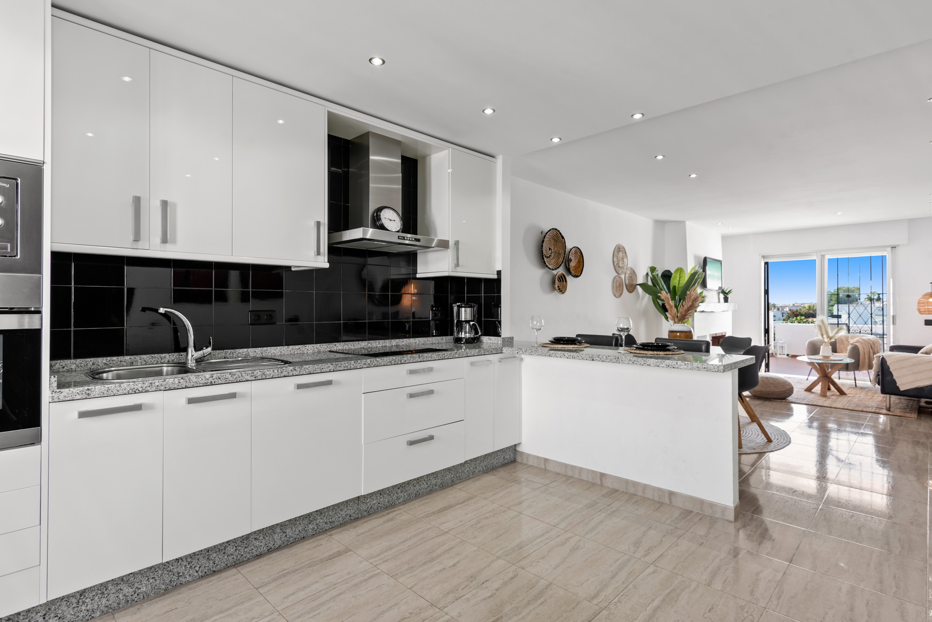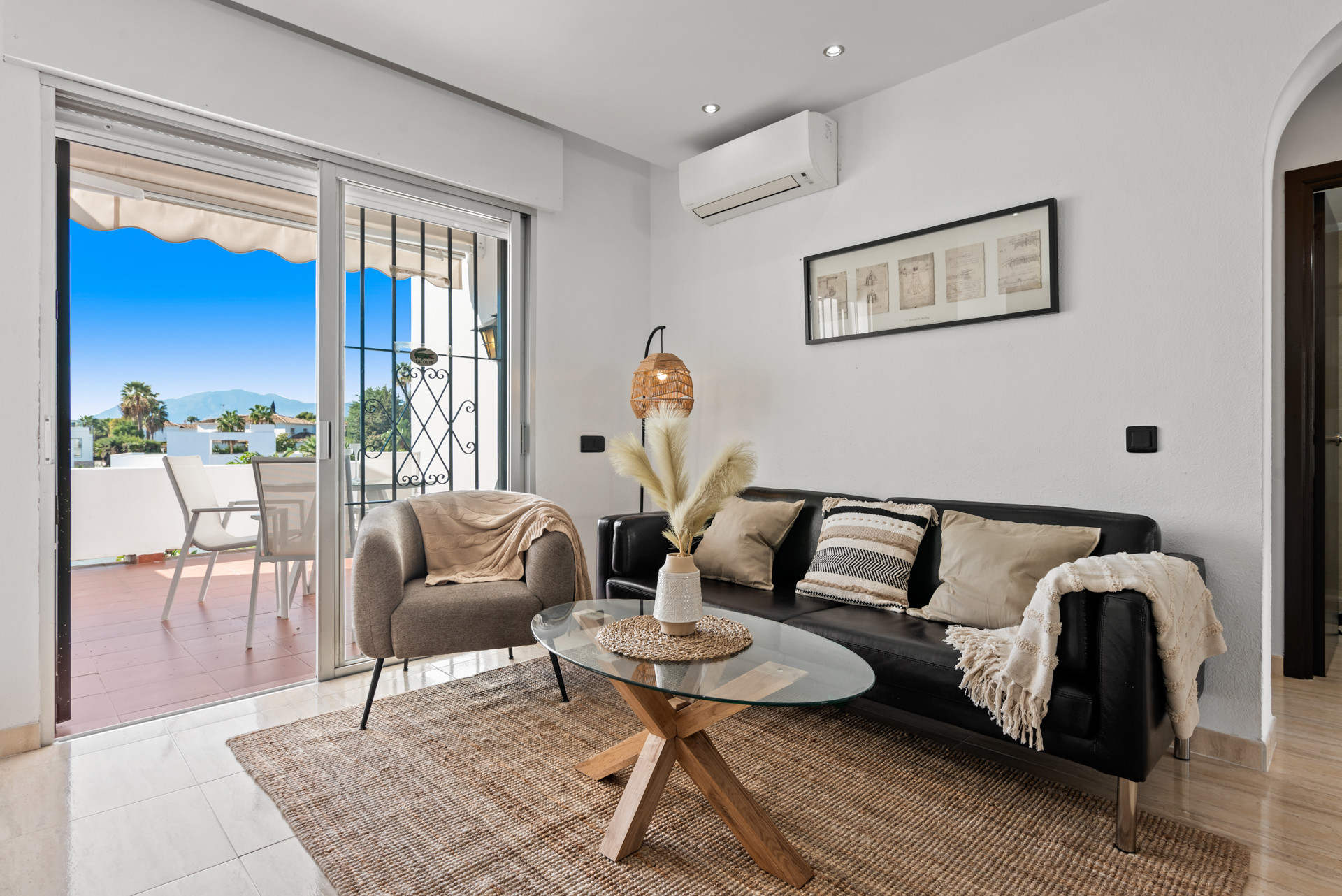 Velkommen til Casa Cielo! Casa Cielo er en smukt præsenteret 2-værelses, 1-badeværelses lejlighed i Aldea Blanca, som tilbyder moderne komfort i et af Nueva Andalucías mest eftertragtede lukkede boligområder. Lejligheden har en lys åben planløsning, hvor opholds-, spise- og køkkenområder flyder naturligt sammen og skaber et rummeligt og socialt miljø fyldt med naturligt lys. Store skydedøre forbinder interiøret direkte med terrassen og fremhæver den luftige stemning overalt. Et af soveværelserne smelter ubesværet ind i opholdsområdet og skaber et fleksibelt rum, der kan fungere som et ekstra loungeagtigt rum eller gæsteområde, samtidig med at lejlighedens åbne, moderne æstetik bevares. Varme trægulve og neutrale nuancer giver hjemmet en rolig, moderne atmosfære.