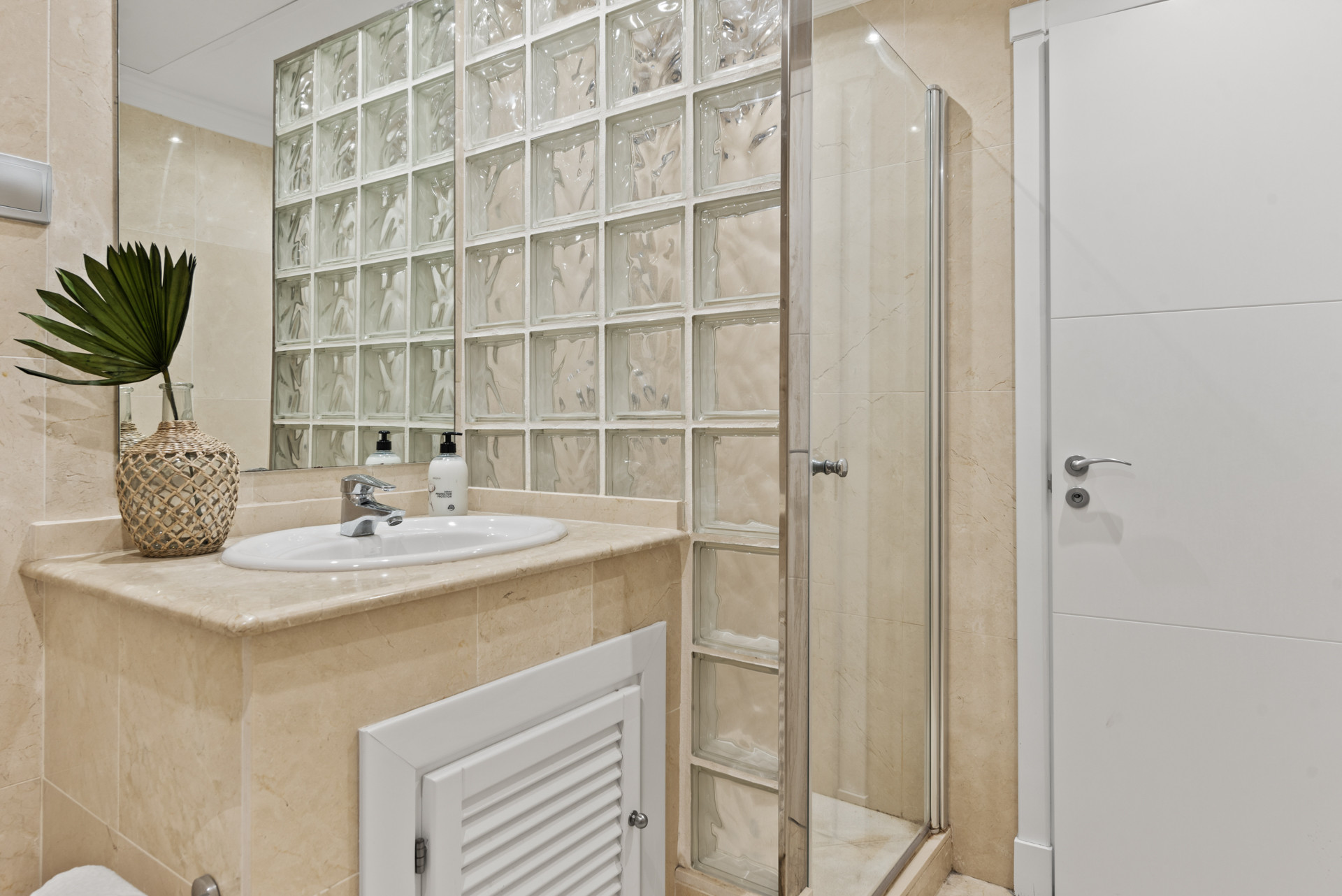 Velkommen til Casa Cielo! Casa Cielo er en smukt præsenteret 2-værelses, 1-badeværelses lejlighed i Aldea Blanca, som tilbyder moderne komfort i et af Nueva Andalucías mest eftertragtede lukkede boligområder. Lejligheden har en lys åben planløsning, hvor opholds-, spise- og køkkenområder flyder naturligt sammen og skaber et rummeligt og socialt miljø fyldt med naturligt lys. Store skydedøre forbinder interiøret direkte med terrassen og fremhæver den luftige stemning overalt. Et af soveværelserne smelter ubesværet ind i opholdsområdet og skaber et fleksibelt rum, der kan fungere som et ekstra loungeagtigt rum eller gæsteområde, samtidig med at lejlighedens åbne, moderne æstetik bevares. Varme trægulve og neutrale nuancer giver hjemmet en rolig, moderne atmosfære.