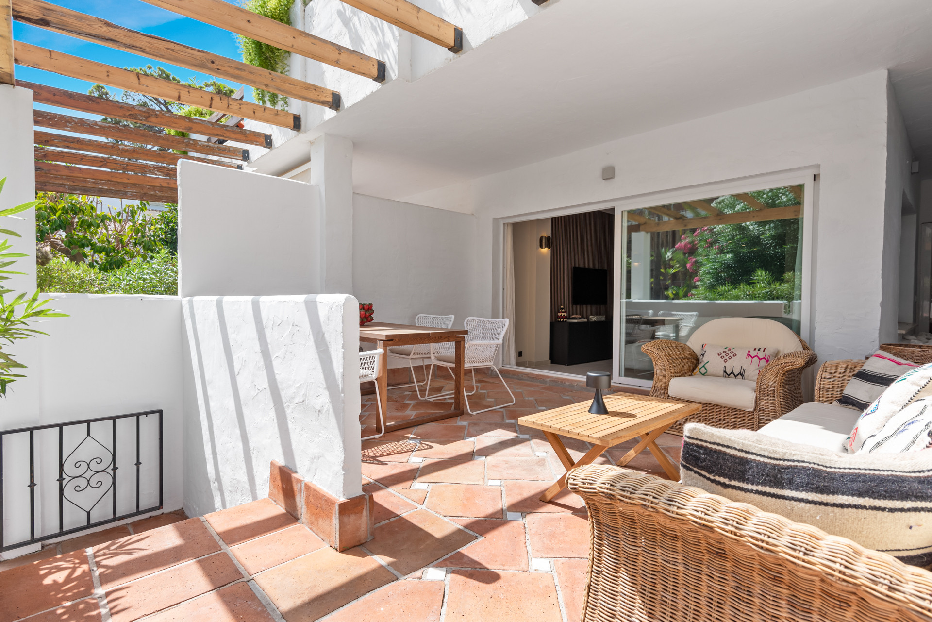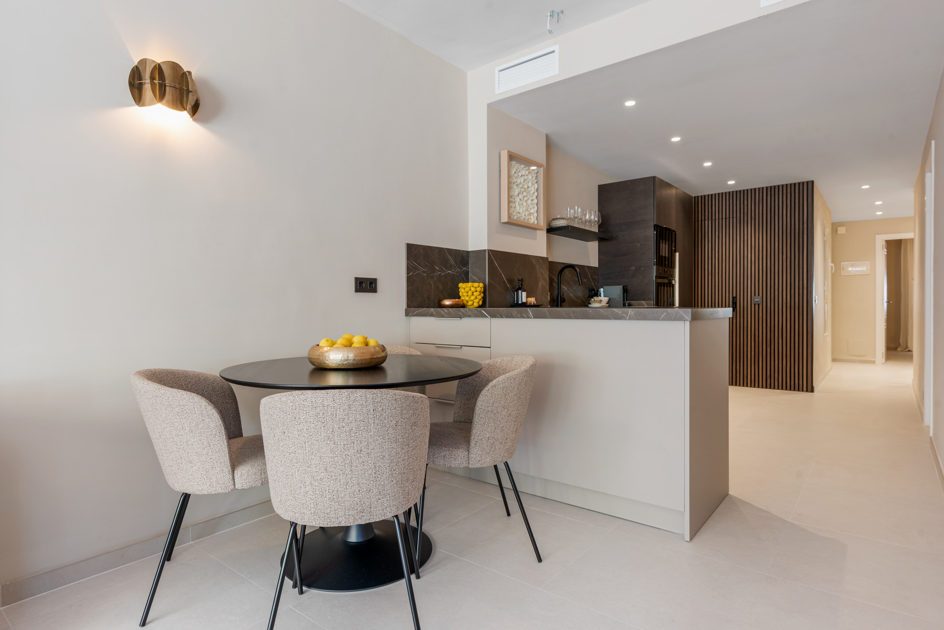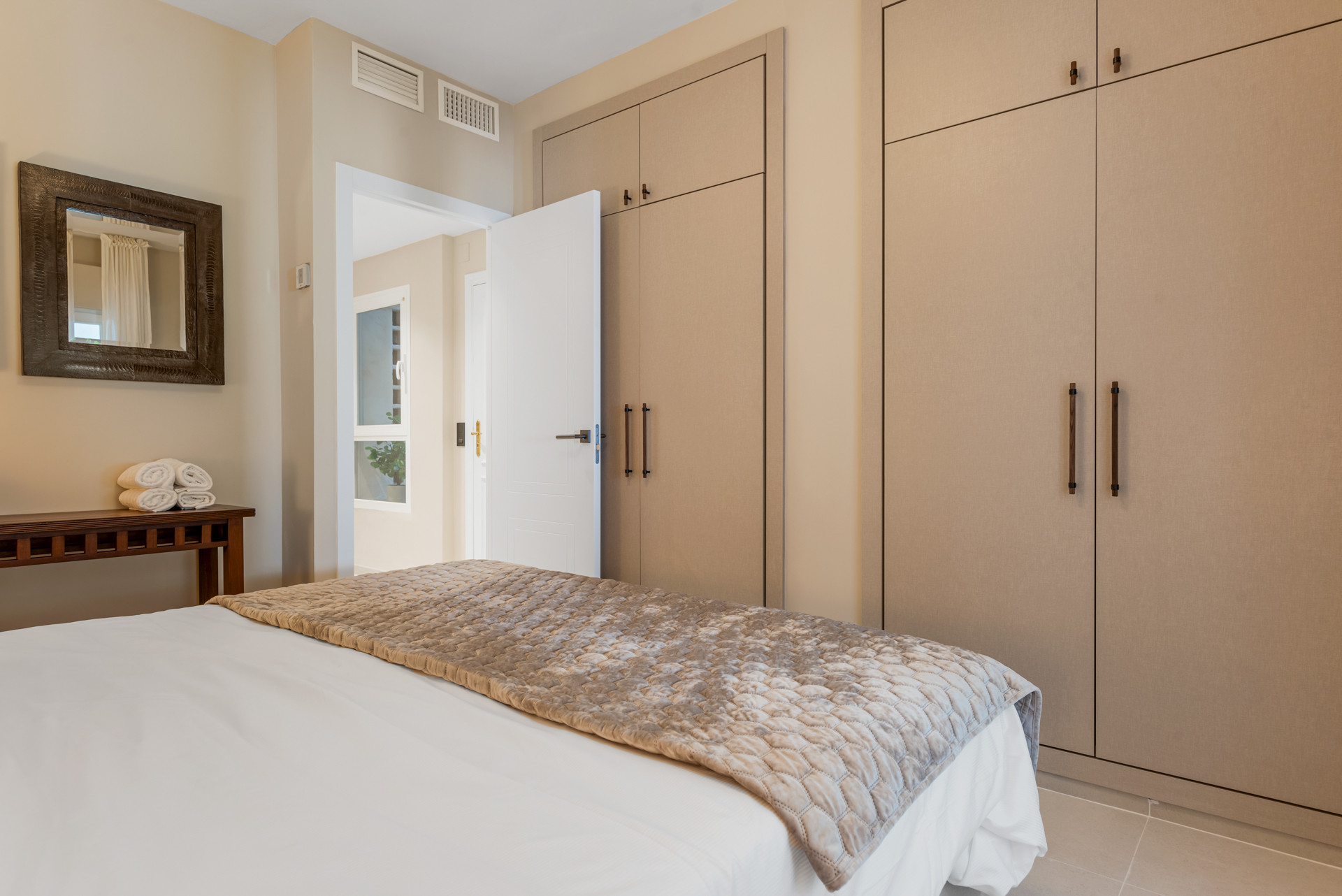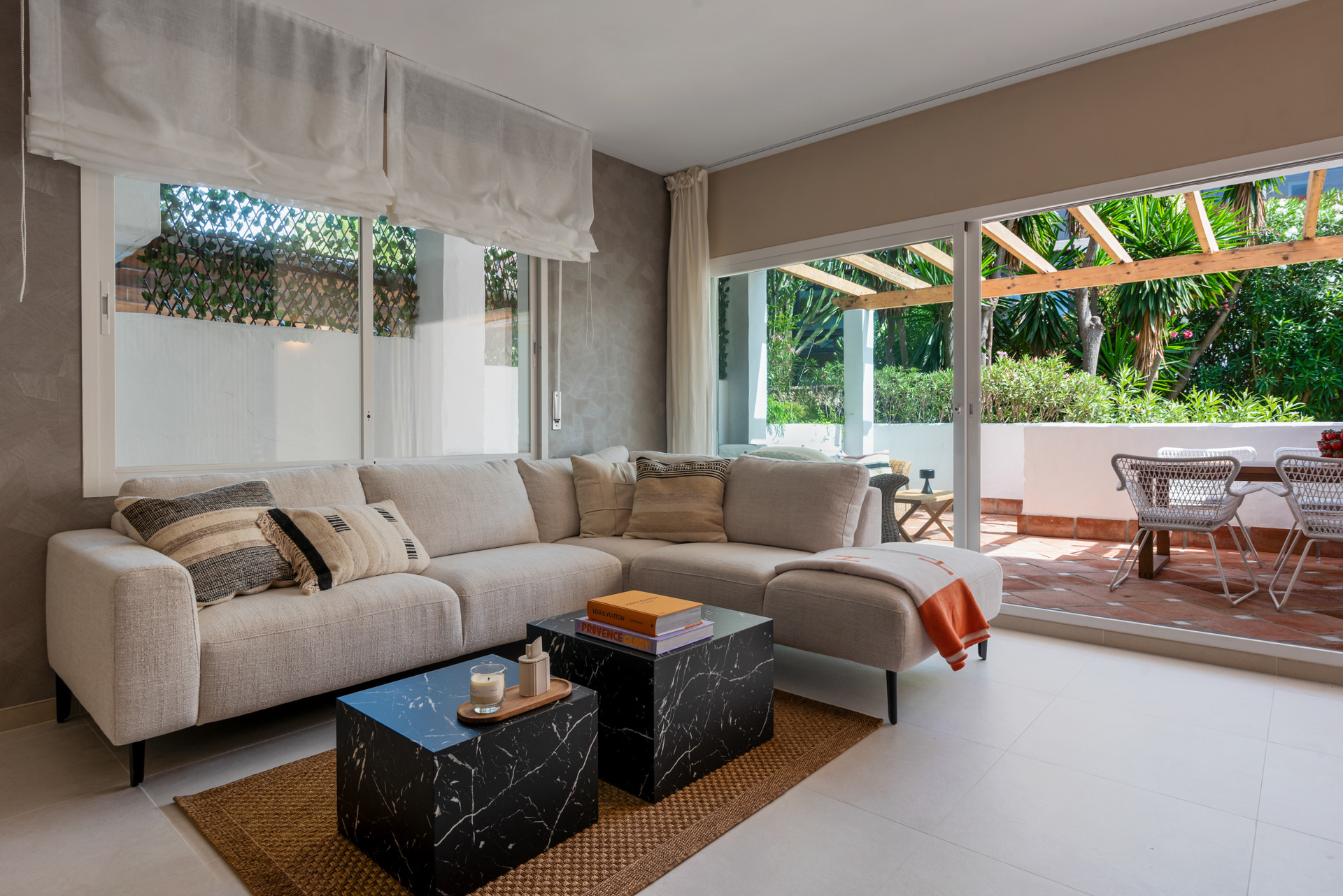 Velkommen til Casa Cielo! Casa Cielo er en smukt præsenteret 2-værelses, 1-badeværelses lejlighed i Aldea Blanca, som tilbyder moderne komfort i et af Nueva Andalucías mest eftertragtede lukkede boligområder. Lejligheden har en lys åben planløsning, hvor opholds-, spise- og køkkenområder flyder naturligt sammen og skaber et rummeligt og socialt miljø fyldt med naturligt lys. Store skydedøre forbinder interiøret direkte med terrassen og fremhæver den luftige stemning overalt. Et af soveværelserne smelter ubesværet ind i opholdsområdet og skaber et fleksibelt rum, der kan fungere som et ekstra loungeagtigt rum eller gæsteområde, samtidig med at lejlighedens åbne, moderne æstetik bevares. Varme trægulve og neutrale nuancer giver hjemmet en rolig, moderne atmosfære.