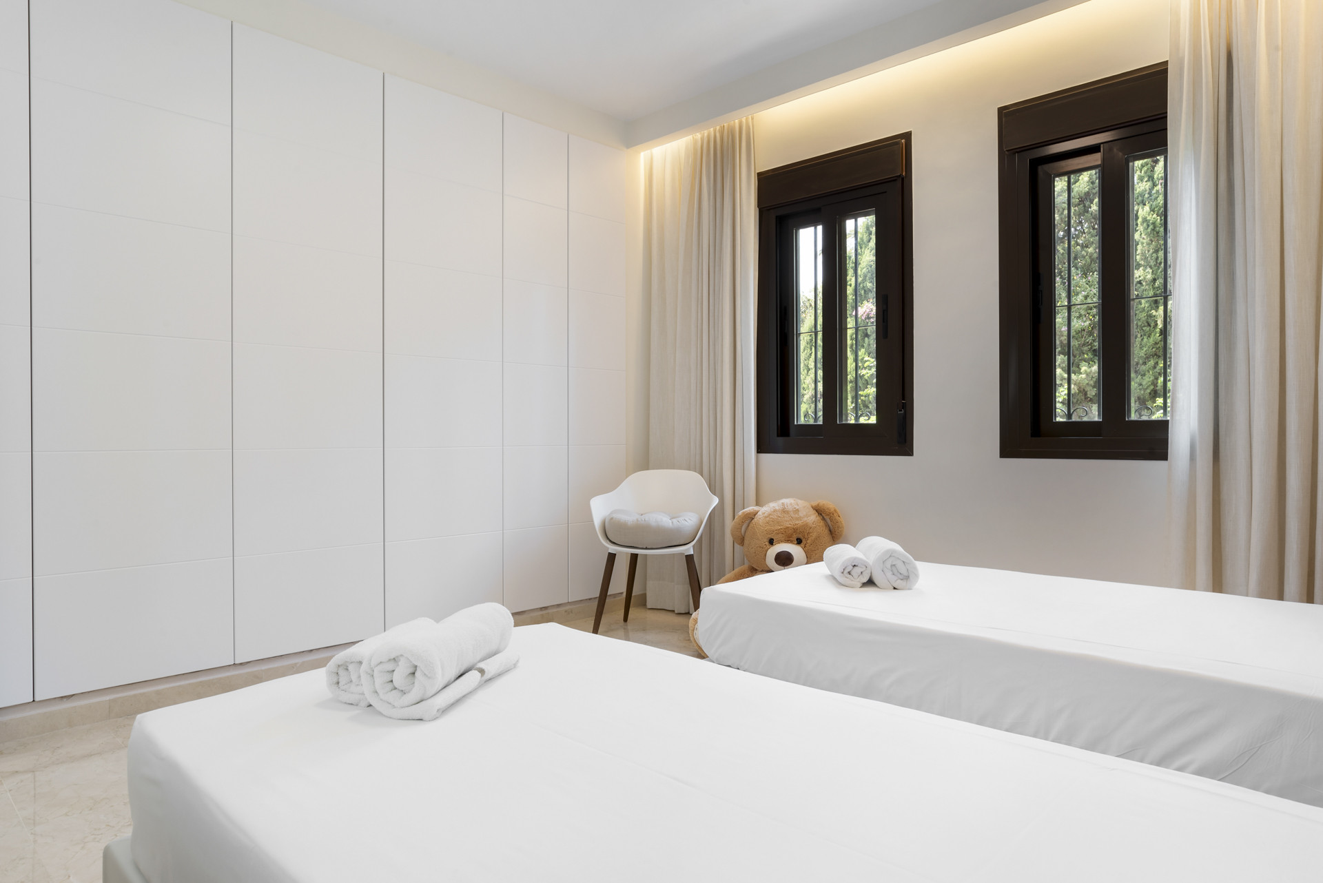 Køkkenet er strømlinet og fuldt udstyret med højtydende Bosch-hårde hvidevarer, integreret skabsindretning og en iøjnefaldende marmorbaggrundsflise. En generøs central ø tilføjer både arbejdsplads og et uformelt spiseelement. Hovedsoveværelset har en dobbeltseng, eget badeværelse, terrasse-adgang og specialdesignede indbyggede garderober med en naturlig træ- og hvid finish, som skaber et roligt tilflugtssted. De to yderligere soveværelser er hver udstyret med to enkeltsenge - perfekt til børn, gæster eller venner, der deler værelse - stylet med en blanding af bløde, legesyge og raffinerede detaljer.