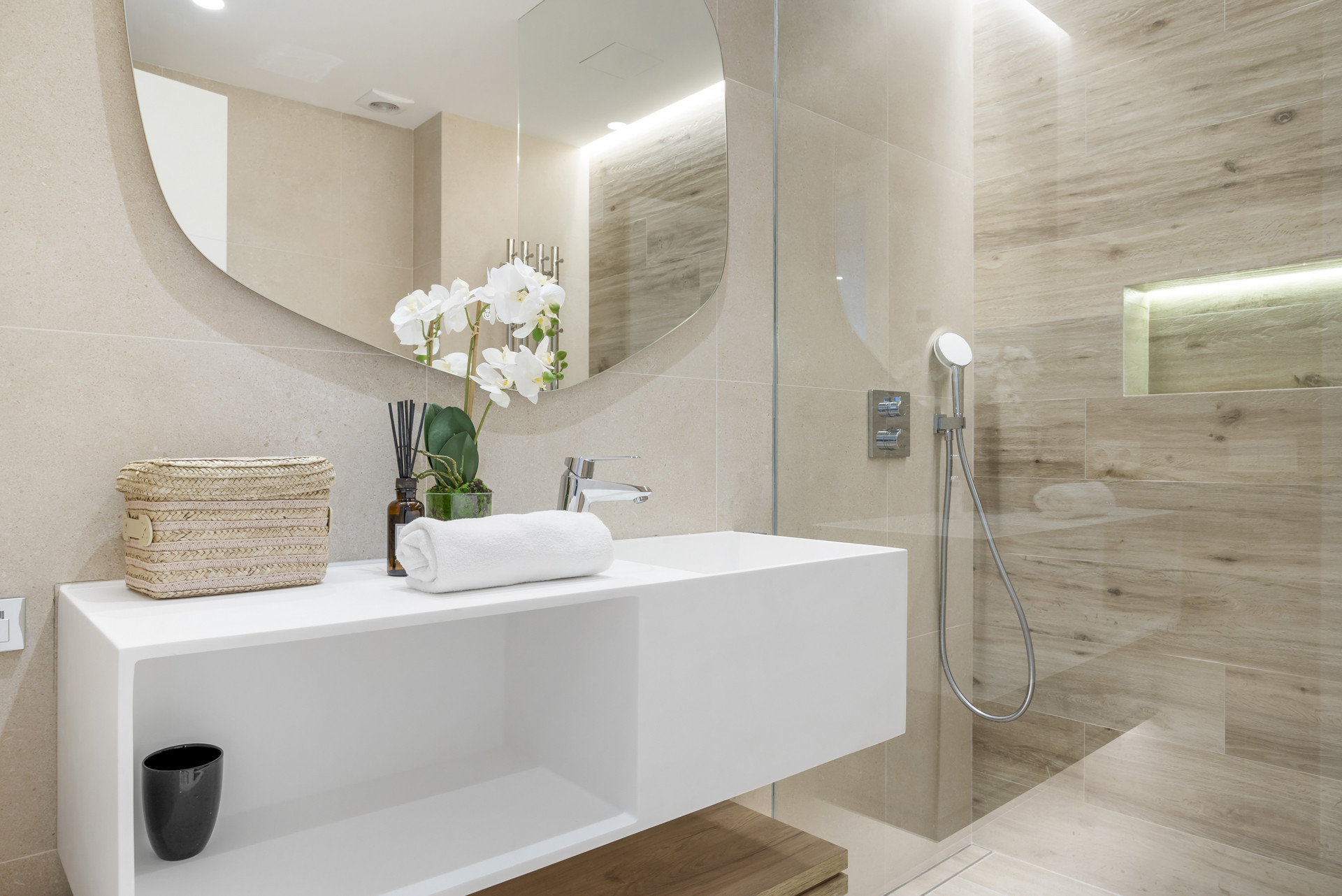 Begge badeværelser er smukt designet, med walk-in-brusere, storformat fliser, ambient belysning og tidssvarende armaturer - der blander spa-lignende komfort med visuel appel.