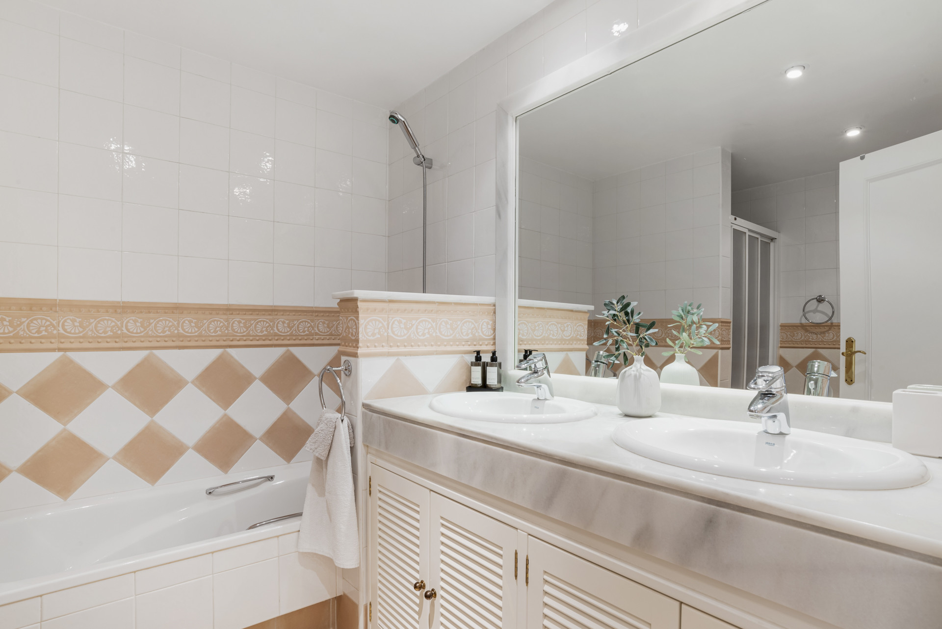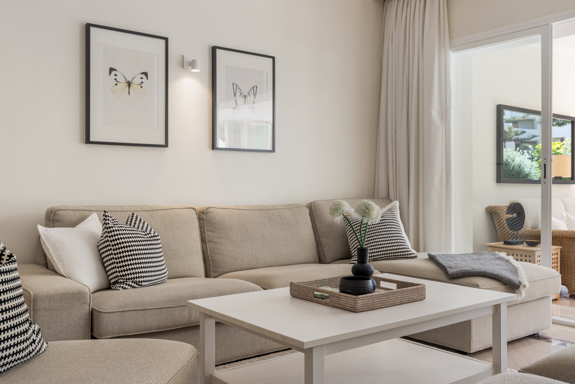 Denne elegante lejlighed i stueetagen med 2 soveværelser og 2 badeværelser i Hacienda Elviria tilbyder den perfekte blanding af middelhavets charme og moderne komfort. Opholdsstuen og spisepladsen i åbent plan er indrettet med bløde neutrale toner og stilfulde møbler og er badet i naturligt lys og skaber en varm og indbydende atmosfære. Gulv til loft-skydedøre forbindes problemfrit til den ekspansive overdækkede terrasse, som er fuldt møbleret med opholdsområde, spiseplads og liggestole - alt sammen med udsigt over smukt vedligeholdte haver med glimt af havet. Et separat, fuldt udstyret køkken med avancerede apparater sikrer bekvemmelighed for længere ophold, hvilket gør denne lejlighed ideel til familier og grupper, der søger et luksuriøst tilflugtssted.