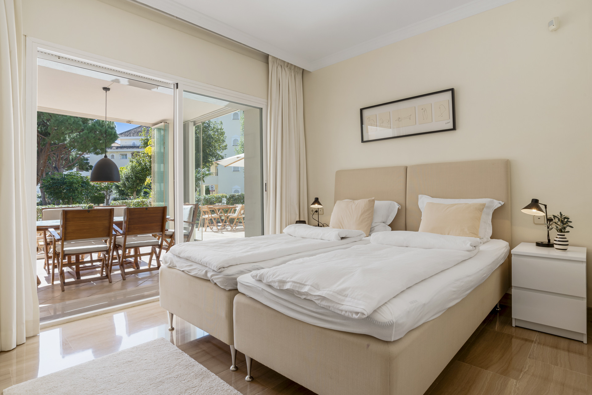 Velkommen til Casa Cielo! Casa Cielo er en smukt præsenteret 2-værelses, 1-badeværelses lejlighed i Aldea Blanca, som tilbyder moderne komfort i et af Nueva Andalucías mest eftertragtede lukkede boligområder. Lejligheden har en lys åben planløsning, hvor opholds-, spise- og køkkenområder flyder naturligt sammen og skaber et rummeligt og socialt miljø fyldt med naturligt lys. Store skydedøre forbinder interiøret direkte med terrassen og fremhæver den luftige stemning overalt. Et af soveværelserne smelter ubesværet ind i opholdsområdet og skaber et fleksibelt rum, der kan fungere som et ekstra loungeagtigt rum eller gæsteområde, samtidig med at lejlighedens åbne, moderne æstetik bevares. Varme trægulve og neutrale nuancer giver hjemmet en rolig, moderne atmosfære.