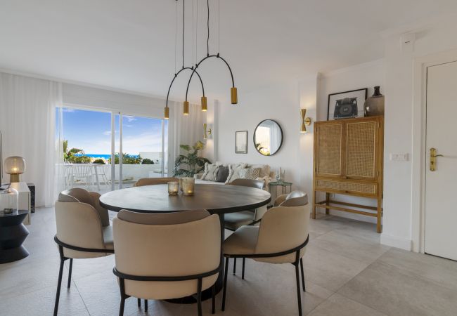 Når du træder ind i det åbne opholdsområde, bydes du velkommen af den samtidige boho-design og dekoration, og udsigten over Golf Valley, La Concha-bjerget og Middelhavet.