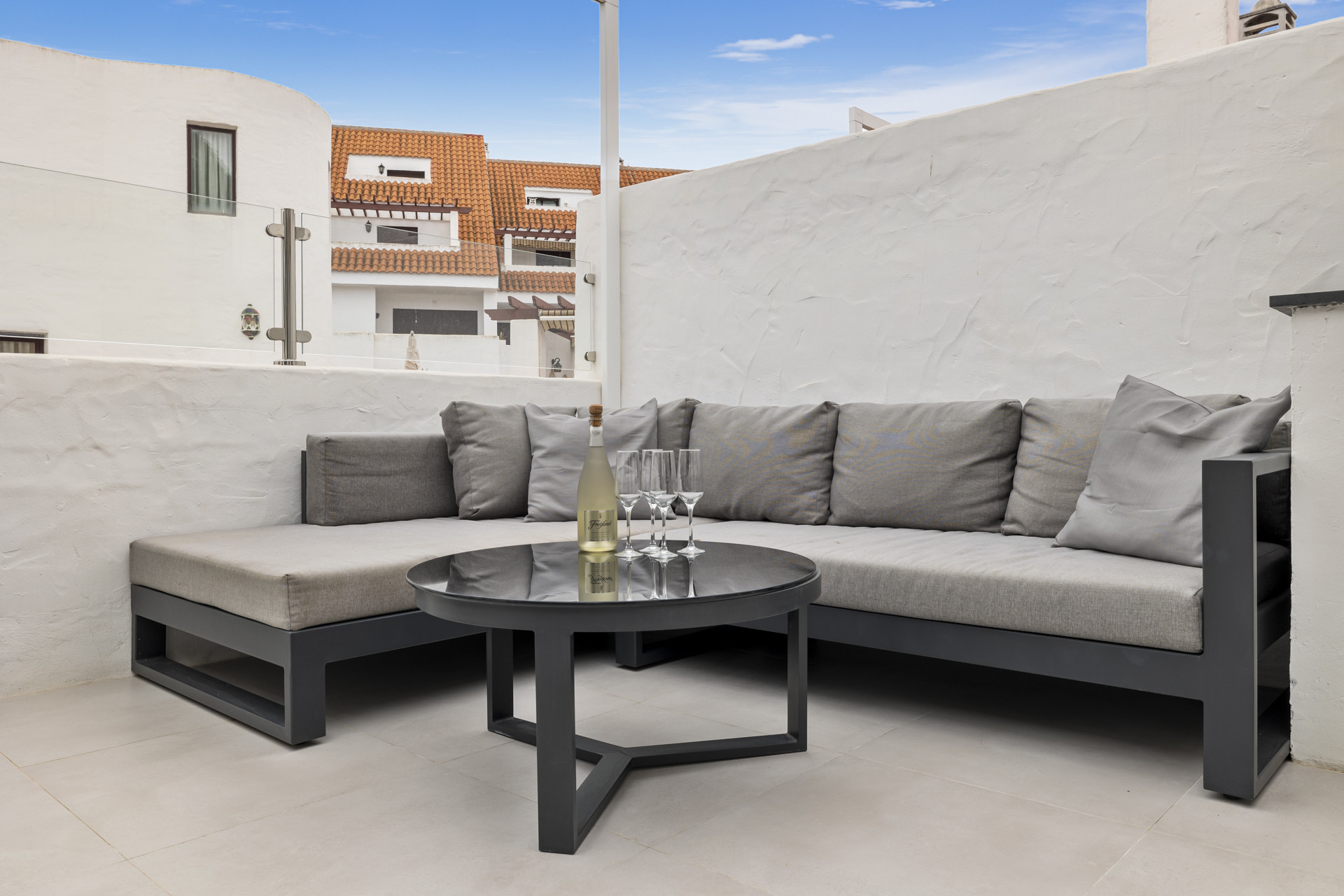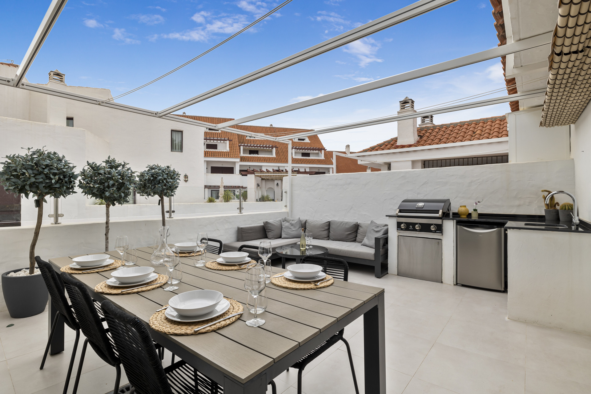 Terrassen ud for loungen nyder morgensolen og bjergudsynet og er indrettet med en siddeplads. Den anden terrasse indfanger eftermiddags- og aftensolen og er et vidunderligt rum til udendørs spisning. Der er et spisebord til 6 personer, et hjørnesofaområde, en gasgrill, opvaskemaskine og vask. Der er udtrækkelige markiser - perfekte til frokoster om sommeren eller middag under stjernerne.