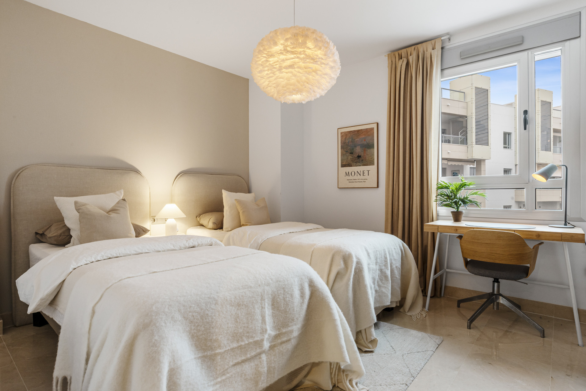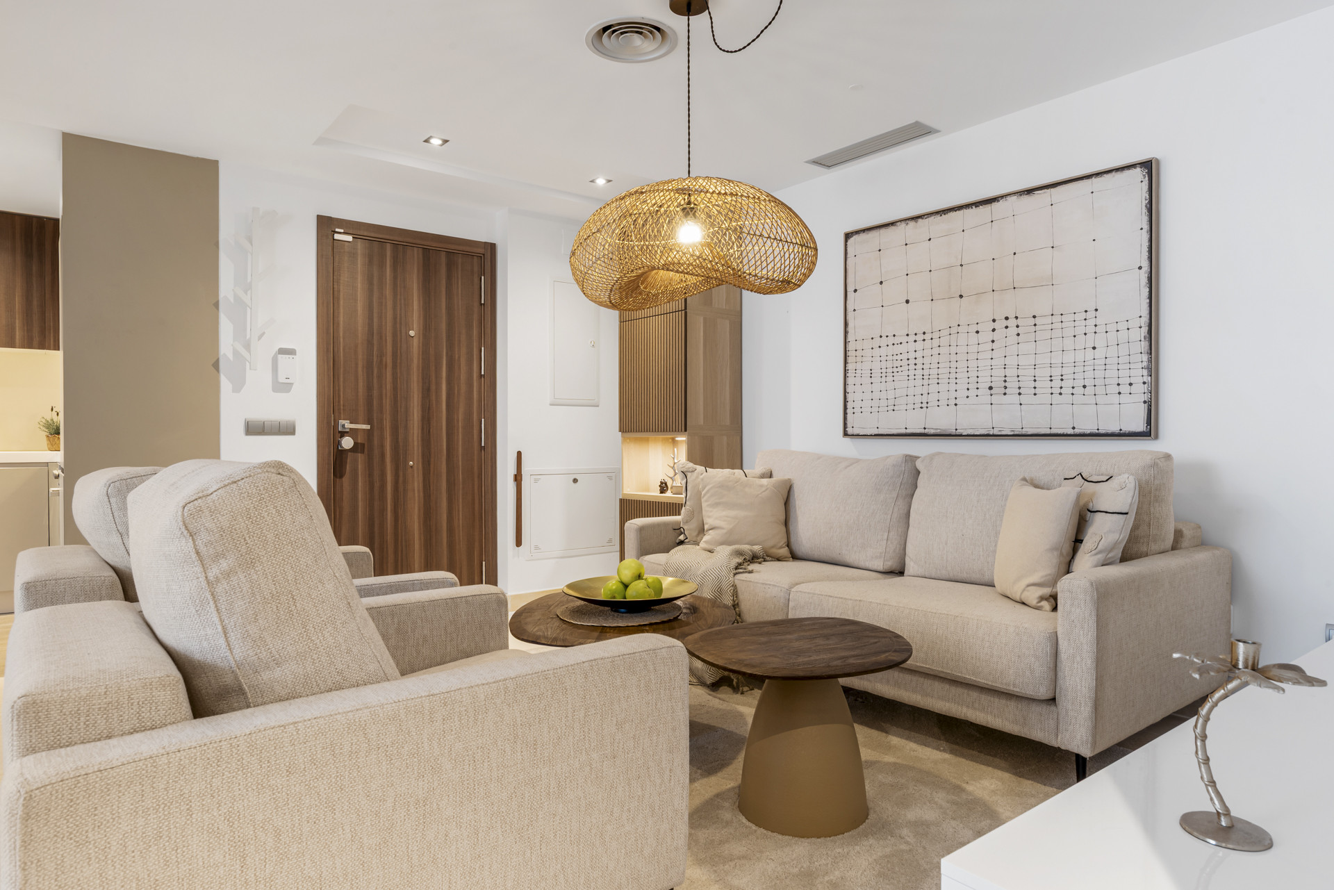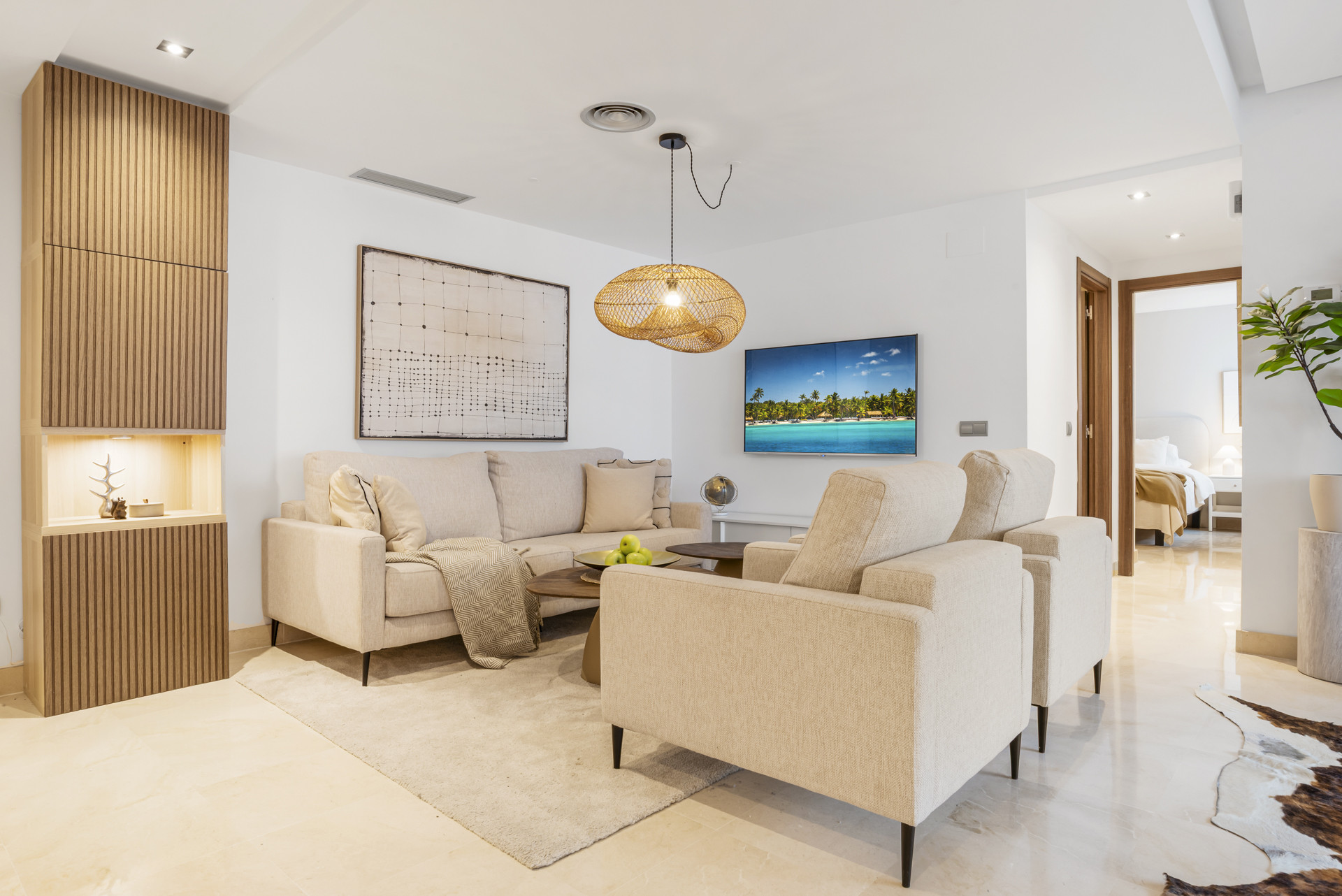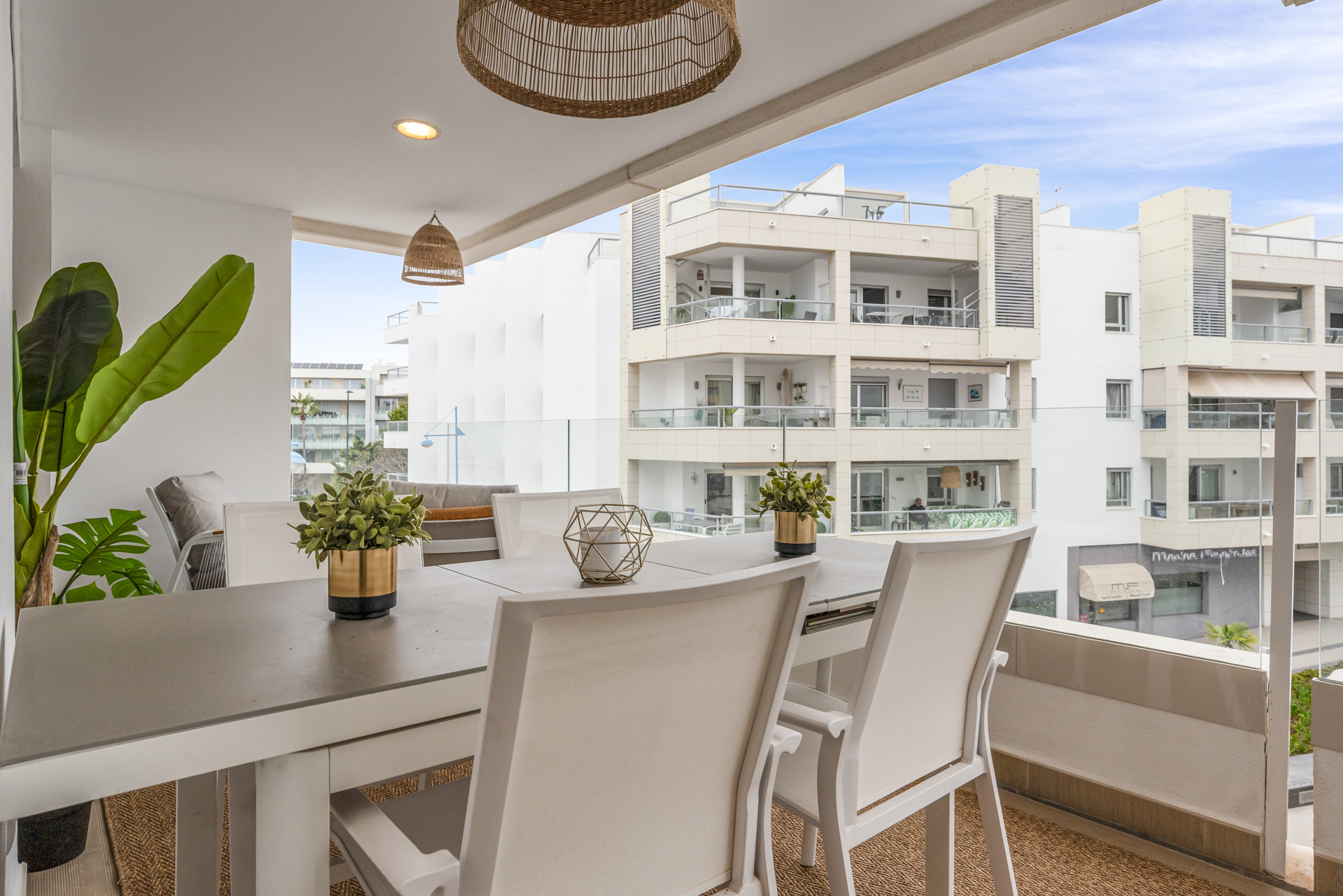 Velkommen til Casa Cielo! Casa Cielo er en smukt præsenteret 2-værelses, 1-badeværelses lejlighed i Aldea Blanca, som tilbyder moderne komfort i et af Nueva Andalucías mest eftertragtede lukkede boligområder. Lejligheden har en lys åben planløsning, hvor opholds-, spise- og køkkenområder flyder naturligt sammen og skaber et rummeligt og socialt miljø fyldt med naturligt lys. Store skydedøre forbinder interiøret direkte med terrassen og fremhæver den luftige stemning overalt. Et af soveværelserne smelter ubesværet ind i opholdsområdet og skaber et fleksibelt rum, der kan fungere som et ekstra loungeagtigt rum eller gæsteområde, samtidig med at lejlighedens åbne, moderne æstetik bevares. Varme trægulve og neutrale nuancer giver hjemmet en rolig, moderne atmosfære.