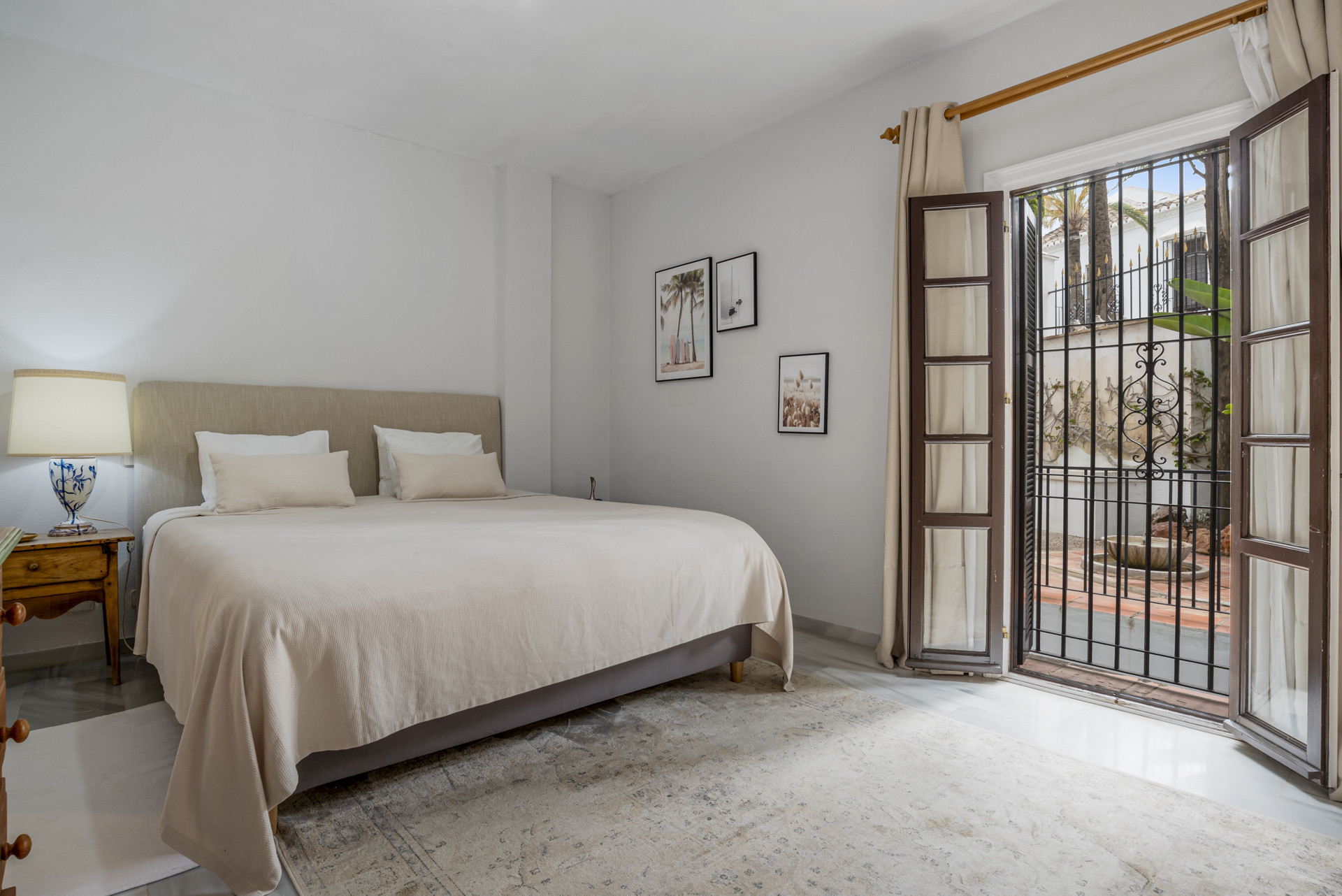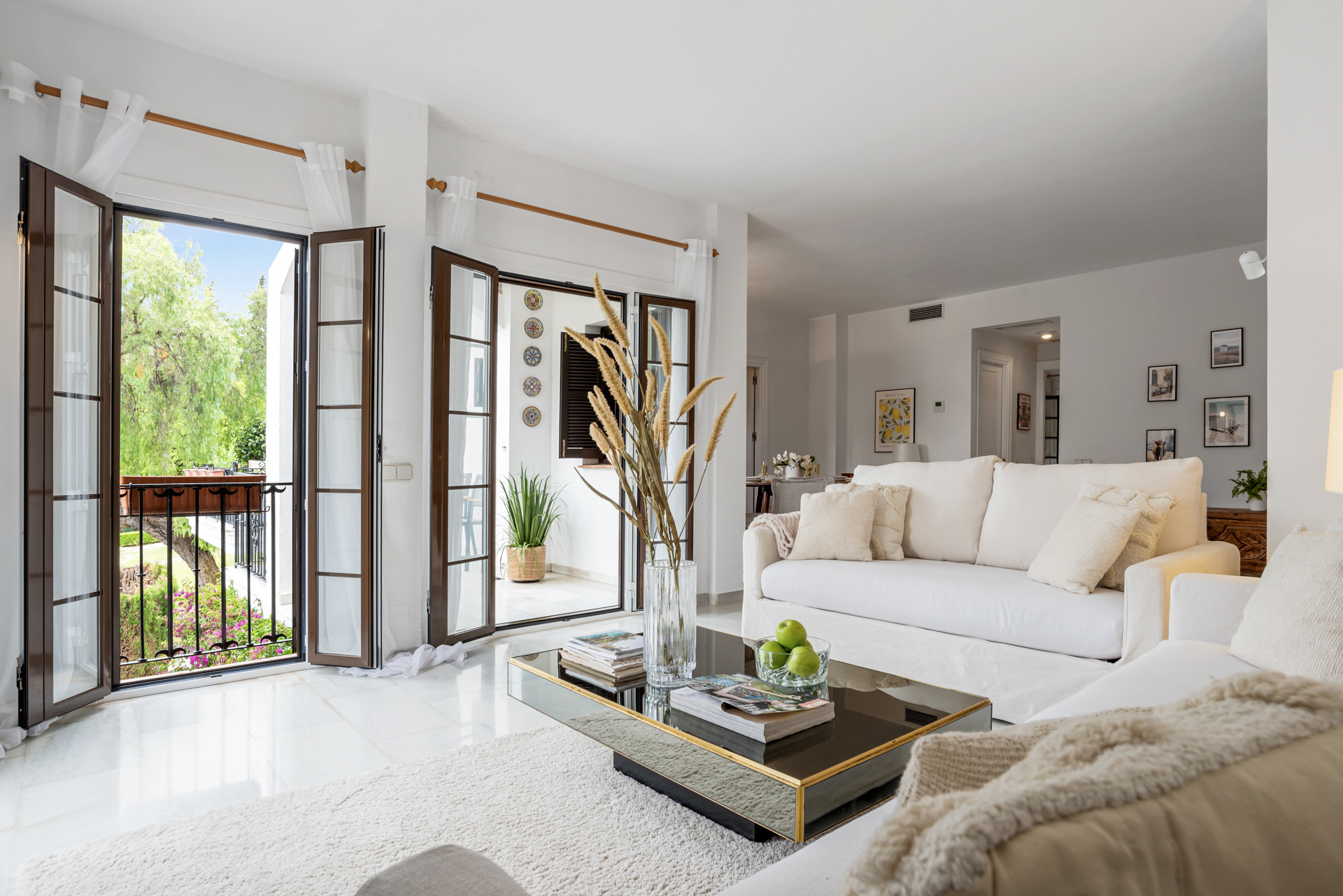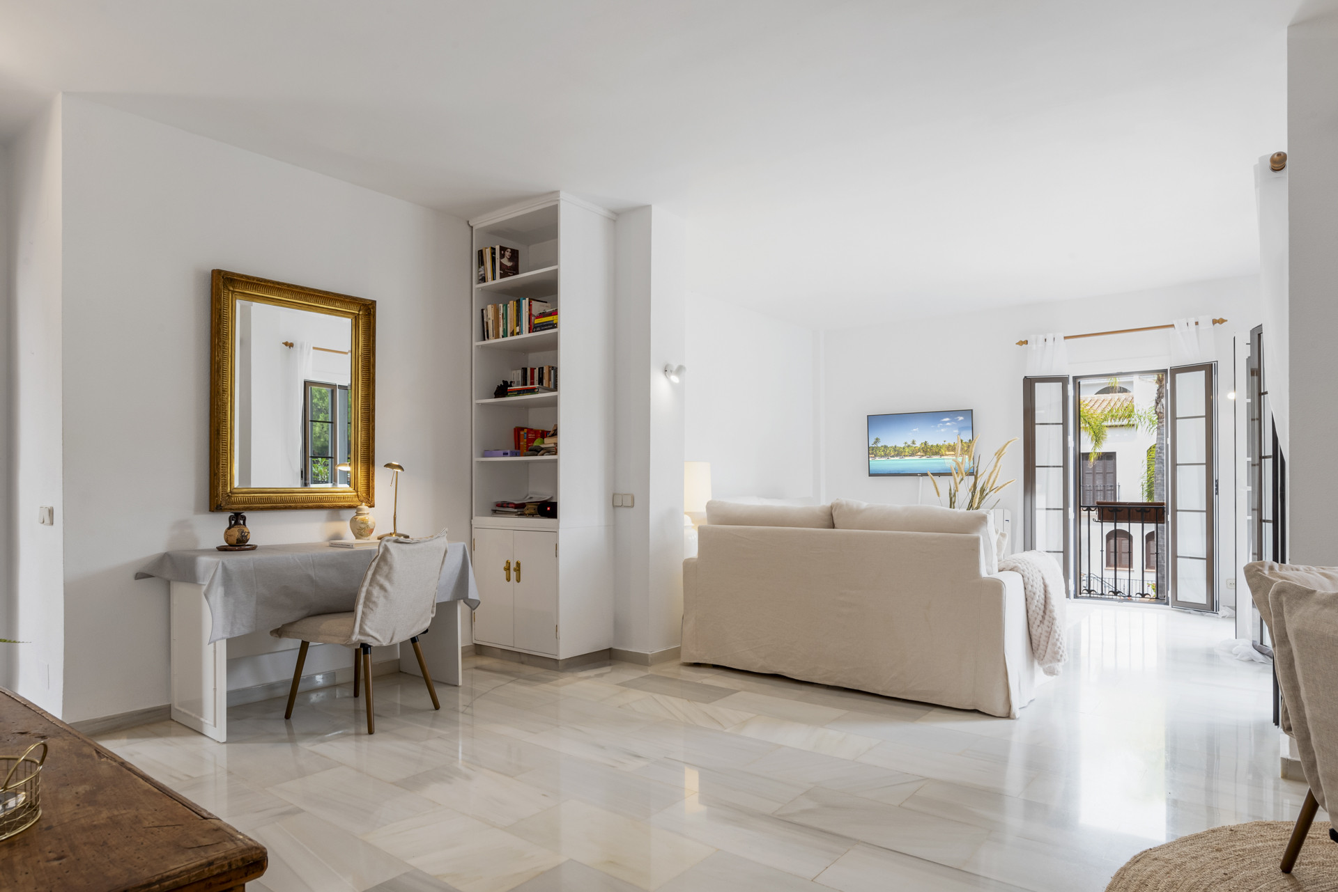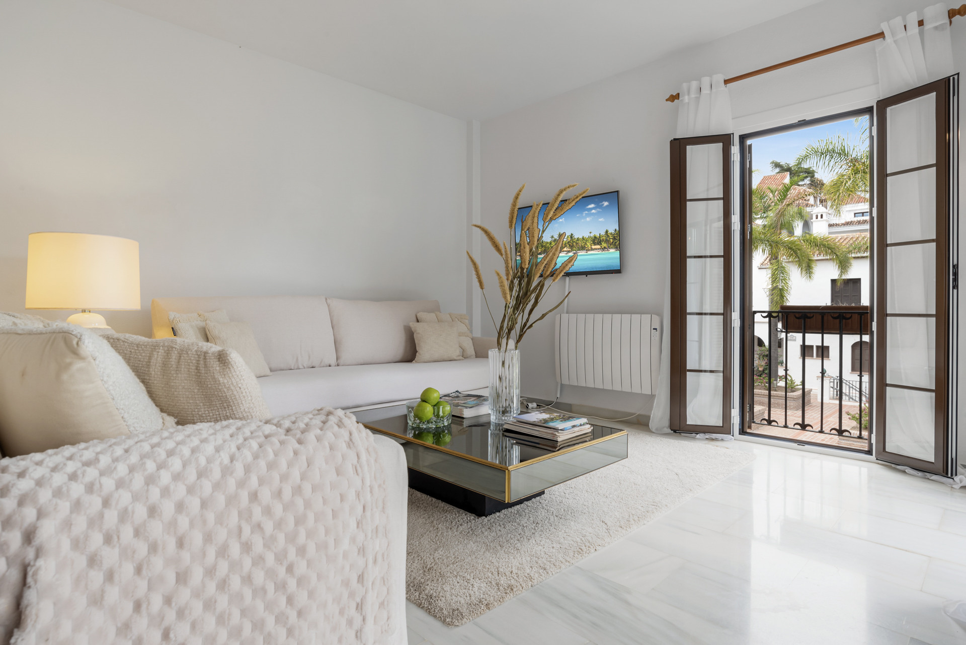 Velkommen til Casa Cielo! Casa Cielo er en smukt præsenteret 2-værelses, 1-badeværelses lejlighed i Aldea Blanca, som tilbyder moderne komfort i et af Nueva Andalucías mest eftertragtede lukkede boligområder. Lejligheden har en lys åben planløsning, hvor opholds-, spise- og køkkenområder flyder naturligt sammen og skaber et rummeligt og socialt miljø fyldt med naturligt lys. Store skydedøre forbinder interiøret direkte med terrassen og fremhæver den luftige stemning overalt. Et af soveværelserne smelter ubesværet ind i opholdsområdet og skaber et fleksibelt rum, der kan fungere som et ekstra loungeagtigt rum eller gæsteområde, samtidig med at lejlighedens åbne, moderne æstetik bevares. Varme trægulve og neutrale nuancer giver hjemmet en rolig, moderne atmosfære.