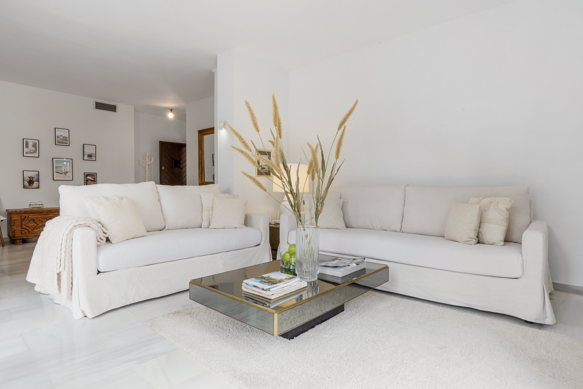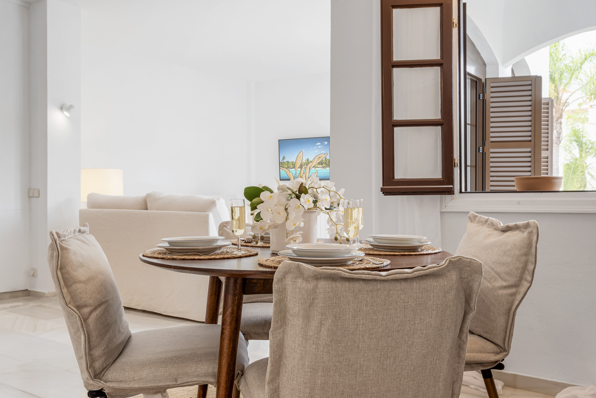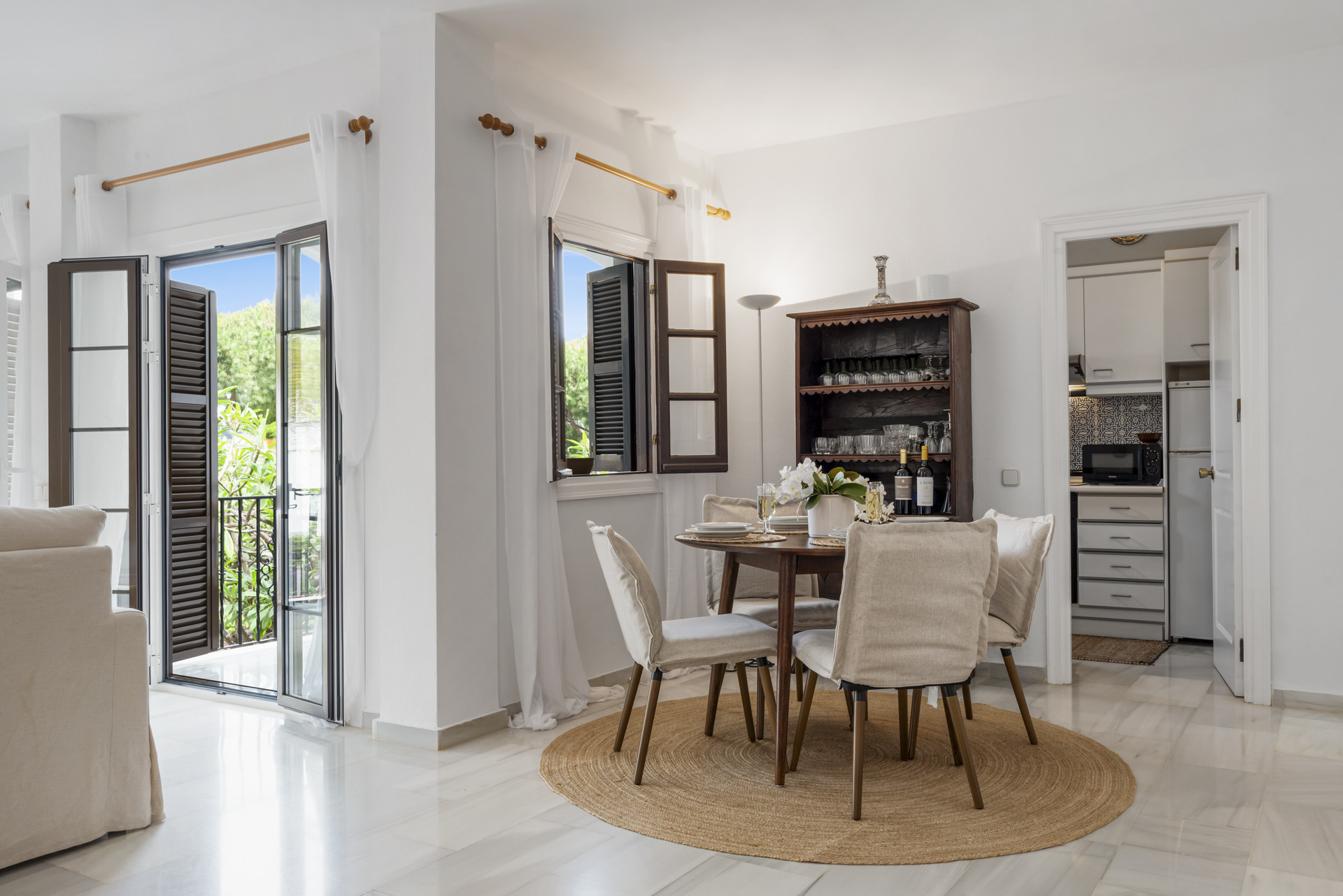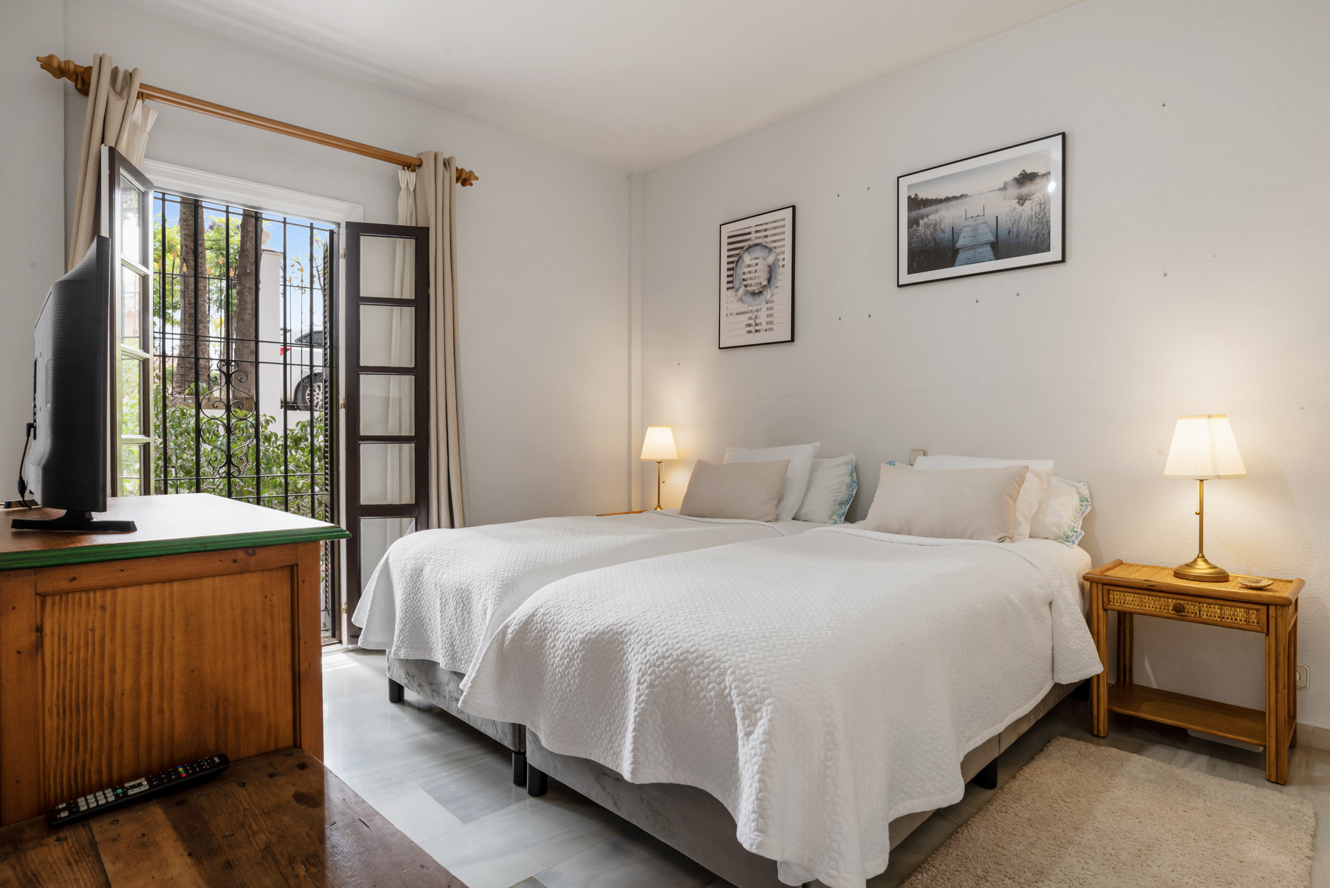 Velkommen til Casa Cielo! Casa Cielo er en smukt præsenteret 2-værelses, 1-badeværelses lejlighed i Aldea Blanca, som tilbyder moderne komfort i et af Nueva Andalucías mest eftertragtede lukkede boligområder. Lejligheden har en lys åben planløsning, hvor opholds-, spise- og køkkenområder flyder naturligt sammen og skaber et rummeligt og socialt miljø fyldt med naturligt lys. Store skydedøre forbinder interiøret direkte med terrassen og fremhæver den luftige stemning overalt. Et af soveværelserne smelter ubesværet ind i opholdsområdet og skaber et fleksibelt rum, der kan fungere som et ekstra loungeagtigt rum eller gæsteområde, samtidig med at lejlighedens åbne, moderne æstetik bevares. Varme trægulve og neutrale nuancer giver hjemmet en rolig, moderne atmosfære.