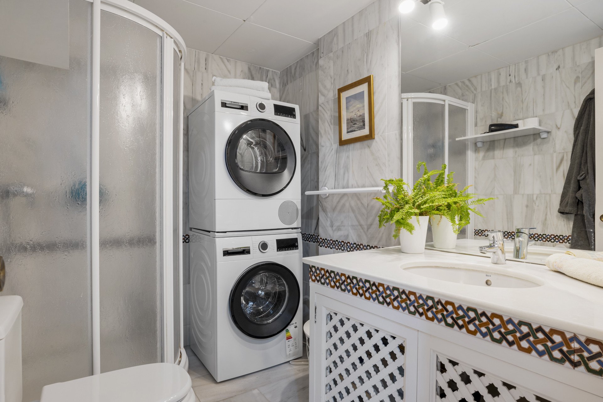 Den generøse private terrasse er et sandt højdepunkt, der byder på smukke solnedgangs- og havudsigter fra sin ophøjede position. Med både spise- og loungeområder giver den den perfekte ramme for afslappede aftener og udendørs underholdning. Aldea Blanca er kendt for sine frodige landskabshaver og usædvanligt velvedligeholdte fælles poolområder, der skaber en fredelig oase inden for et sikkert lukket kompleks. Ideelt beliggende er lejligheden inden for bekvem gåafstand til Puerto Banús, butikker, restauranter og stranden, hvilket tilbyder både bekvemmelighed og livsstil i lige høj grad. Bemærk venligst, at bygningen ikke har elevator.