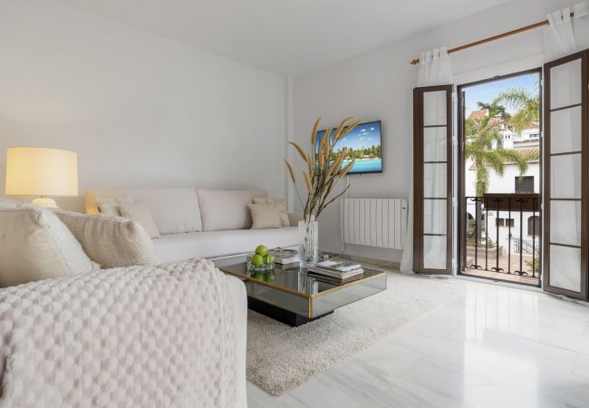 Beliggende i den prestigefyldte Señorío de Marbella-udstykning inden for Lomas de Marbella Club tilbyder denne charmerende lejlighed med 2 soveværelser og 2 badeværelser en fredelig tilflugtssted i hjertet af Marbellas Golden Mile. Placeret i en smukt vedligeholdt kompleks, der er designet til at ligne en traditionel andalusisk landsby, er omgivelserne lige så maleriske som rolige - med brolagte gangstier, hvidkalkede bygninger og frodig grøn vegetation overalt.