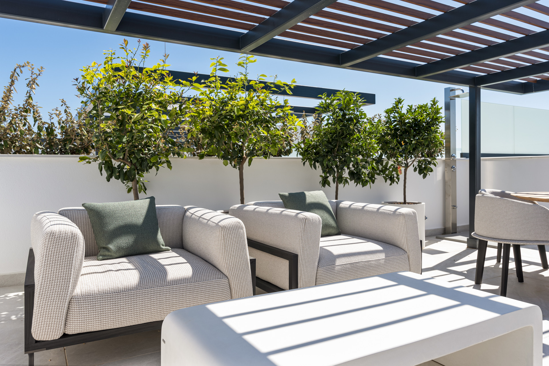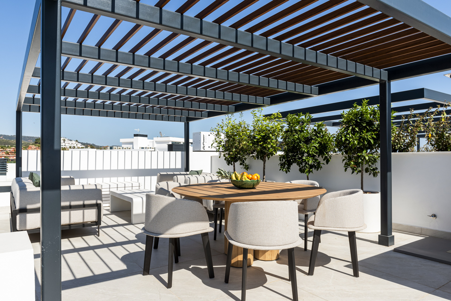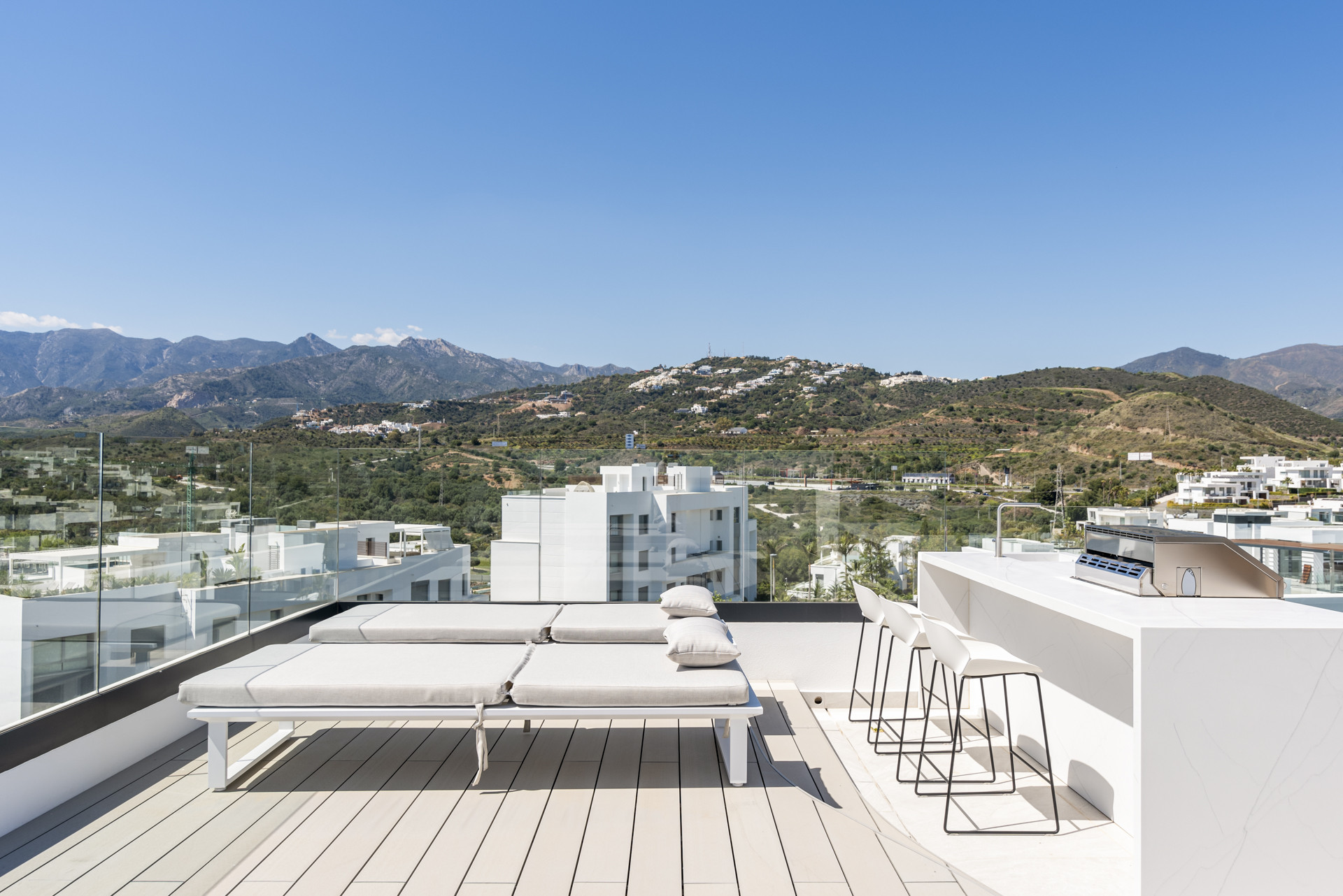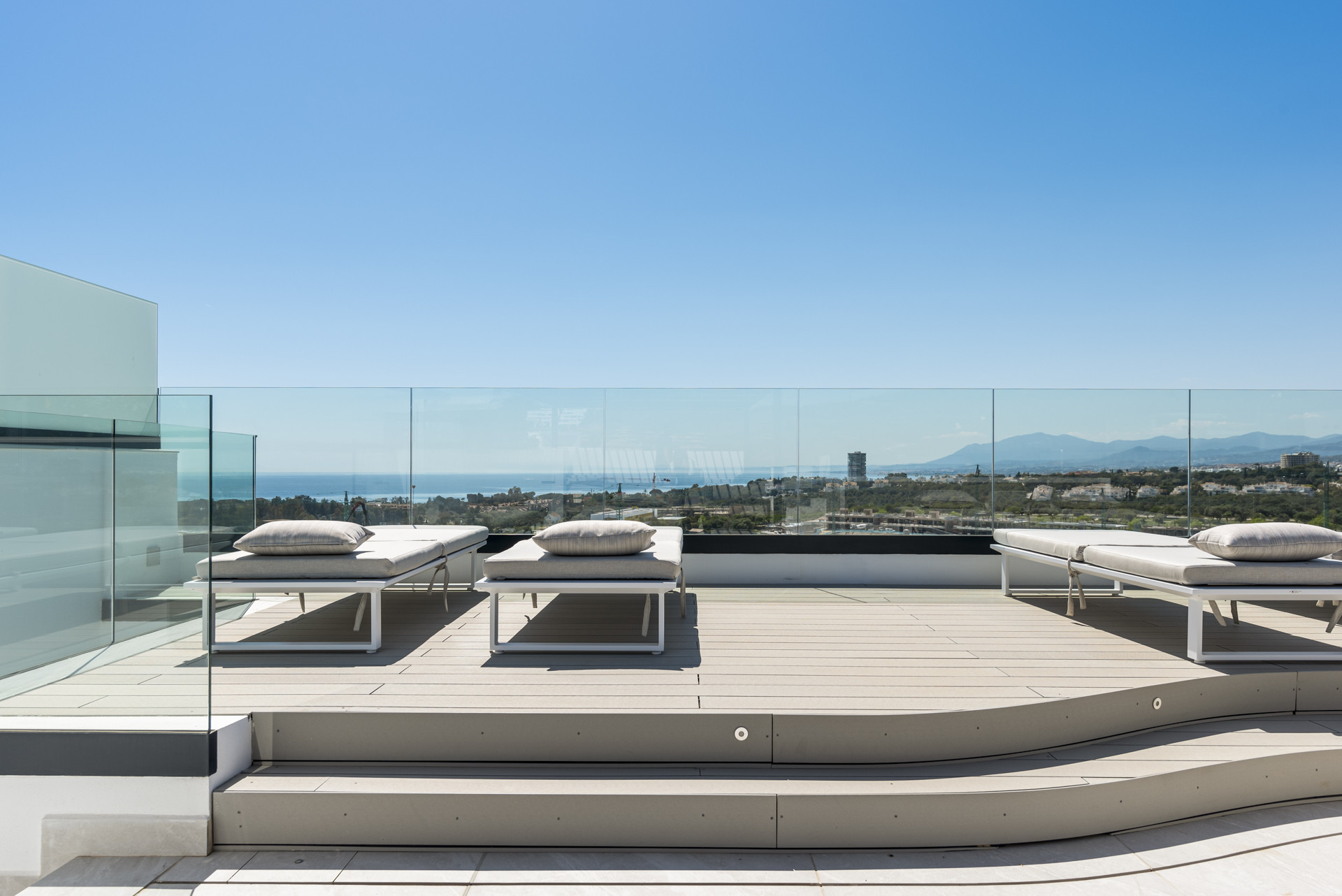 Herfra er der en trappe, der fører til Tagterrassen med enestående udsigt over swimmingpoolene og haverne, videre ud mod Middelhavet, med de majestætiske bjerge i baggrunden. Der er et udvalg af liggestole, et spisebord og en grill samt en afslapningszone – det perfekte rum at nyde på et hvilket som helst tidspunkt på dagen.