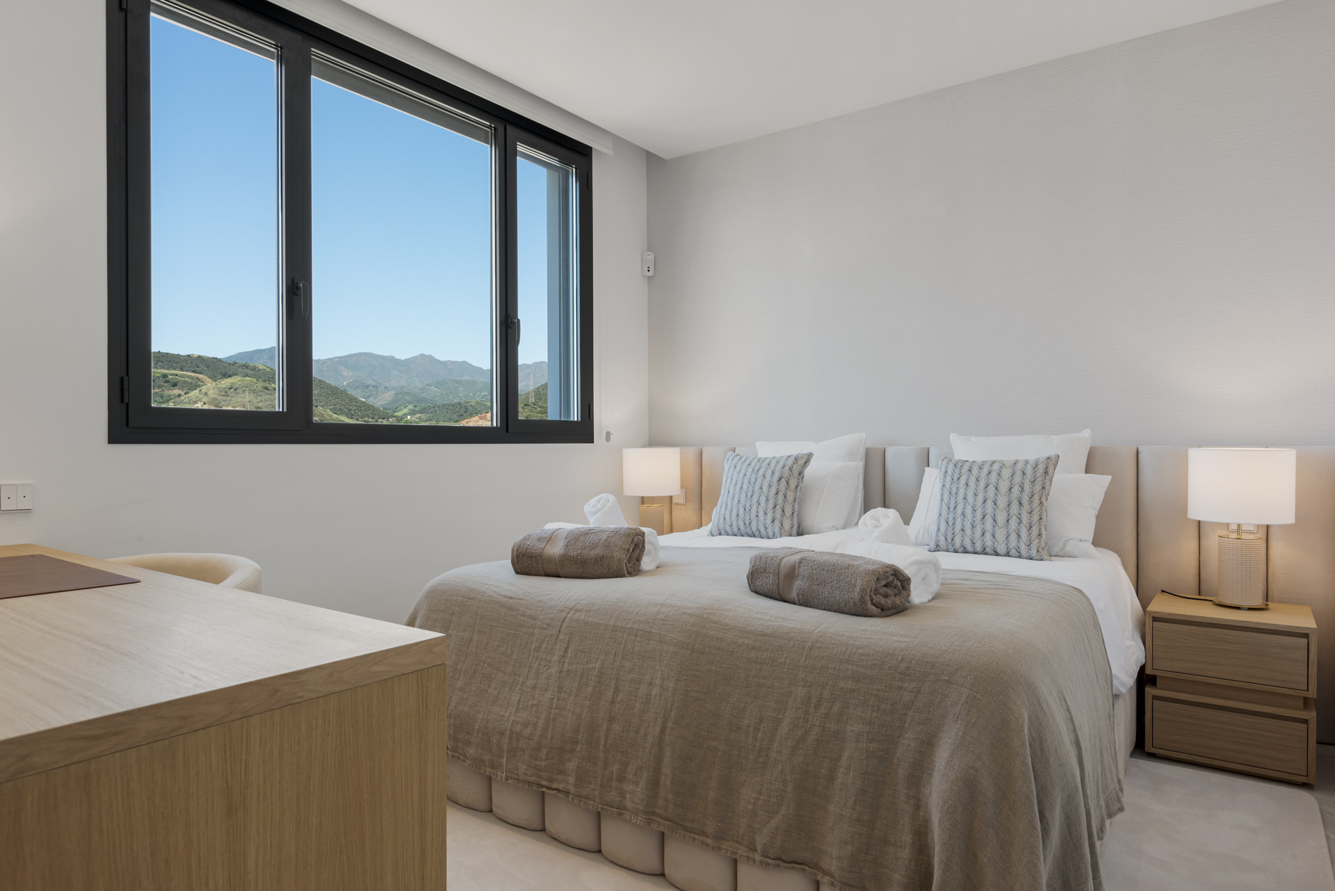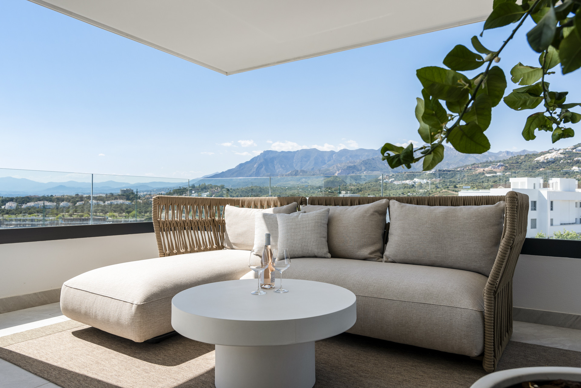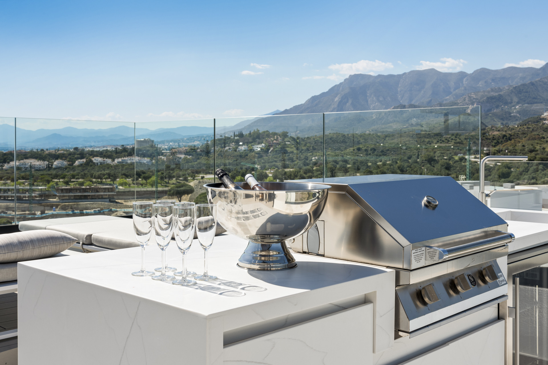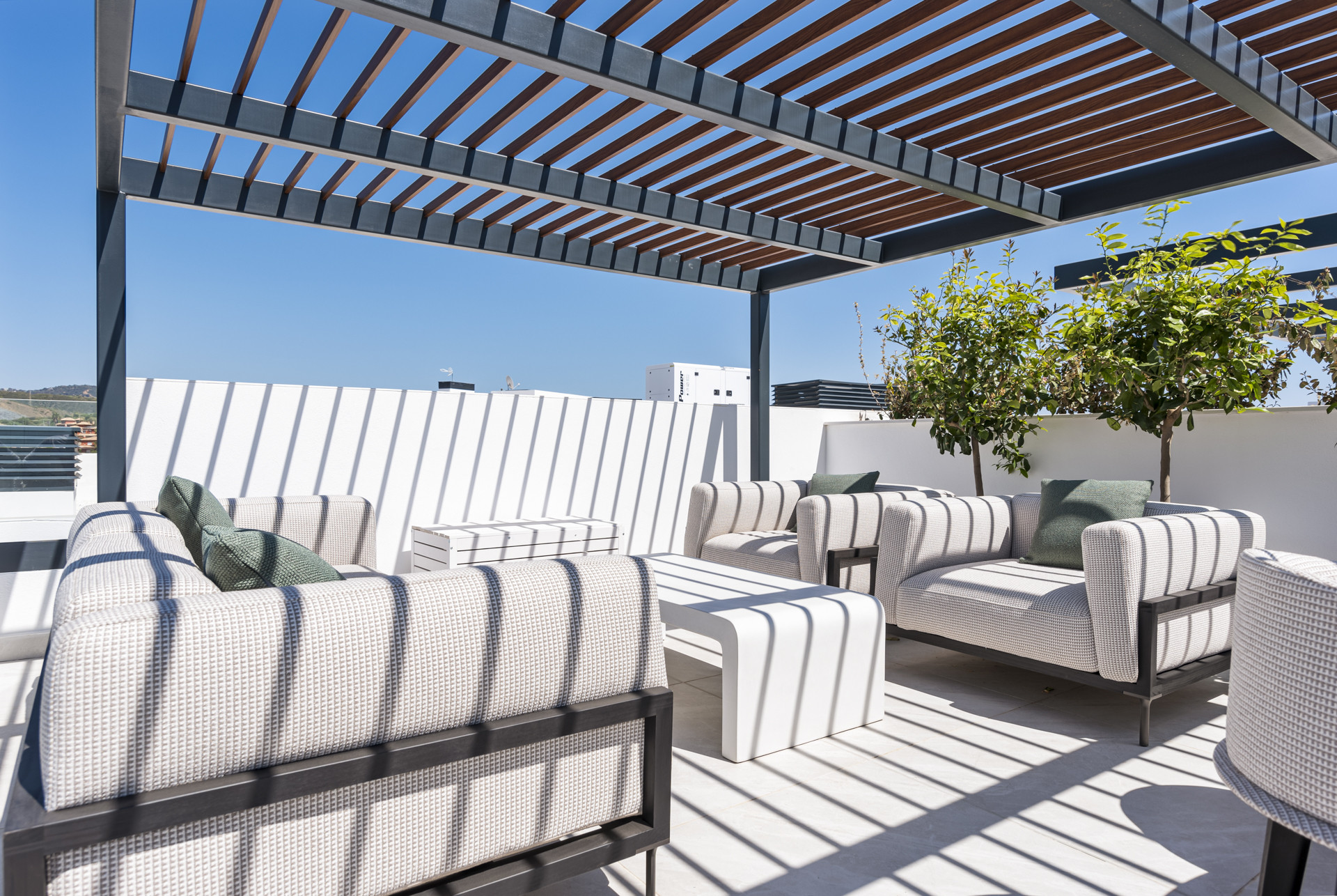 Herfra er der en trappe, der fører til Tagterrassen med enestående udsigt over swimmingpoolene og haverne, videre ud mod Middelhavet, med de majestætiske bjerge i baggrunden. Der er et udvalg af liggestole, et spisebord og en grill samt en afslapningszone – det perfekte rum at nyde på et hvilket som helst tidspunkt på dagen.