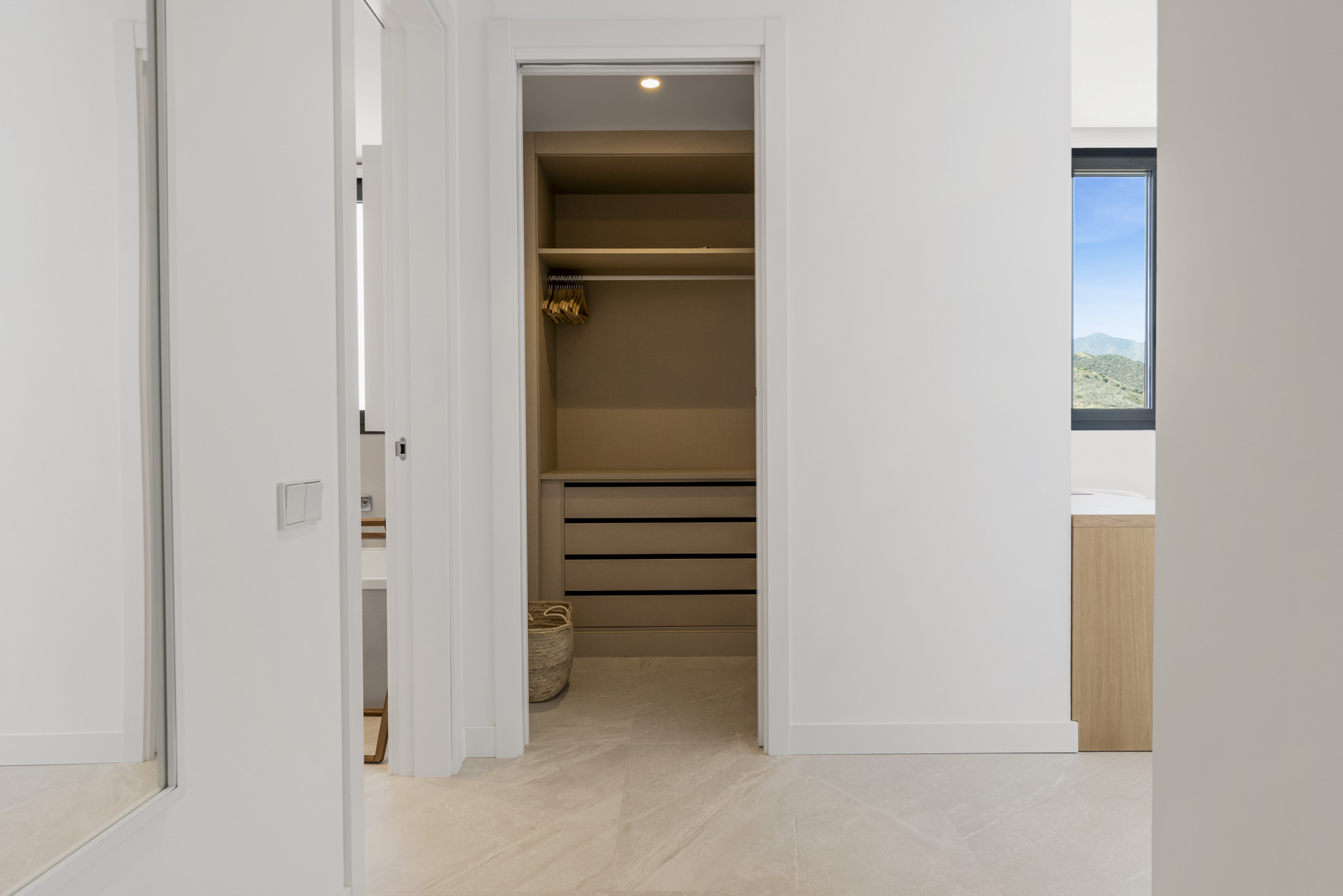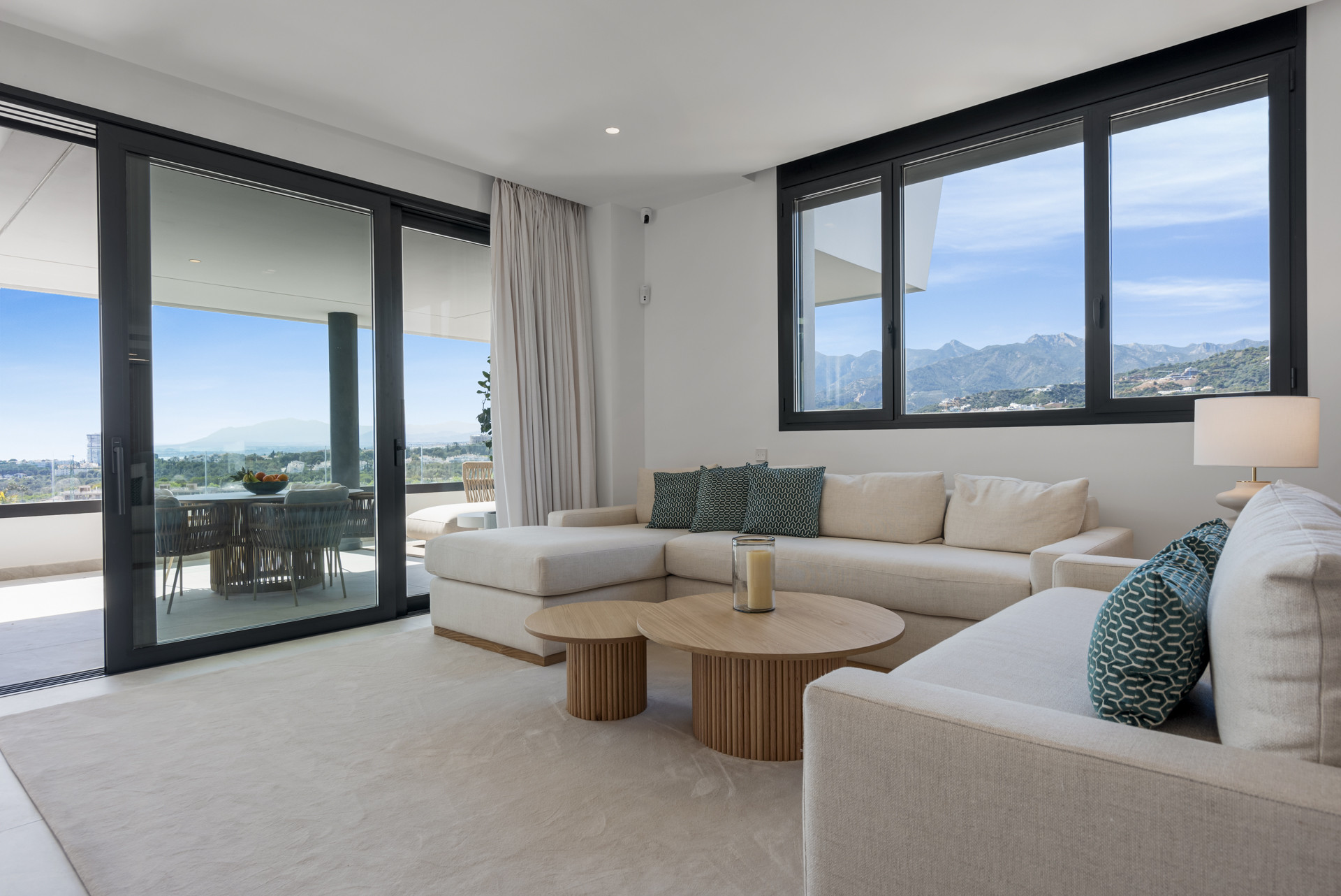 Når du træder indenfor, bliver du modtaget af en elegant og stilfuld atmosfære, hvor den rummelige åbne dagligstue nyder masser af naturligt lys og luksuriøse møbler. Det ultramoderne køkken tilbyder alt, hvad du har brug for for at lave dine yndlingsretter. Loungeområdet fører ud til den første terrasse, som giver mulighed for udendørs spisning og siddepladser for at nyde de panoramiske udsigter over Middelhavet.
