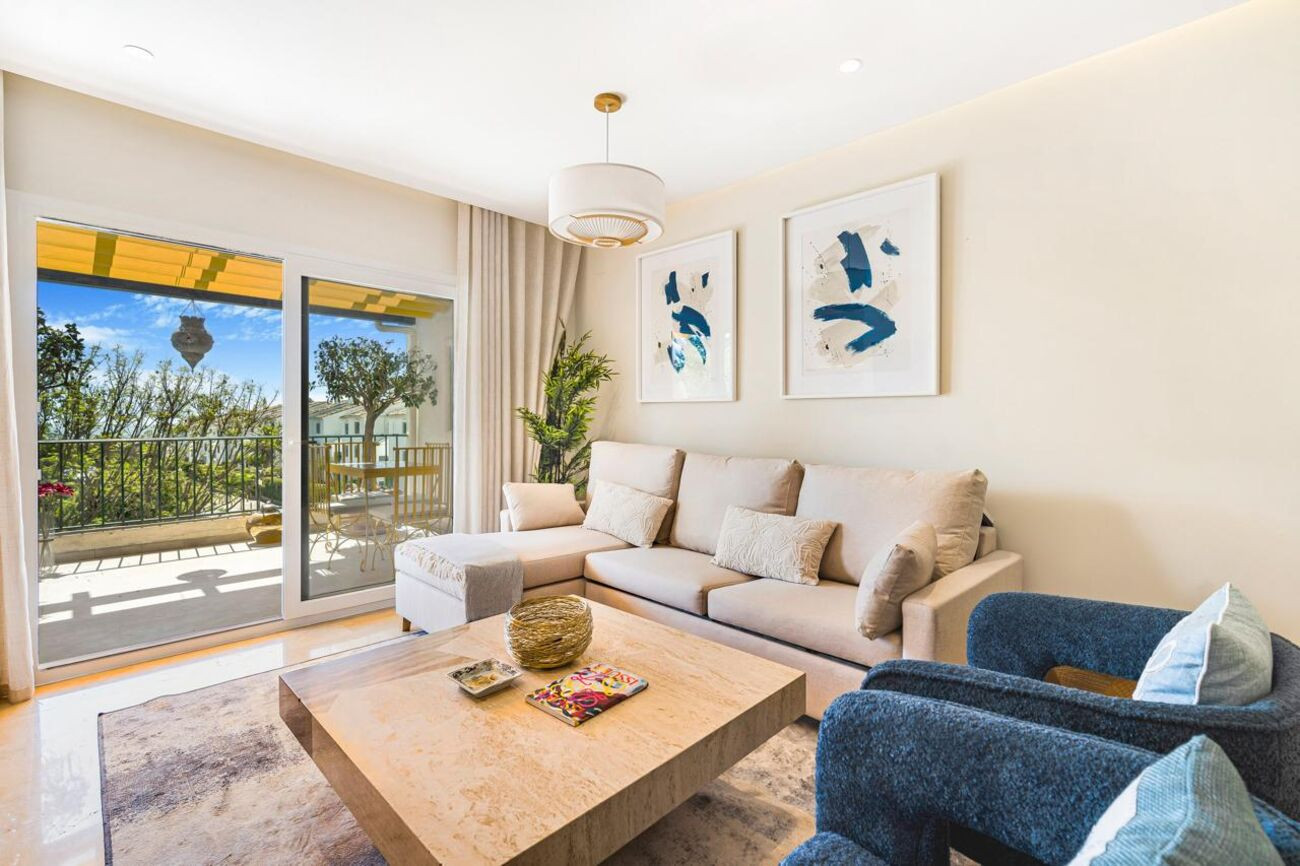 Velkommen til Casa Lucia! Denne 2-værelses rækkehus er beliggende i den attraktive Cerro Blanco-beboelse i Marbella, der kombinerer moderne design med middelhavsk charme. Ejendommen har et lyst stue møbleret med behagelige, neutralt farvede siddepladser, accentueret af blå stole og en moderne pejs for ekstra varme. Rummet går sømløst over i et spisested med et glaspladesbord og et stilfuldt loftslys.