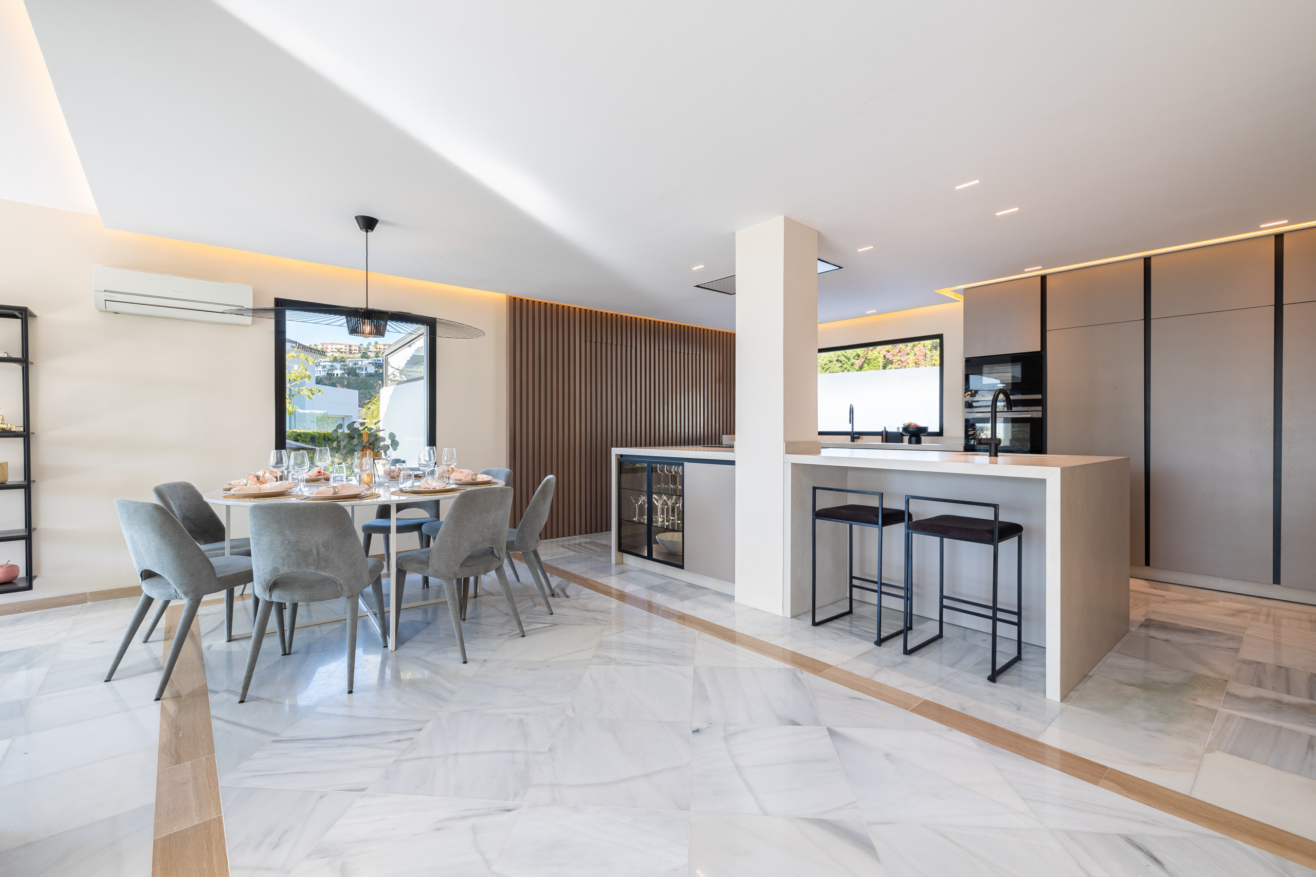 Designet med rene arkitektoniske linjer og gennemgående store glaspartier er villaen badet i naturligt lys og tilbyder en ubrudt indendørs-udendørs oplevelse. Det centrale opholdsrum er åbent og indbydende, og flyder ind i et fuldt udstyret moderne køkken og spiseområde - perfekt til afslapning eller underholdning i afdæmpet luksus.