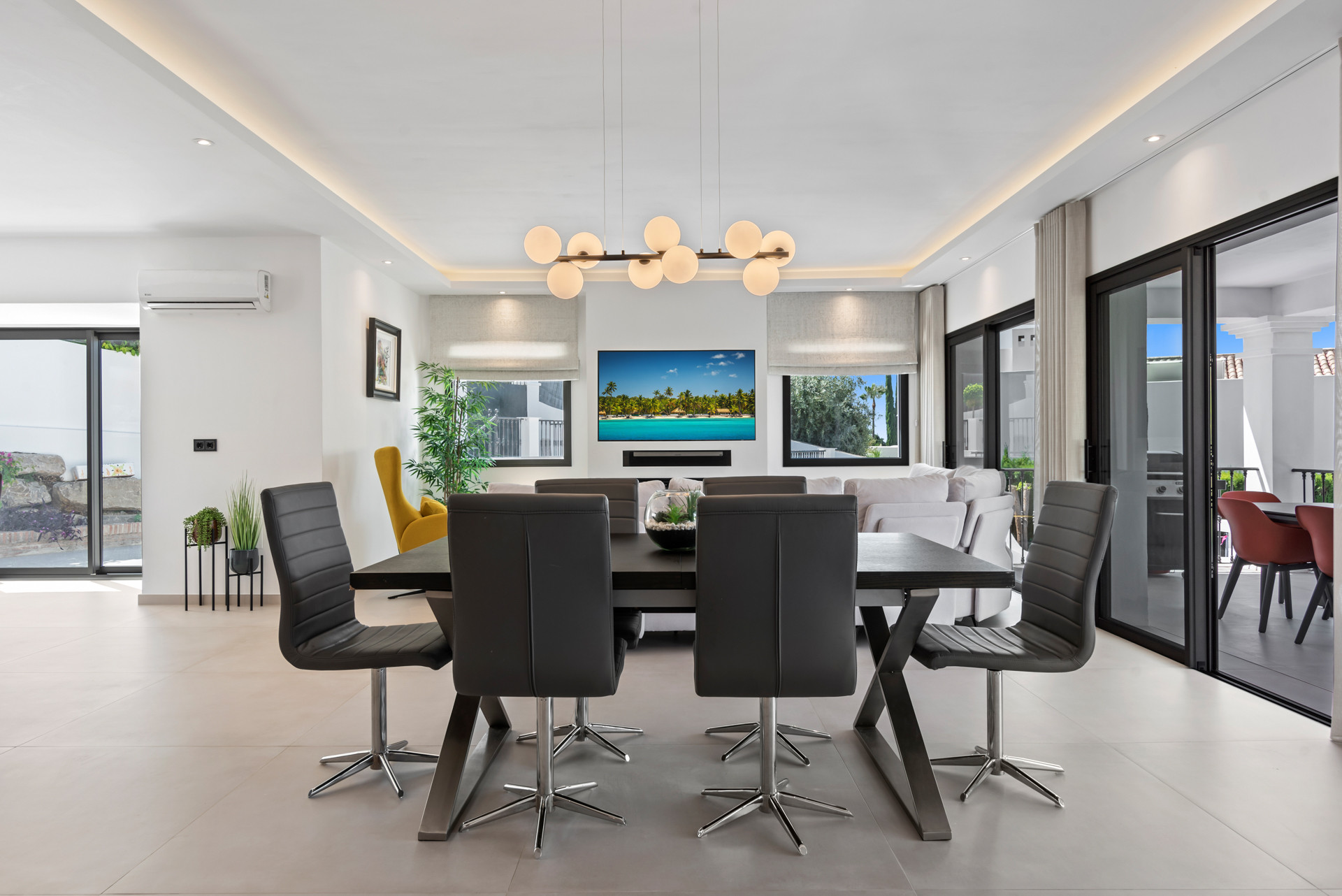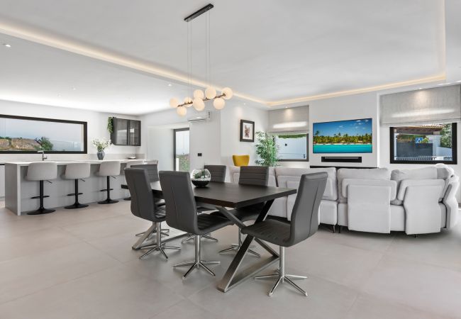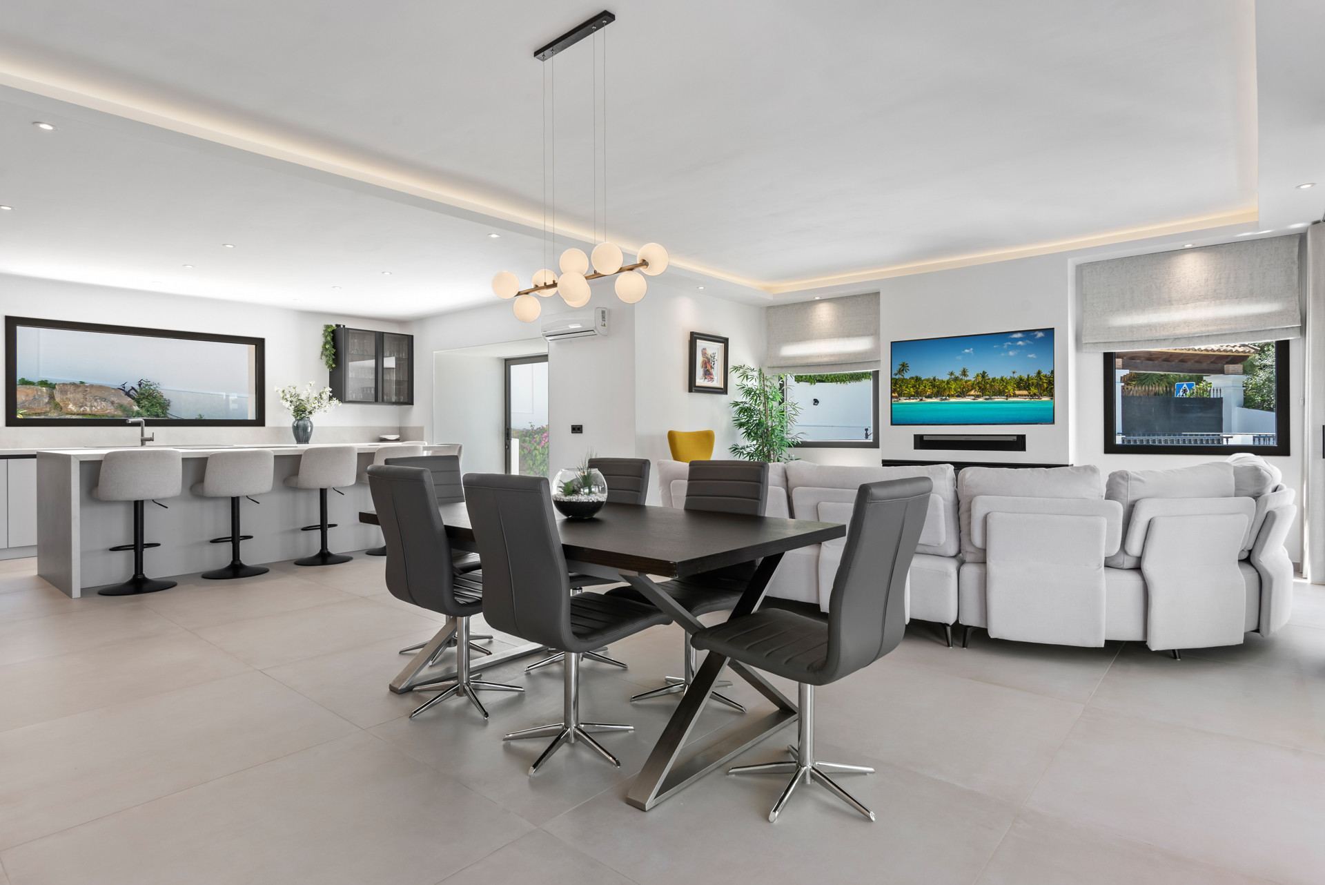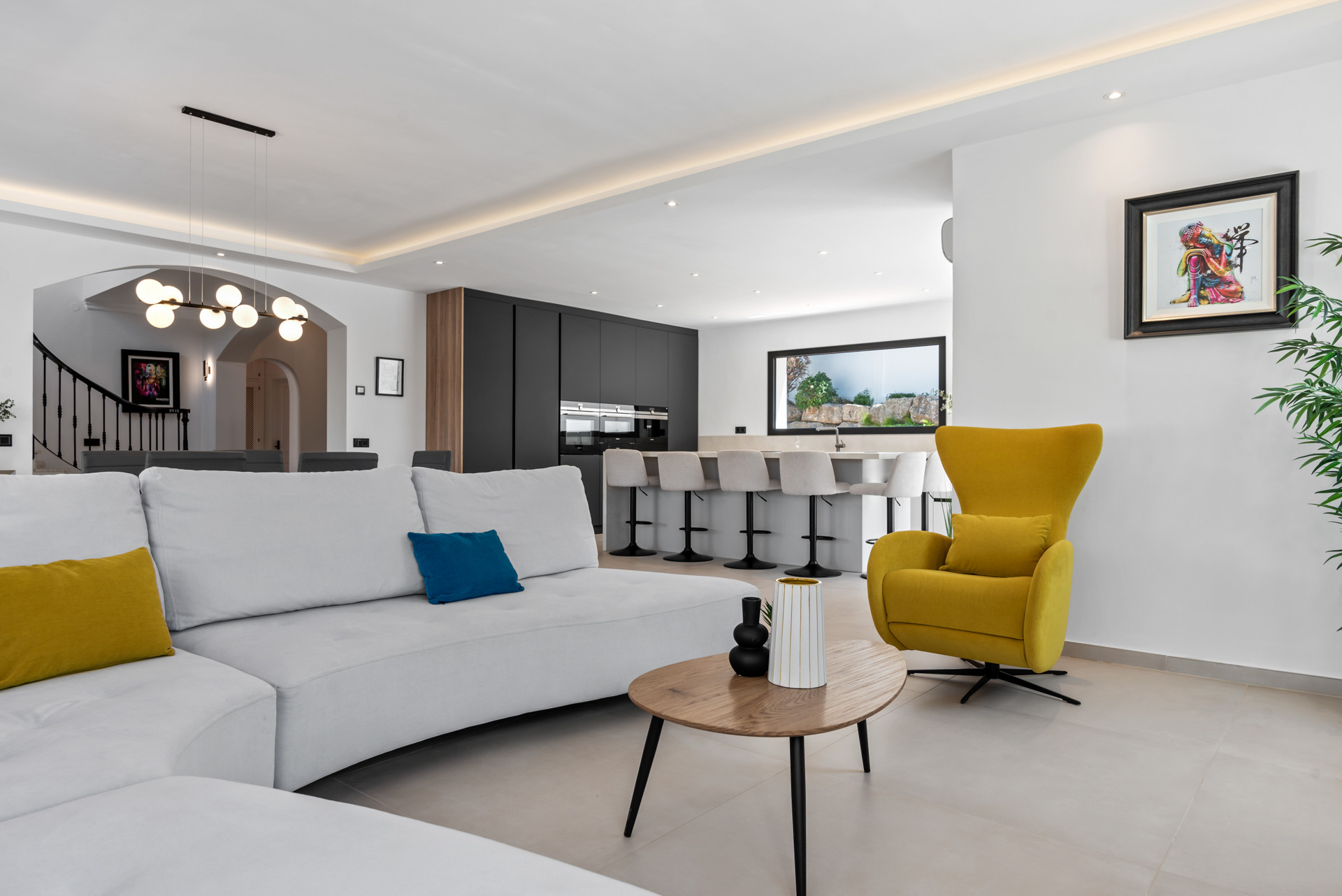 Et stort åbent planløsningsareal til ophold, spisning og køkken, kombineret med store vinduespartier, der åbner ud mod terrassen, hvor du finder en smuk pool og udendørsområde perfekt til afslapning. Den umiddelbare integration af indendørs og udendørs rum skaber en harmonisk strømning, ideel til at nyde det varme middelhavsklima.