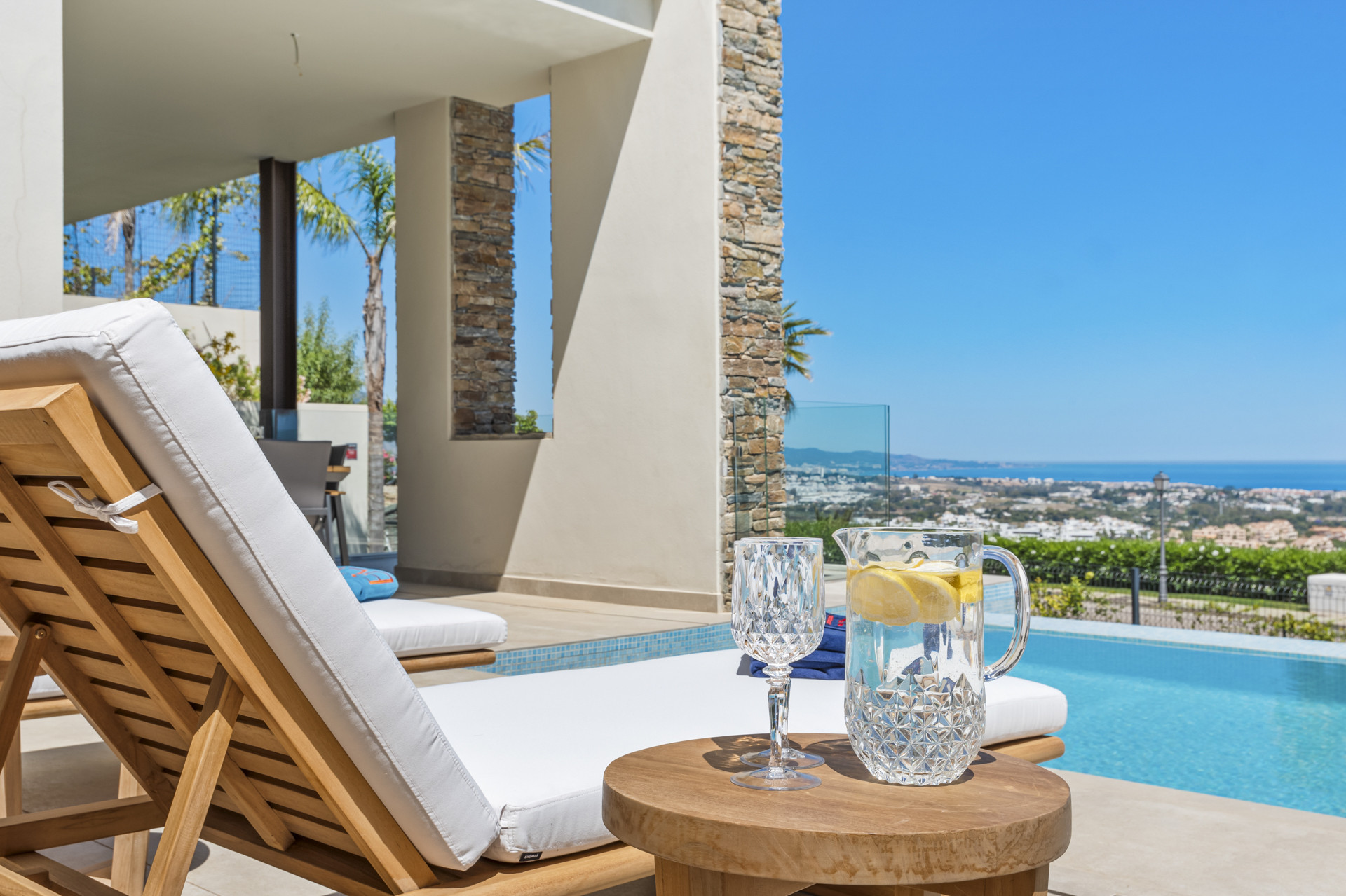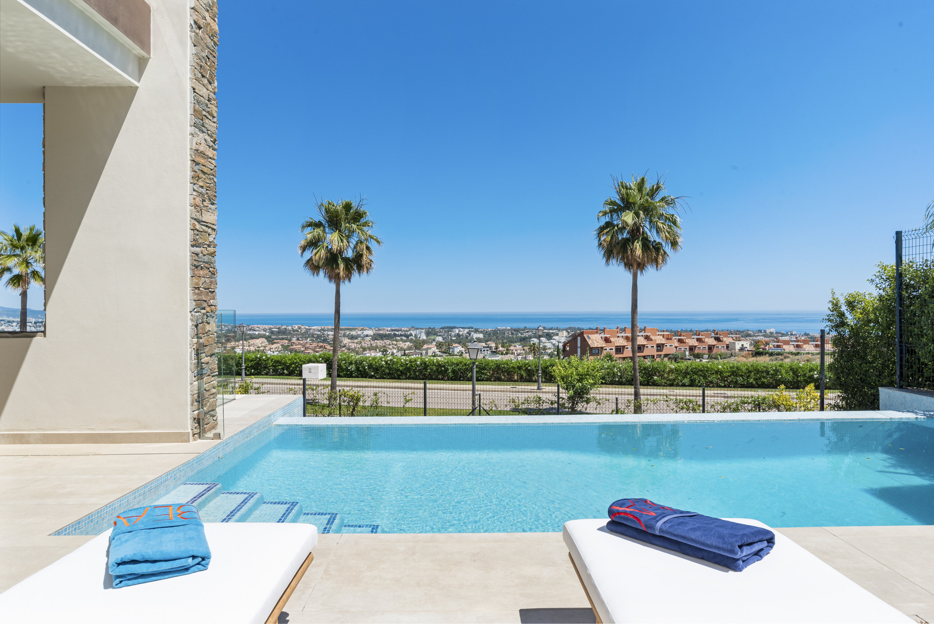 Villaen har 4 smukt designede soveværelser, hver med betagende havudsigt. Hovedsoveværelset og et andet soveværelse på nedre niveau har private badeværelser, mens de to resterende soveværelser på øverste etage deler et tredje badeværelse. Soveværelset på nedre niveau, med direkte adgang til terrassen, tilbyder et perfekt tilflugtssted for gæster, som kan træde ud og nyde morgenbrisen eller en aftenkøling ved poolen.