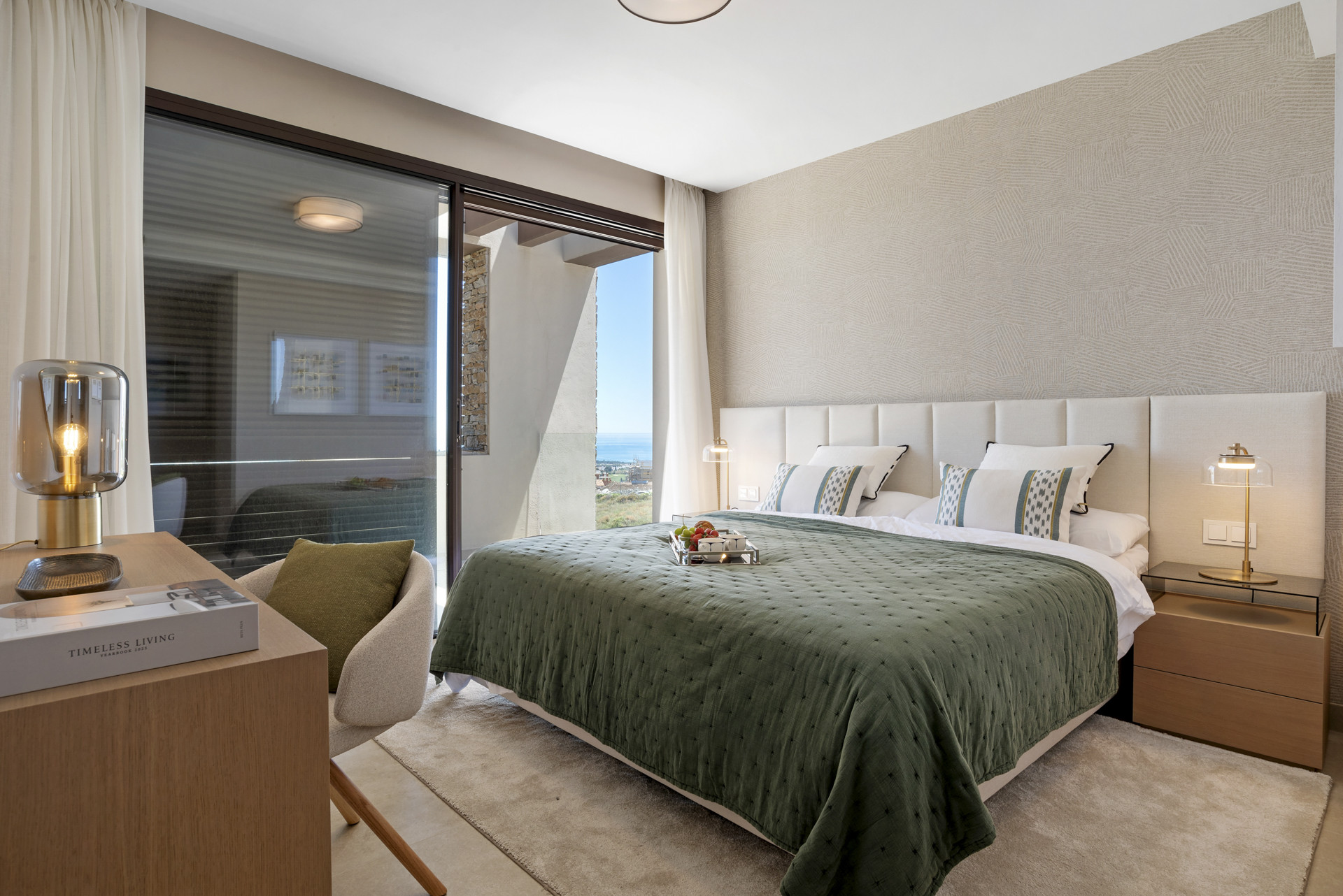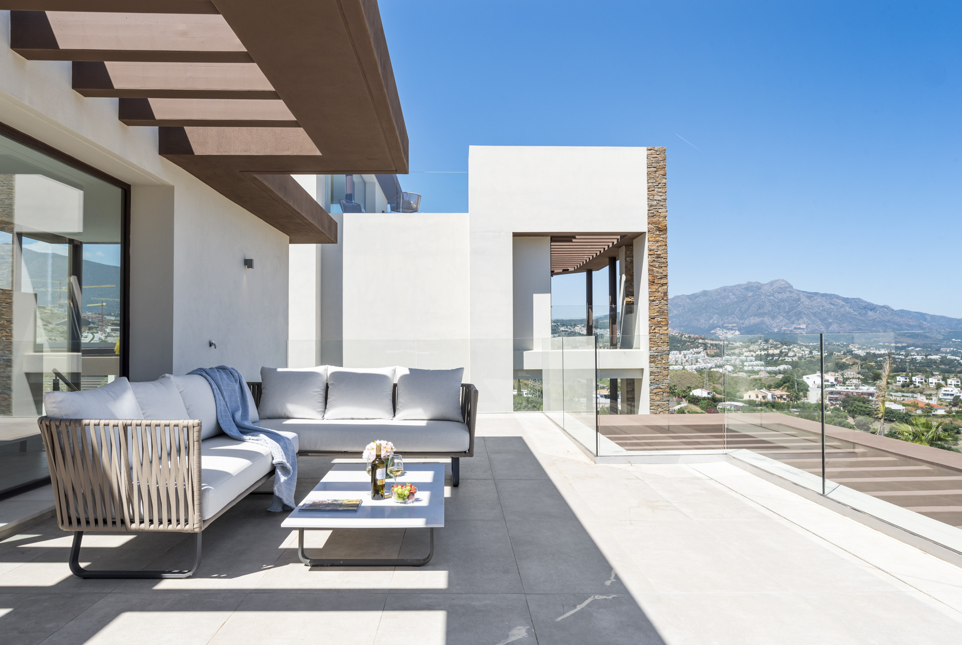 Villaens tagterrasse er et sandt højdepunkt: et afsondret fristed, hvor du kan slappe af med en drink, nyde udsigten og genetablere forbindelsen til naturen. Uanset om du ser solnedgangen eller nyder stille morgenovervejelser, er det et rum, der skaber balance i sjælen. Overalt er interiøret elegant indrettet med beroligende neutrale nuancer og moderne detaljer, som fremhæver følelsen af fred og komfort.