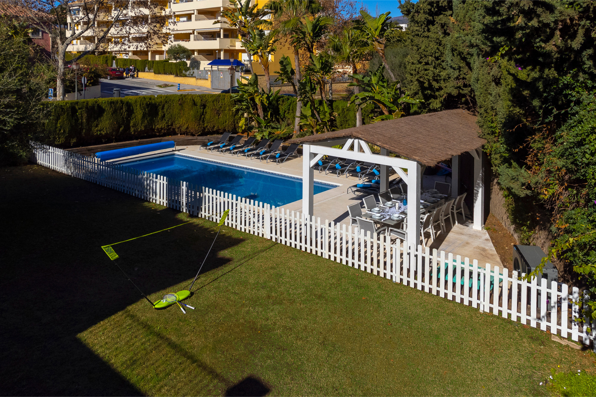 Tilbyder have, terrassemøbler, indhegnet grund, terrasse 50 m², vaskemaskine, tørretumbler, grill, strygejern, internet (wifi), hårtørrer, altan, alarm, centralvarme, aircondition, swimming pool privat, conditionned swimming pool privat, utildækket parkering til den samme bygning, 4 Fjernsyn.