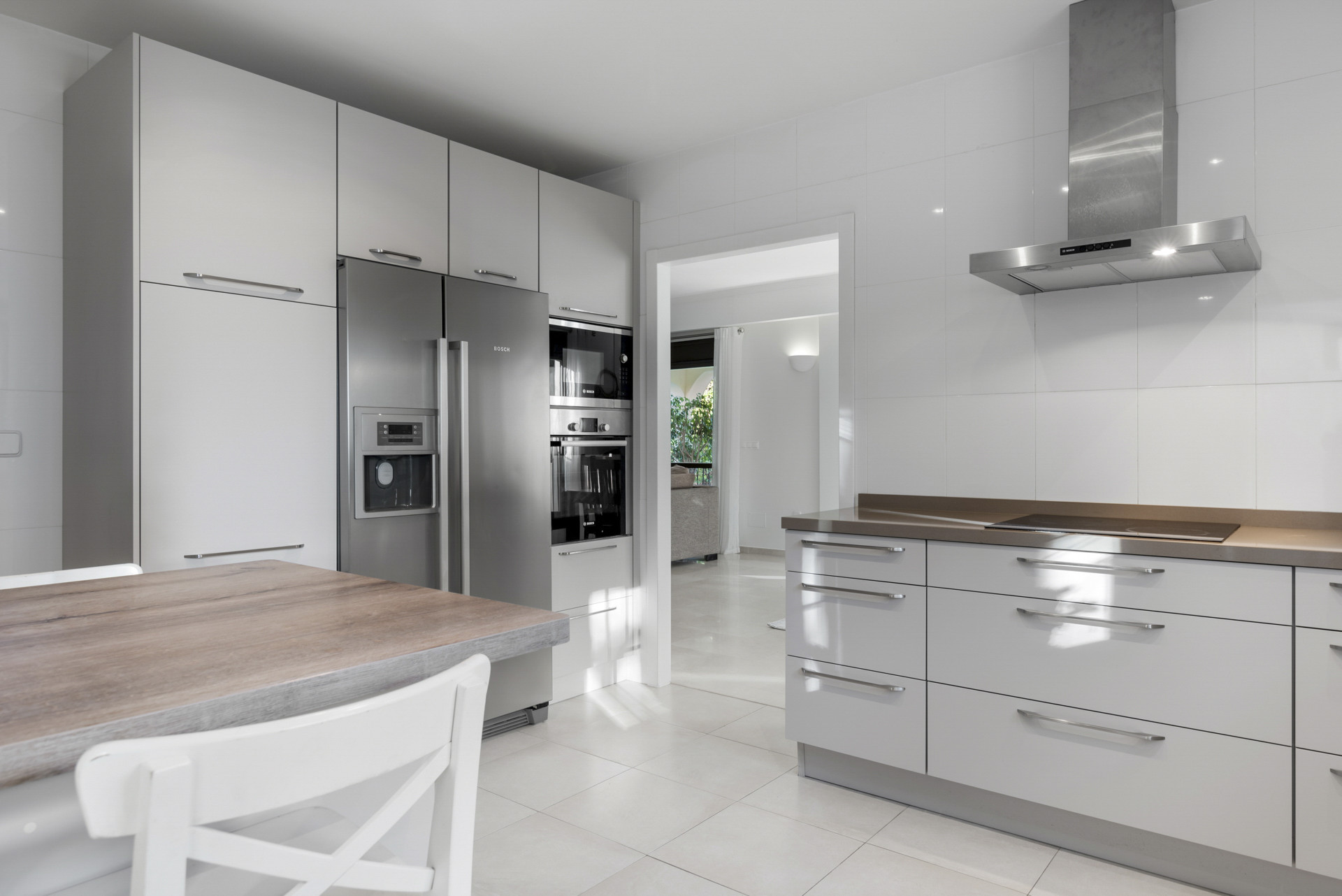 Fra køkkenområdet er der direkte adgang til den udendørs terrasse og poolområde.