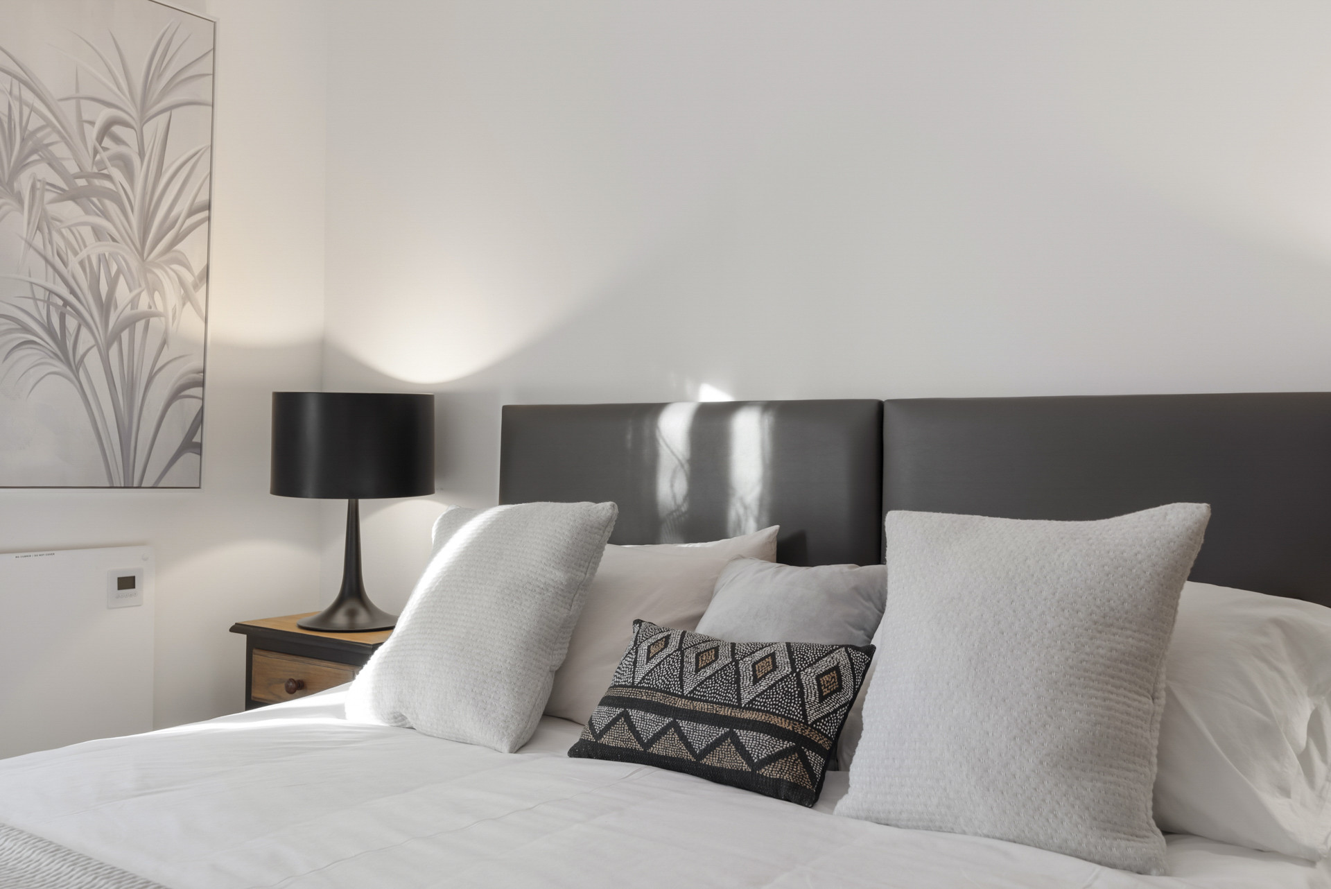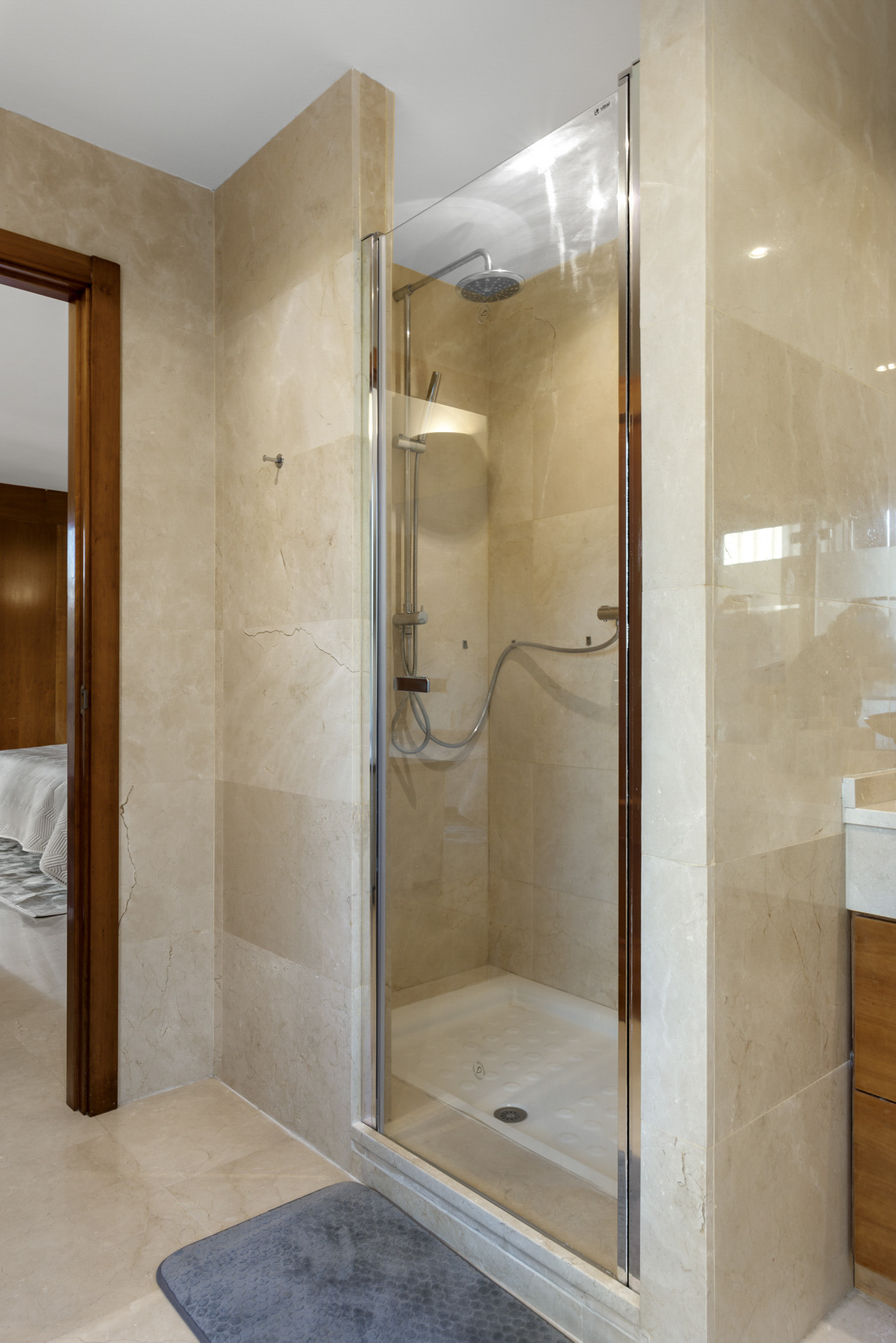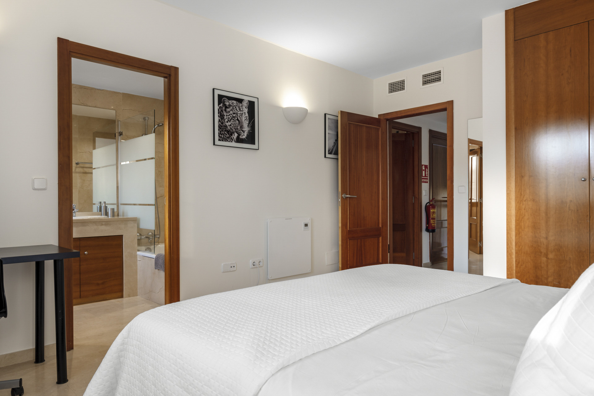 Soveværelset er rummeligt med et fantastisk tilhørende badeværelse og walk-in-garderobe med udsigt over poolområdet. I alt er der 5 soveværelser. Et andet soveværelse med tilhørende badeværelse er placeret i kælderområdet med direkte adgang til poolområdet.