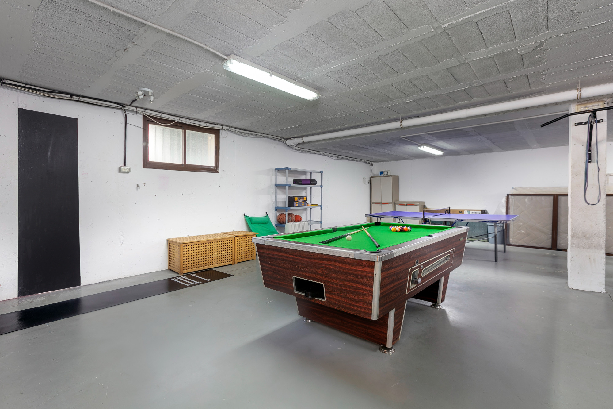 Opholdsarealet er åbent, hvor du finder - på indgangsniveauet til højre - det indendørs spiseområde til 12 personer og også vaskerummet med vaskemaskine og tørretumbler. Stuen, køkkenet og rekreationsområdet ligger et niveau længere nede. Det er her, du også kan finde et poolbord.
