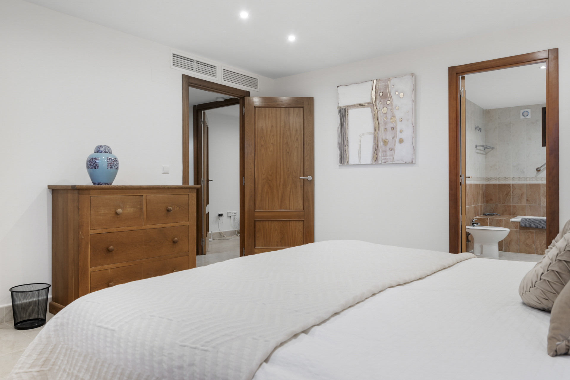 Alle 5 soveværelser har eget badeværelse og er placeret godt adskilt for fuld privatliv. To soveværelser er placeret direkte til højre for indgangen. Når du fortsætter gennem gangen, er et andet soveværelse med et tilhørende badeværelse placeret til venstre for indgangen.