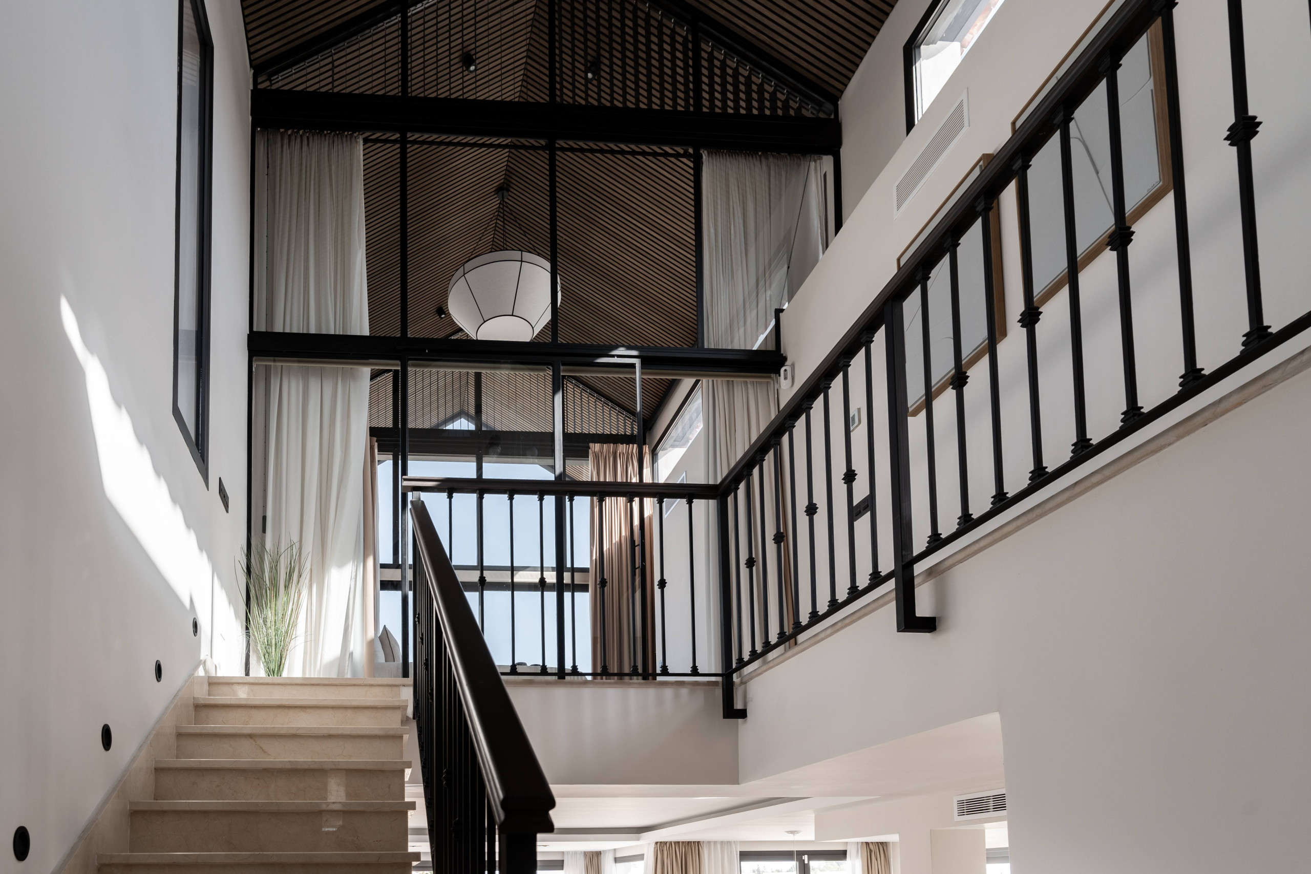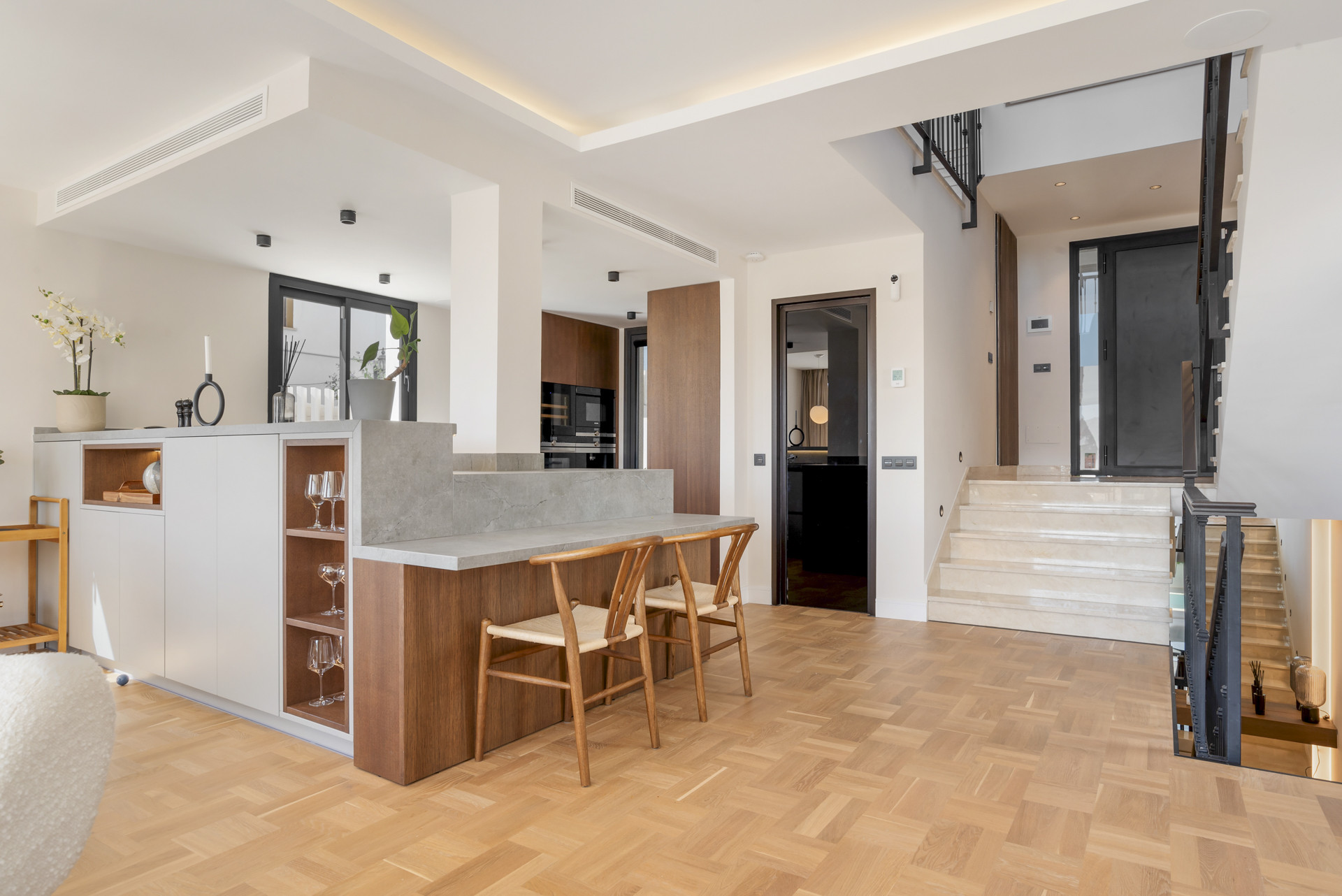 Spredt ud over flere etager har boligen et lyst åben-plan layout med vinduer fra gulv til loft, moderne møbler og elegant design overalt. Hvert soveværelse er smukt indrettet, med tilhørende badeværelser og omhyggeligt udvalgt dekoration, der balancerer afslapning med stil. Det centrale opholdsrum åbner direkte ud til haven og poolterrassen, mens et separat TV-rum og en rolig arbejdsplads tilbyder fleksibilitet til arbejde eller afslapning.