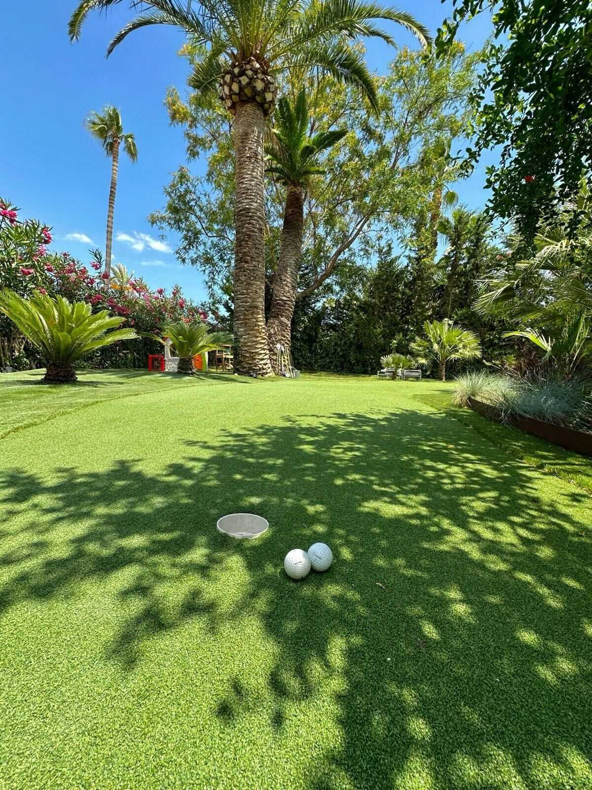 Gå udenfor for at opdage en smukt anlagt have og et indbydende poolområde, komplet med liggestole og rolige opholdszoner, der gør udendørs liv til en daglig glæde. Villaen byder også på en privat putting green og et børnelegområde - perfekt for familier eller golfentusiaster, der ønsker at holde sig aktive og underholdt under den andalusiske sol.