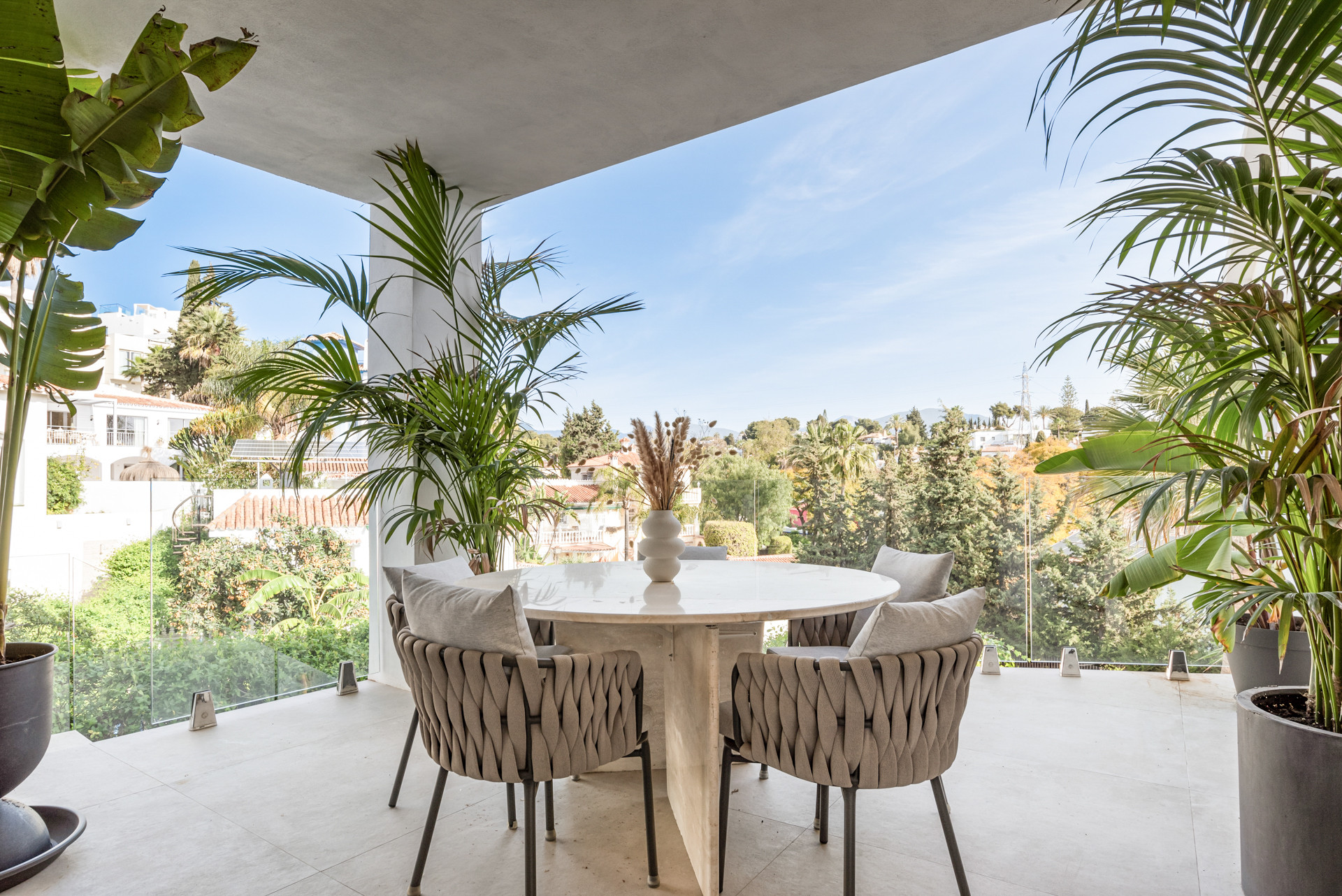 Hver af de fem rummelige soveværelser har eget badeværelse, hvilket sikrer privatliv og komfort for hver gæst. Det åbne opholdsområde er lyst og luftigt og fører til et elegant, fuldt udstyret køkken og en raffineret spiseplads. Gulv-til-loft-vinduer indrammer betagende udsigter og åbner ud til villaens omfattende terrasse og smukt anlagte have. Udendørs indtager en fantastisk privat pool hovedrollen, omgivet af solsenge, et stilfuldt hjørne med bålsted og frodig grønne planter - perfekt til at nyde Marbellas sol eller tilbringe en aften under stjernerne.