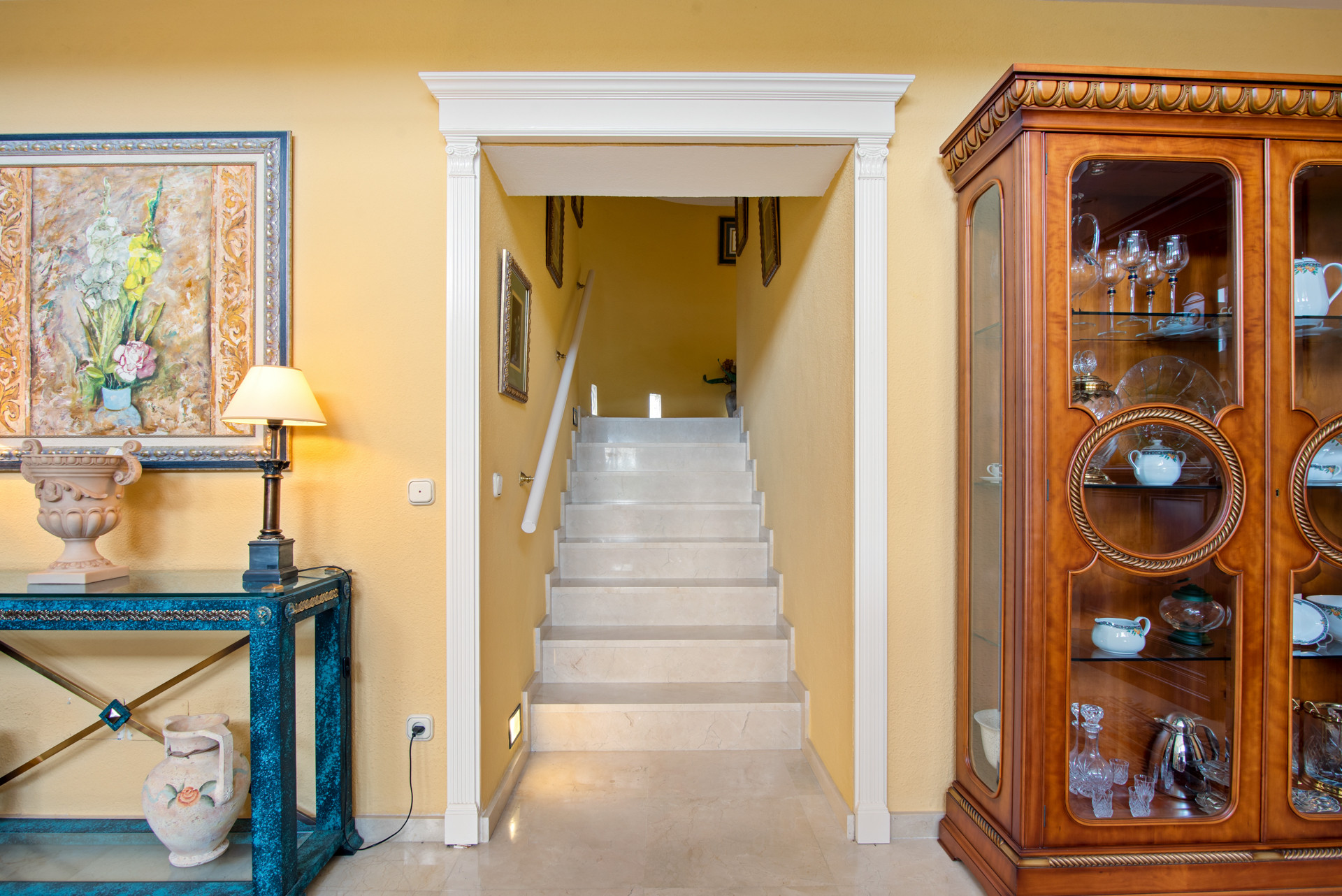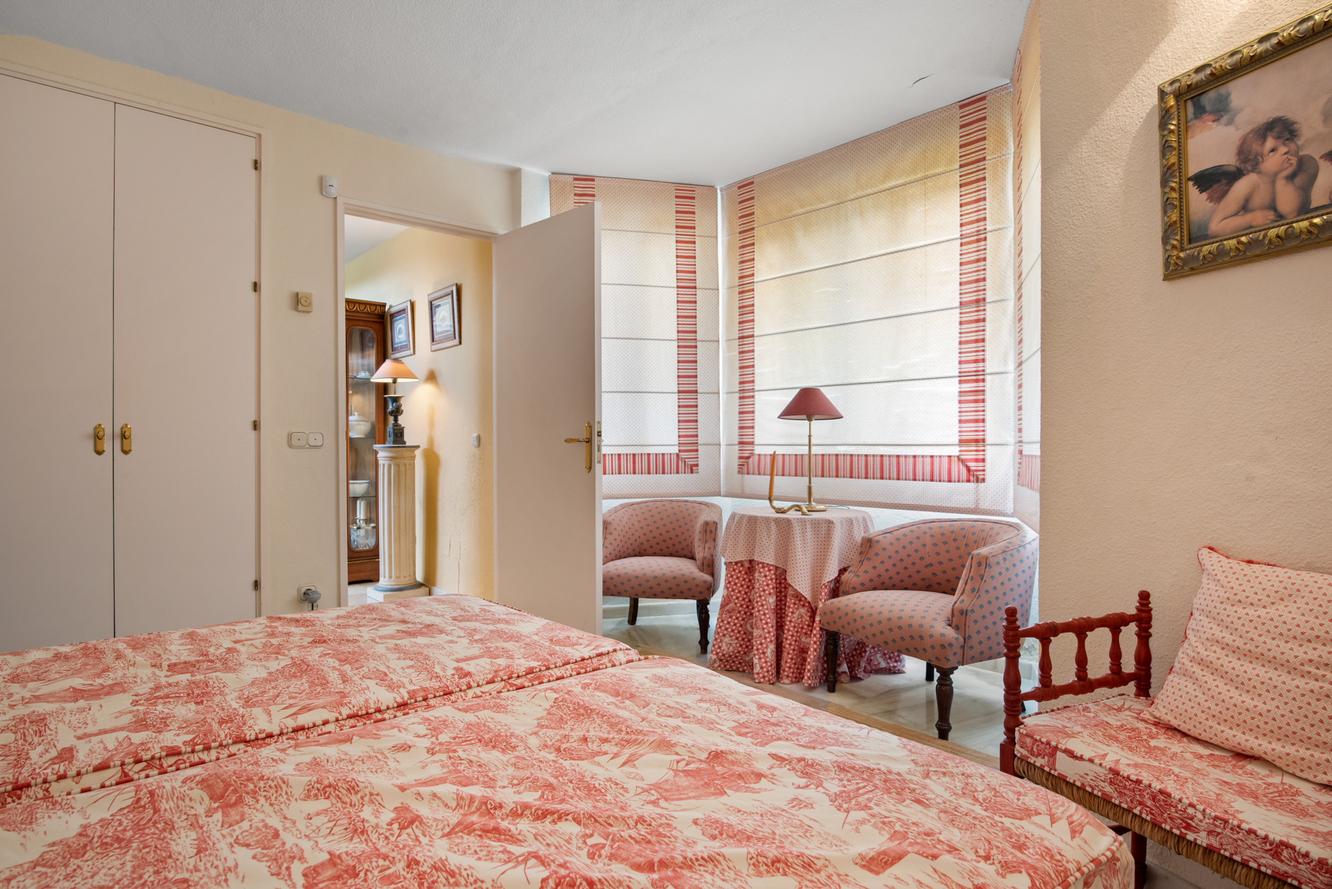 Indvendigt har villaen klassiske designelementer som buede døråbninger, terrakottaoverflader og strukturerede vægge, alt sammen suppleret med smagfulde moderne opdateringer. Det åbne opholdsrum forbinder sig med et fuldt udstyret køkken og en uformel spiseplads, hvilket skaber en varm og indbydende strømning til afslapning eller underholdning. Hver af de fire soveværelser er lyse og rummelige, med tre veludstyrede badeværelser, der kombinerer rustikke detaljer med komfort.