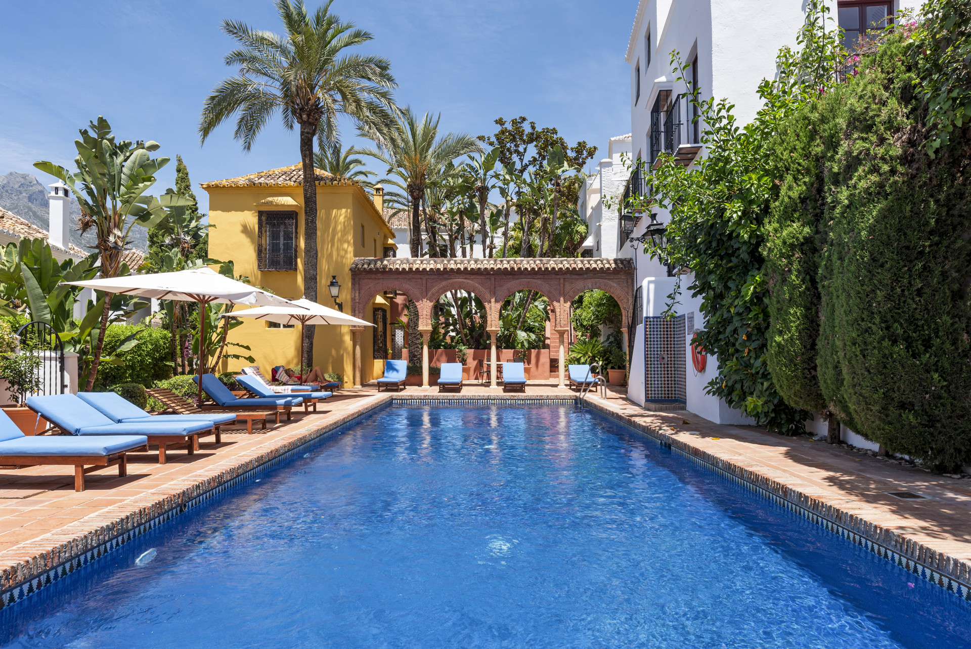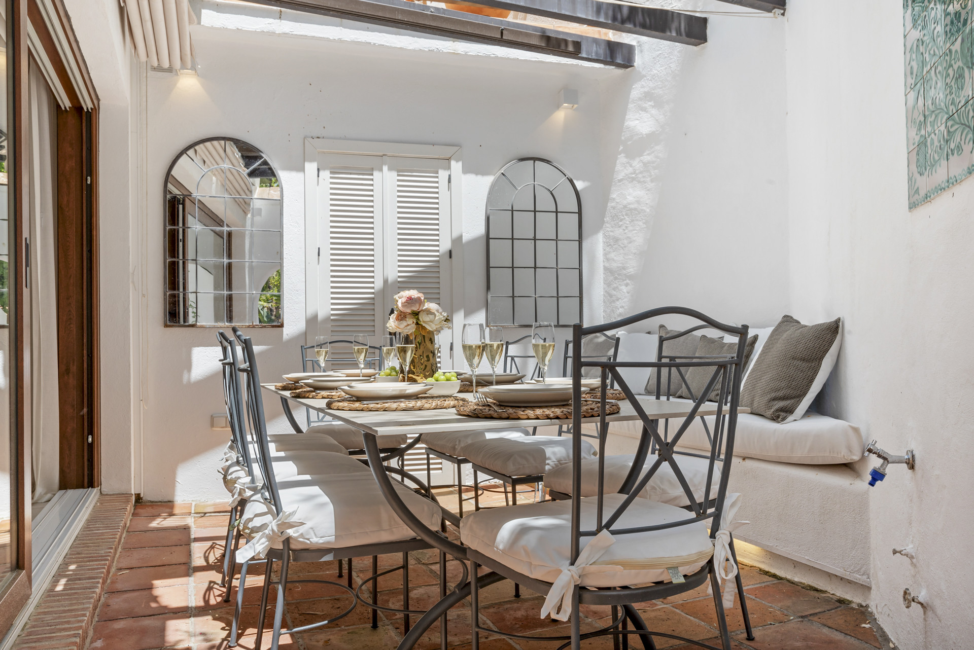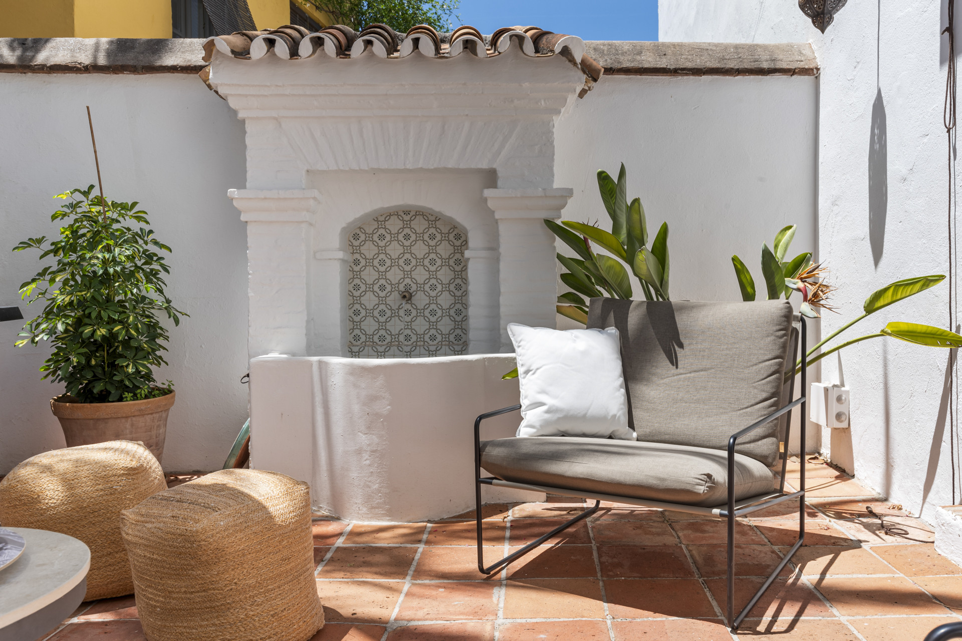 Willkommen in unserem Lomas de Marbella Club Townhouse! Gelegen im begehrten Lomas de Marbella Club an der prestigeträchtigen Golden Mile, bietet dieses wunderschön renovierte 2-Schlafzimmer-Reihenhaus mit 2 Badezimmern eine einzigartige Mischung aus zeitgenössischem skandinavischem Design und authentischem spanischem Charme. Eingebettet in eine malerische andalusische Urbanisation mit weißgetünchten Fassaden und gepflegten Gemeinschaftsbereichen, genießt das Haus eine hervorragende Lage, nur 10 Gehminuten vom Strand und der lebhaften Dining- und Unterhaltungsszene von Puente Romano entfernt.