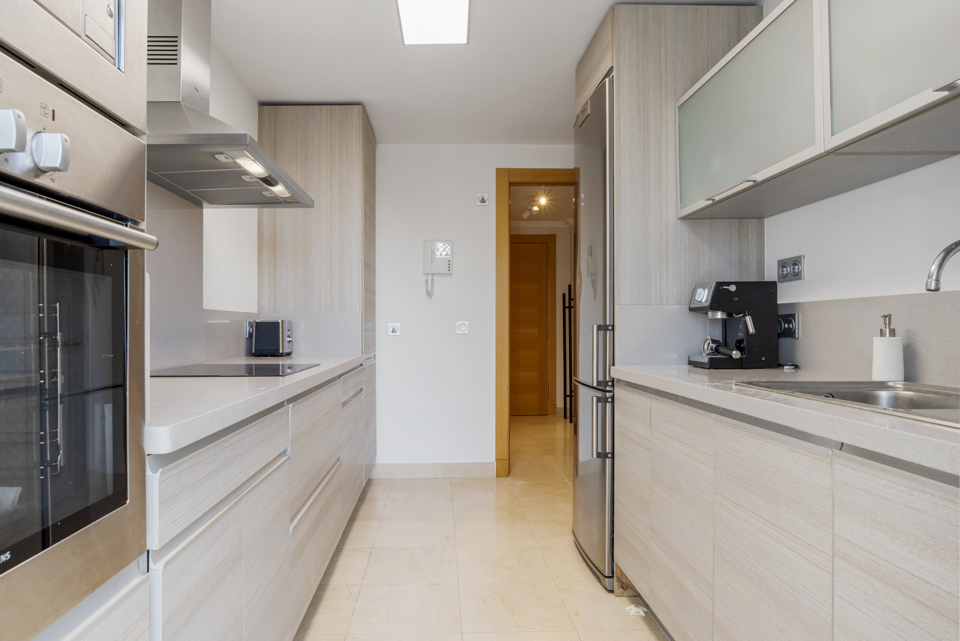 Die Wohnung bietet eine frische, voll ausgestattete Küche mit einem separaten Abstellraum. Der geräumige Wohnbereich ist geschmackvoll mit einem Esstisch, Stühlen und einem Sofa eingerichtet, sorgfältig positioniert, um die Aussicht jederzeit zu genießen. Es gibt auch einen Smart-TV und WLAN.