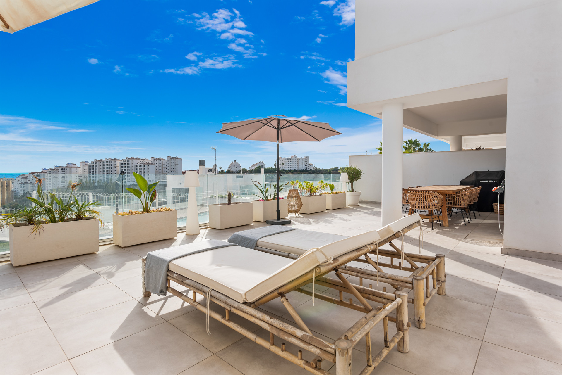 Willkommen in Casa Numa! Treten Sie ein in ein stilvolles Küstenleben mit diesem neu erbauten, wunderschön gestalteten Penthouse im Herzen von Estepona. Überflutet von natürlichem Licht verbindet der geräumige Grundriss mit offener Raumgestaltung modernen Komfort mit einer warmen, entspannten Atmosphäre - dank sanfter Töne, strukturierter Wände und natürlicher Holzakzente im gesamten Innenbereich. Der Wohnbereich öffnet sich direkt auf eine weitläufige Terrasse mit Panoramablick, der sich von den üppigen Padel-Plätzen unterhalb bis zum glitzernden Mittelmeer in der Ferne erstreckt.