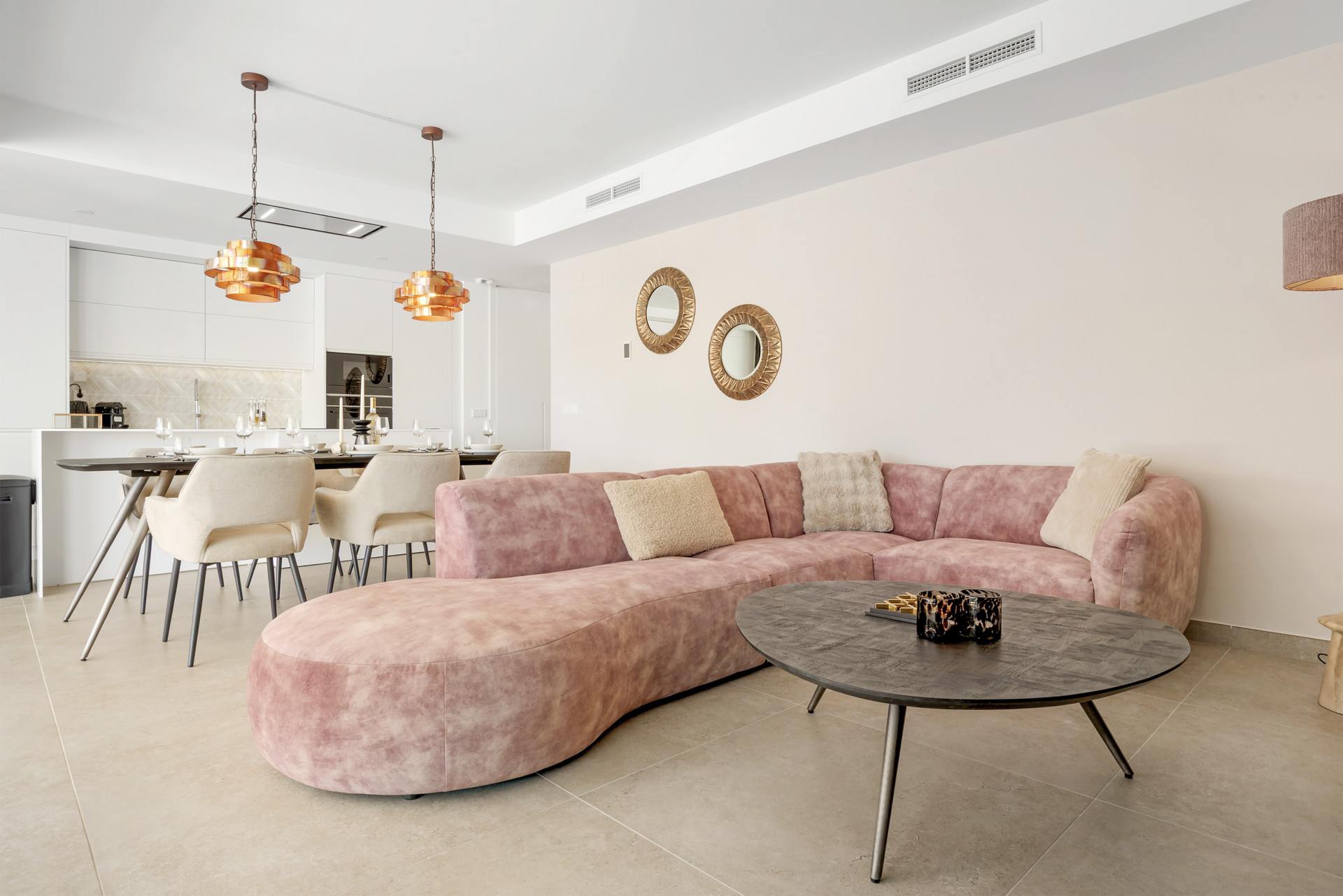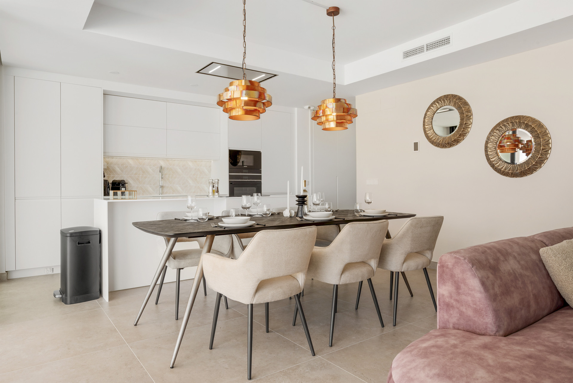 Auf 114 m² ist die Wohnung für müheloses Eleganz konzipiert. Der offene Wohnbereich verfügt über maßgefertigte Schreinerei, eine schlichte, vollausgestattete Küche und einen elektrischen Kamin, der eine warme und einladende Atmosphäre schafft. Ein zusätzlicher Bioethanol-Kamin auf der Terrasse ermöglicht es Ihnen, die Meeresbrise in gemütlicher Geborgenheit zu genießen, unabhängig von der Jahreszeit. Bodentiefe Glastüren rahmen die atemberaubenden Panoramaausblicke und verbinden das Innen- und Außenleben nahtlos.