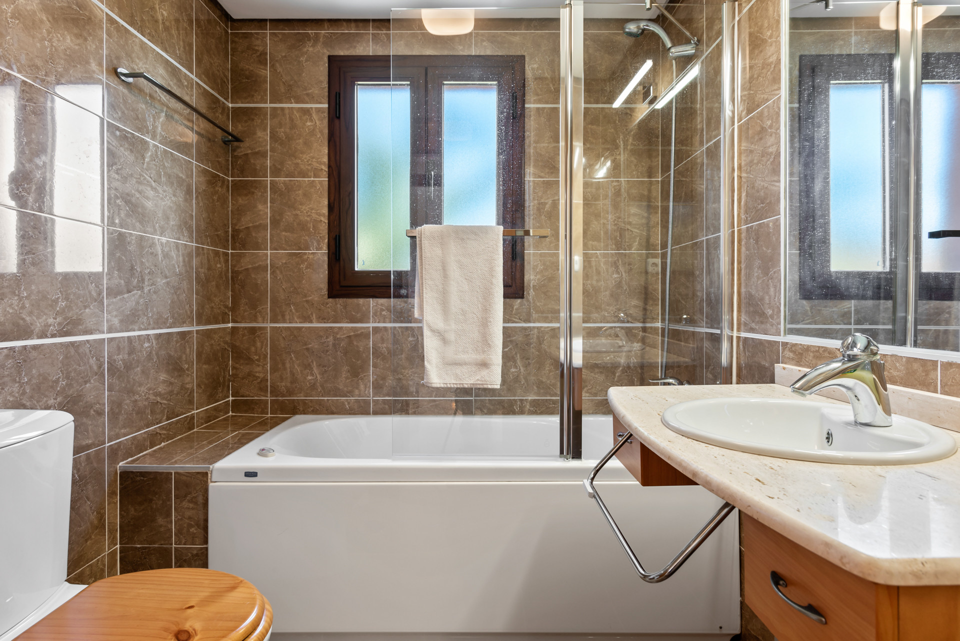 Die Unterkunft verfügt über Gartenmöbel, Terrasse 5 m², eine Waschmaschine, ein Bügeleisen/-brett, ein Internetanschluss (WLAN), ein Föhn, ein Balkon, ein Kinderbereich, ein Fitnessraum, ein SPA-Bereich, eine Zentralheizung, eine Klimaanlage, einen Gemeinschaftspool und ein Kinderbecken, eine Garage und Parkplatz auf dem Grundstück, 1 Fernseher.
