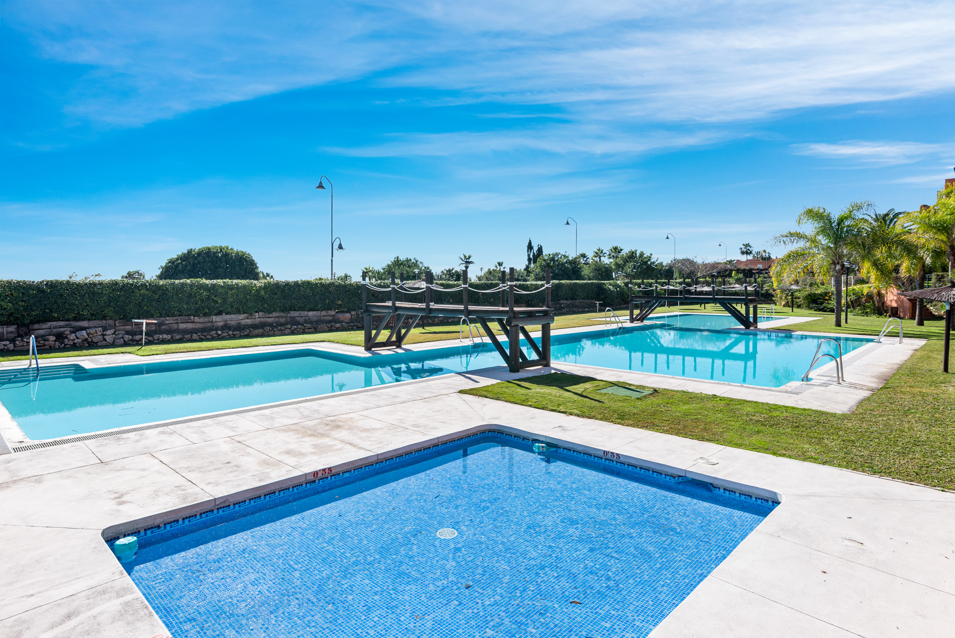 Außerhalb bietet die umzäunte Wohnanlage einen üppigen botanischen Garten, während das Highlight der spektakuläre 450 m² große Außenpool mit Salzwasser ist, der durch ein beheiztes Hallenbad ergänzt wird - perfekt für entspannende Schwimmen das ganze Jahr über.